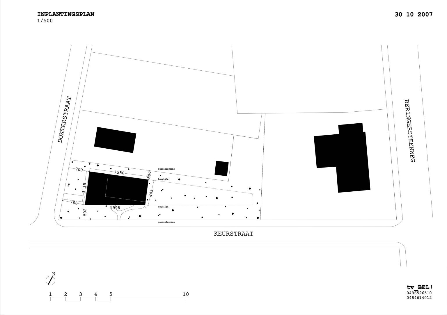 The new home is positioned at the corner of the site to take full advantage of the allowed building depth. The main volume and entrance face Keurstraat, allowing the home to be fully oriented toward the garden. The placement respects local zoning rules, with a 5-meter front setback from Keurstraat and 7 meters from Dokterstraat.