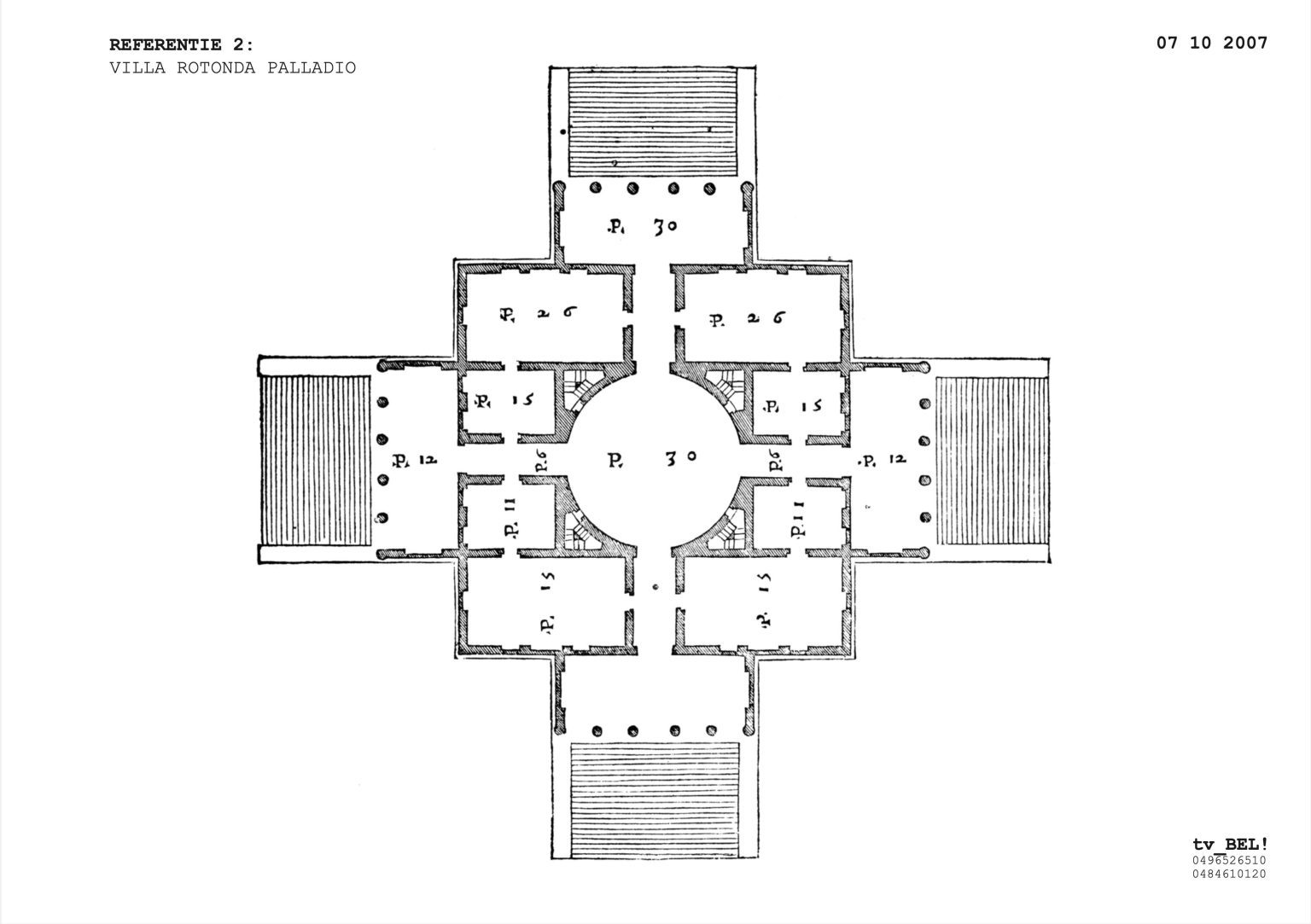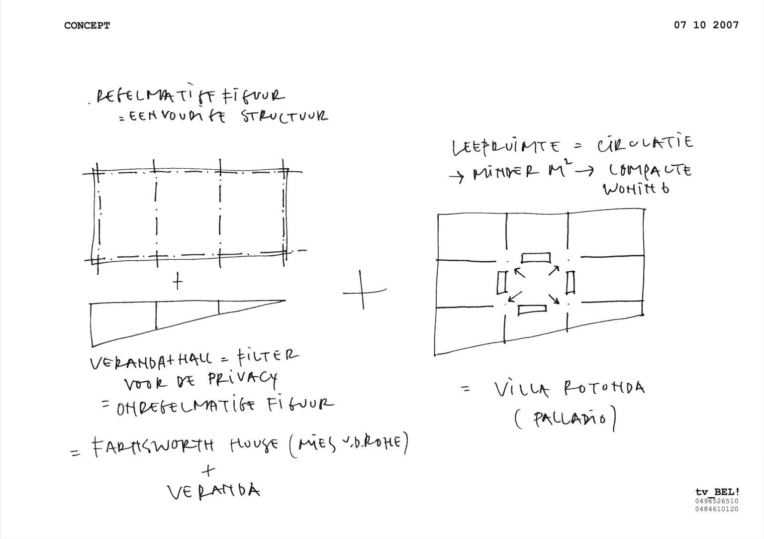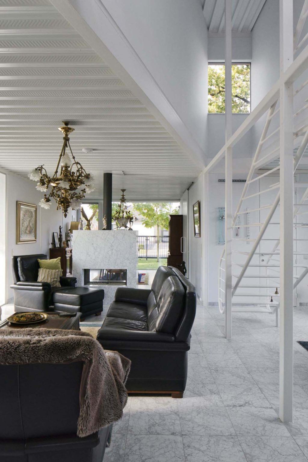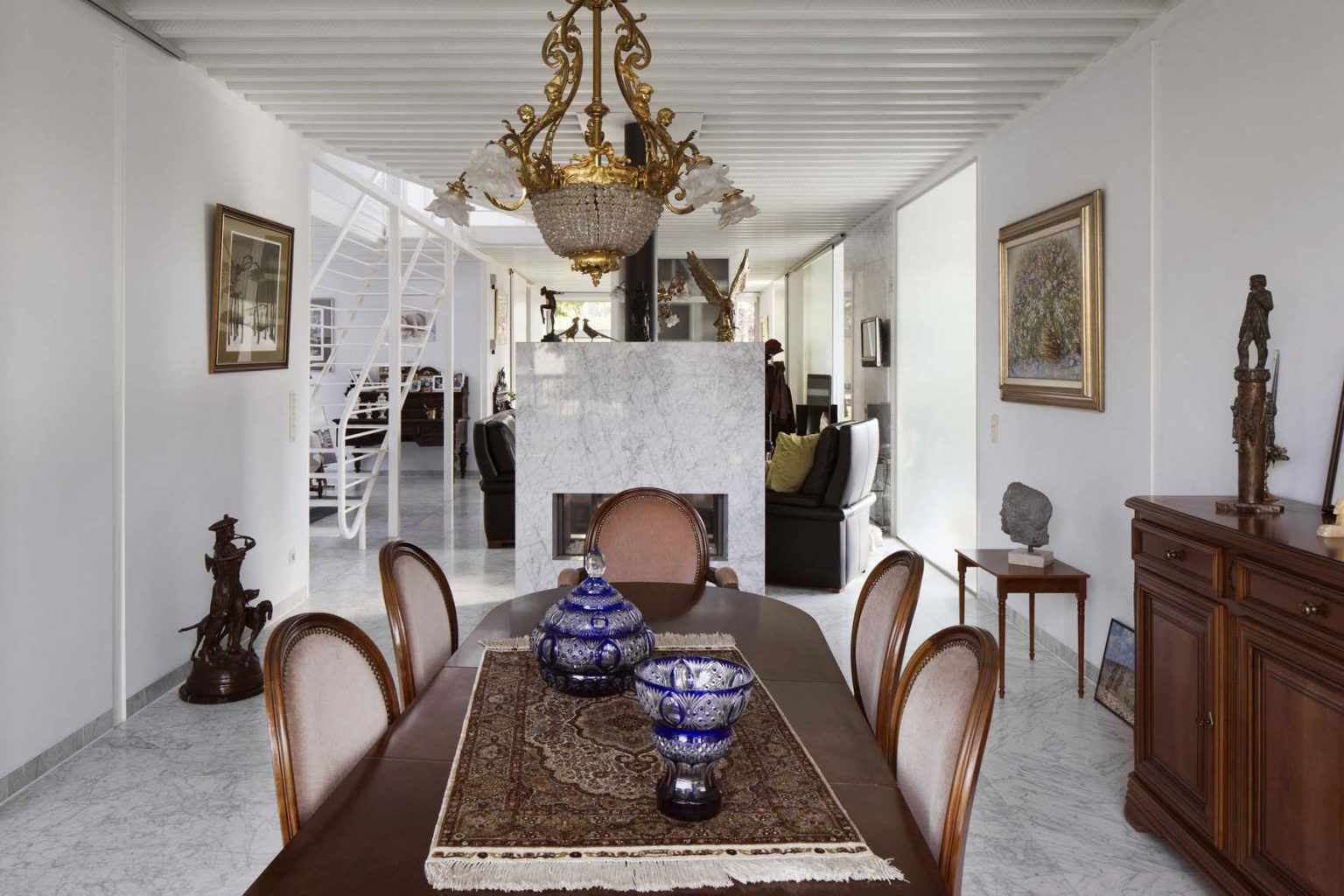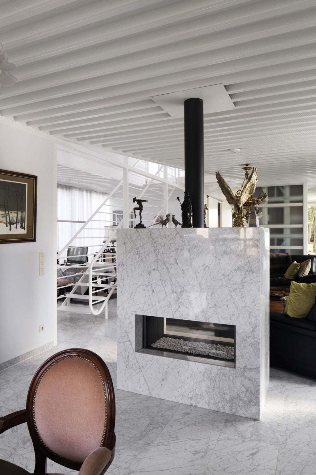 The ground floor plan is laid out in the shape of a Greek cross, inspired by a Palladian villa. It forms one large open space, with the living room at its center, and at the four ends: the entrance hall, a formal sitting room (“goei kamer”), the home office, and the dining room. The corners house the annexes, including the garage, utility rooms, office, and veranda. Fixed furniture elements—such as the cloakroom, gas fireplace, staircase, and elevator—help define the various living zones and add architectural scale. This layout ensures maximum privacy for the central living space and a compact circulation system, eliminating the need for corridors.
