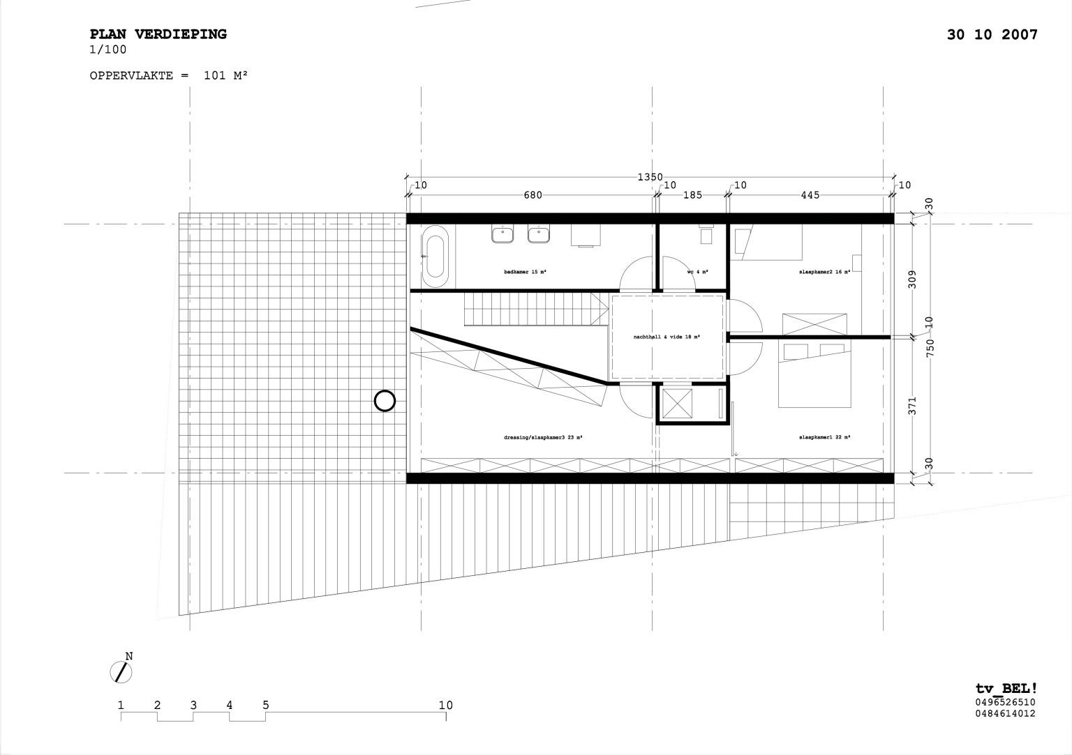 The upper floor, which contains the sleeping quarters, is accessed from the landing. A double-height space (void) around the staircase reflects the wedge shape of the plot and allows the late afternoon sun to penetrate deep into the living areas.