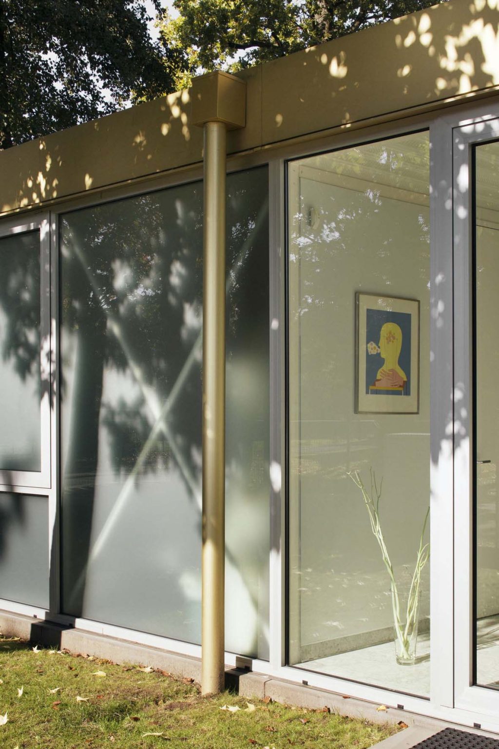 A wedge-shaped front volume, inserted between the street and the main structure, acts as a privacy filter. This volume includes a garage, entrance hall, and veranda, creating a buffer zone with a transitional microclimate. Placing private living spaces away from this street-facing area helps mitigate privacy concerns. The garage, in particular, blocks direct views into the living areas from the street.