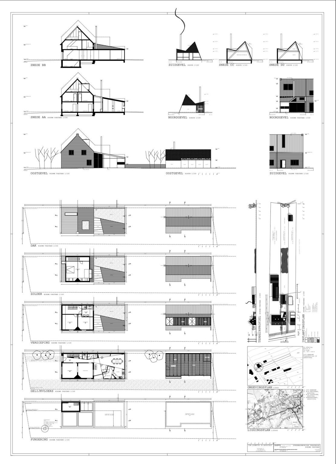 The kitchen and pantry are strategically placed in the corner. This allows them to benefit from maximum natural light and garden views, while simultaneously providing privacy from the street, the access lane, and the neighbors. The sitting area with a stove thereby gains a more intimate character. Adjacent to the kitchen is the dining area, with a large sliding door facing the garden.