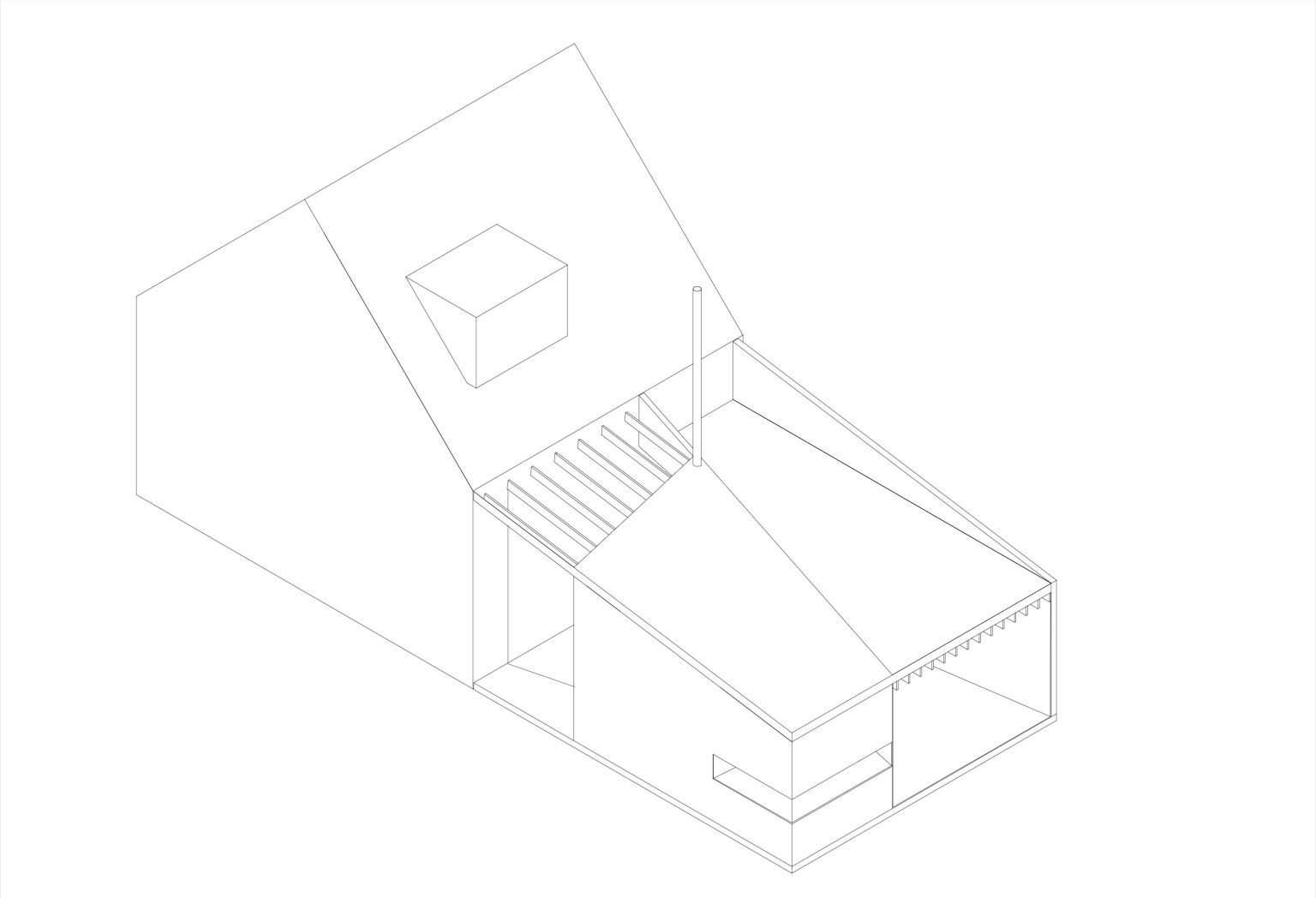 Finally, a wedge-shaped wall of built-in cabinets weaves the old and new parts together into a coherent whole. It contains access to the basement, the toilet, the boiler room, a buffet cabinet, and a bookshelf.