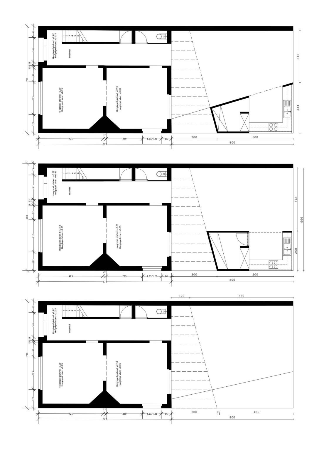 On the ground floor, a new lightweight timber-frame extension will connect directly to the existing main volume. It will extend the house to the maximum building depth of 17 meters. The existing cornice height of 4 meters is respected, and the new sloping roof will seamlessly connect to the neighboring house, with a minimum building height of 2.85 meters in the garden. In this way, the extension remains fully within the legal building envelope.