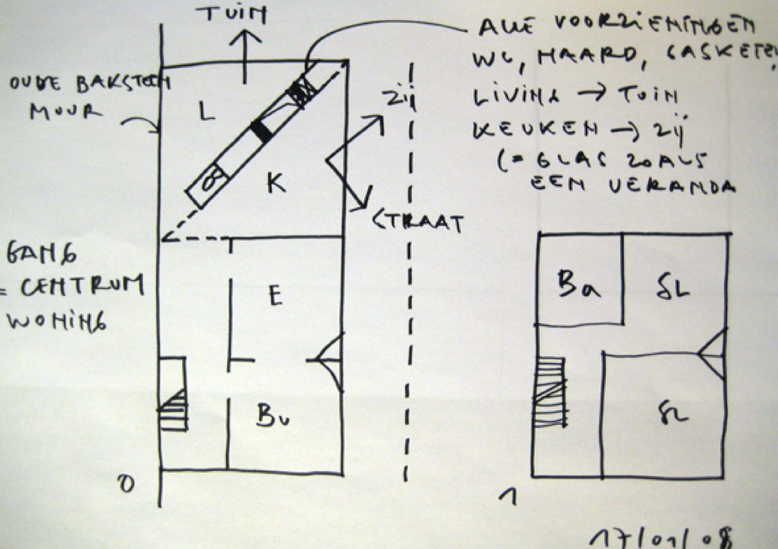 The decision has been made to remove the entire cluster of outbuildings at the rear of the house. The main volume (a terraced house with a gabled roof) will be completely renovated. The attic space will be fitted with two new openings: a new dormer window on the garden side will provide a view of the garden and ensure effective ventilation of the new bedroom; a new skylight on the street side will allow in the low evening sun, even into the stairwell.