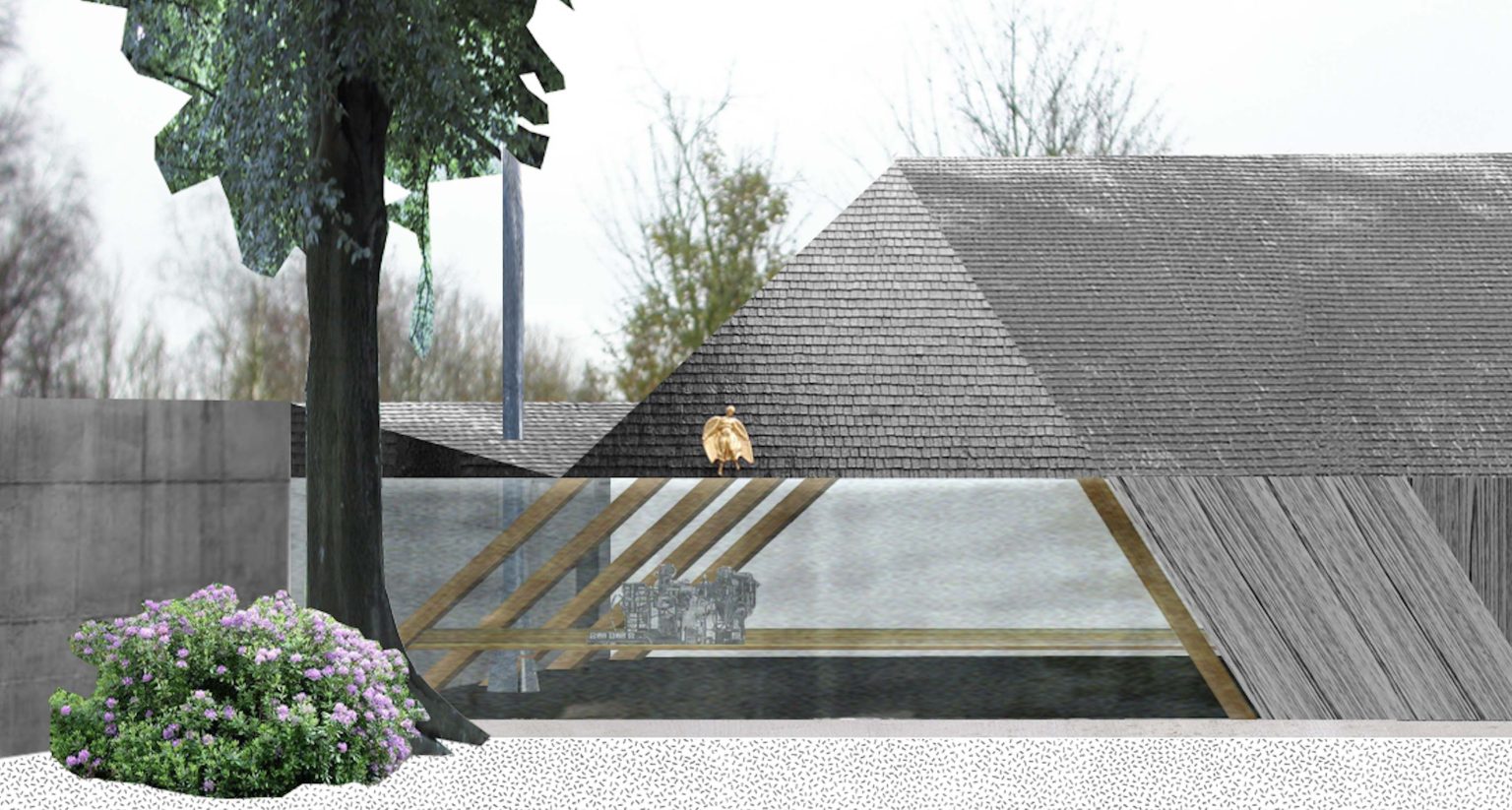 Its ingenious cross-section reduces its height relative to the existing surroundings. The shed is constructed entirely from locally sourced timber trusses and clad in dark synthetic slates. Four wide sliding doors provide access from the drive, minimizing maneuvering with agricultural equipment. The first bay is fitted out as a covered workshop in line with the garden—a winter garden with a wood stove, complementing the kitchen on the opposite side.