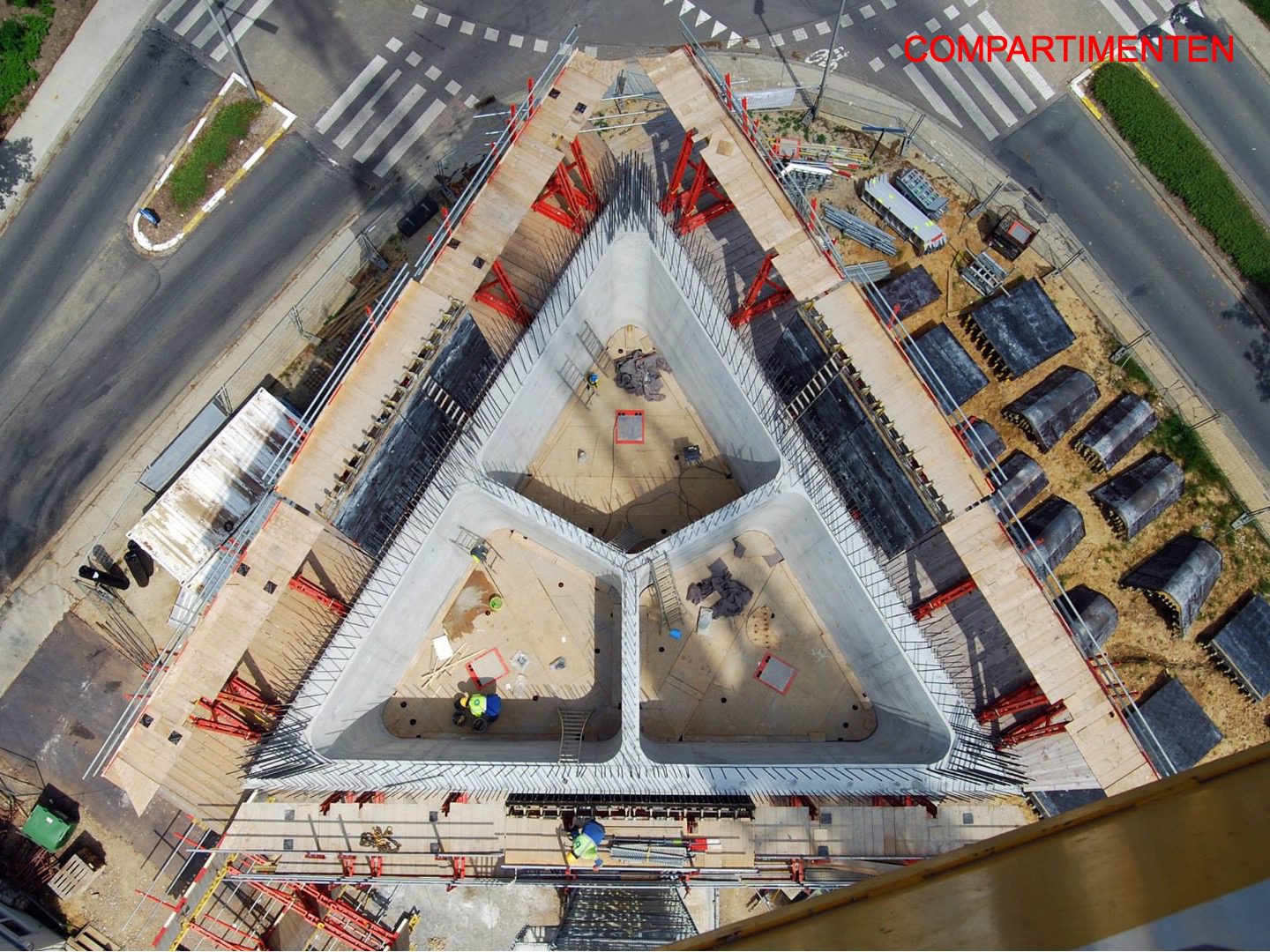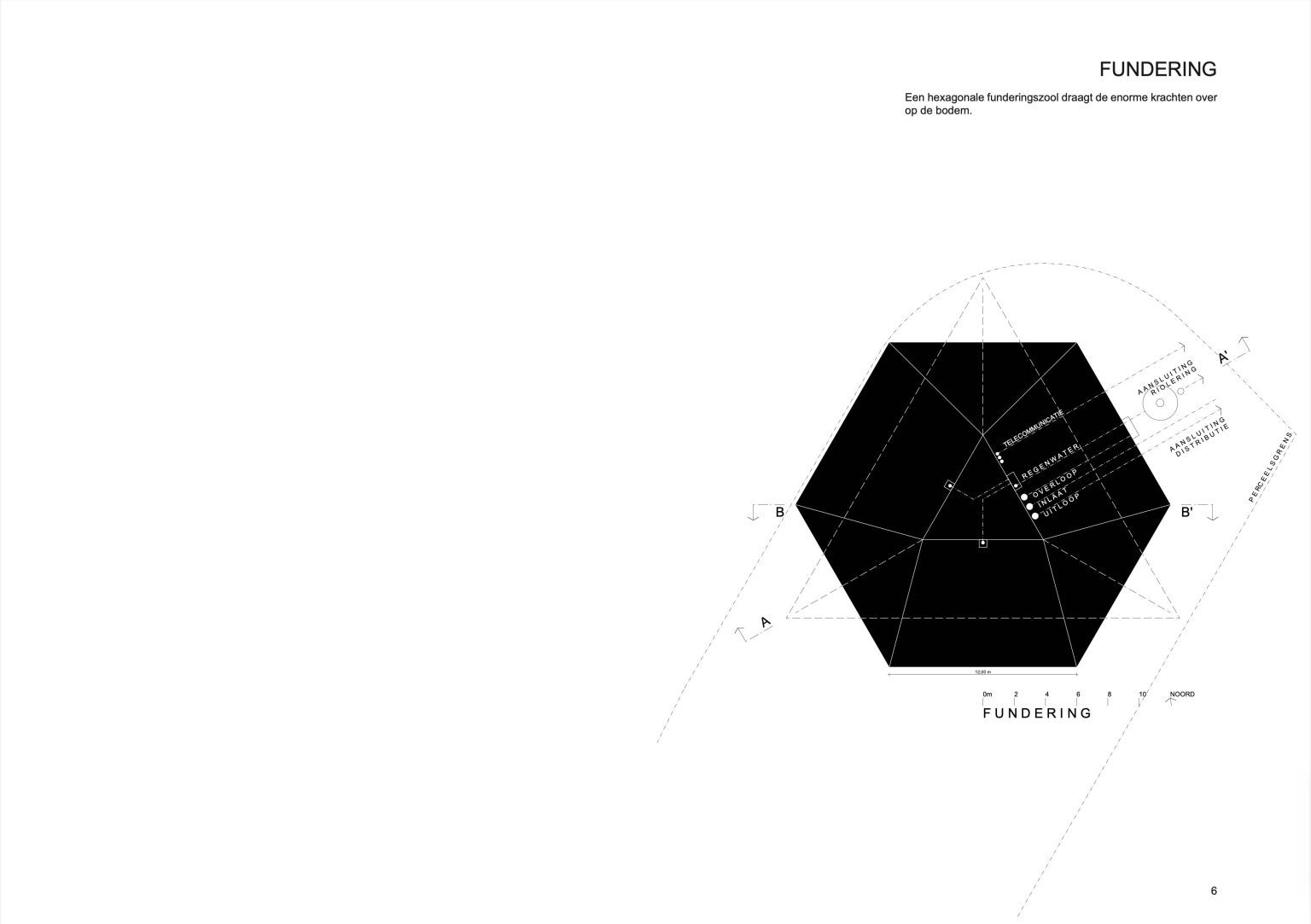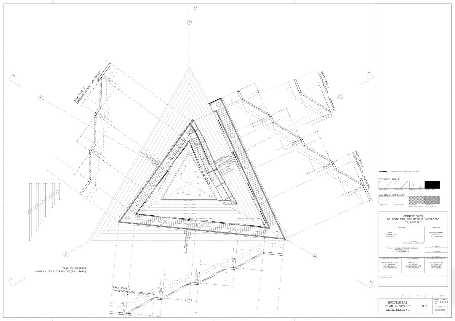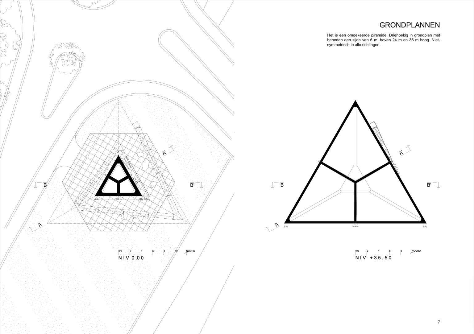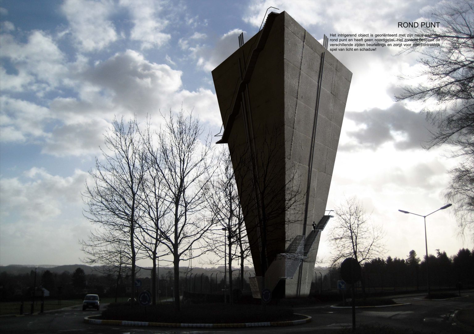 The shape of the new volume also reinforces the landscape aspect. It’s an inverted pyramid. Triangular in floor plan with a side of 7 m at the bottom, 24 m at the top and 32 m as to height. Non-symmetrical in all directions. While approaching the roundabout and during the rotating movement, the tower offers an ever-changing image. It gets bigger and smaller; it gets wider and narrower. You see a side or just a flat surface. The intriguing object is oriented with its nose to the roundabout and does not have a north facade. The sunlight plays on the different sides in turn and creates a contrasting play of light and shadow!