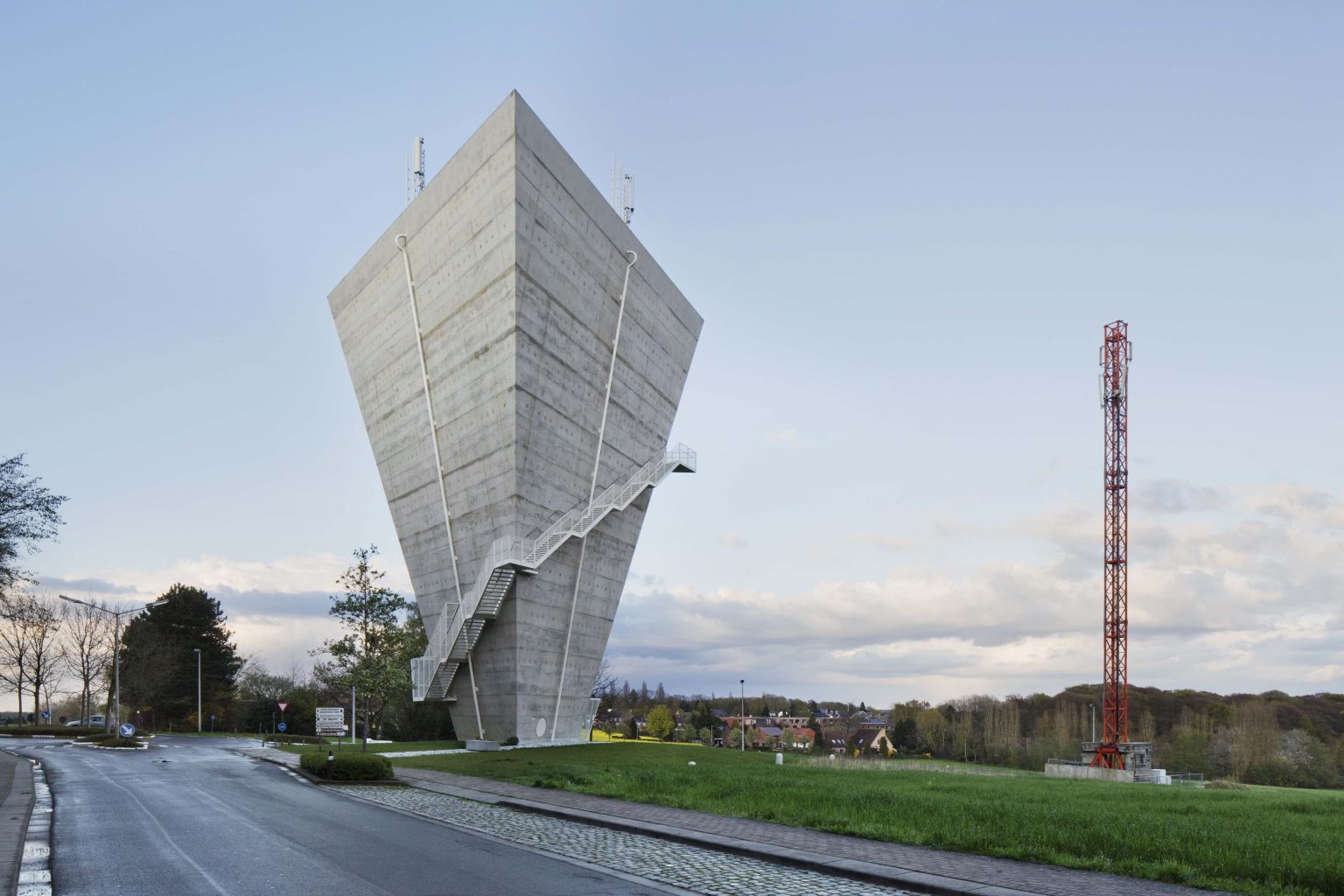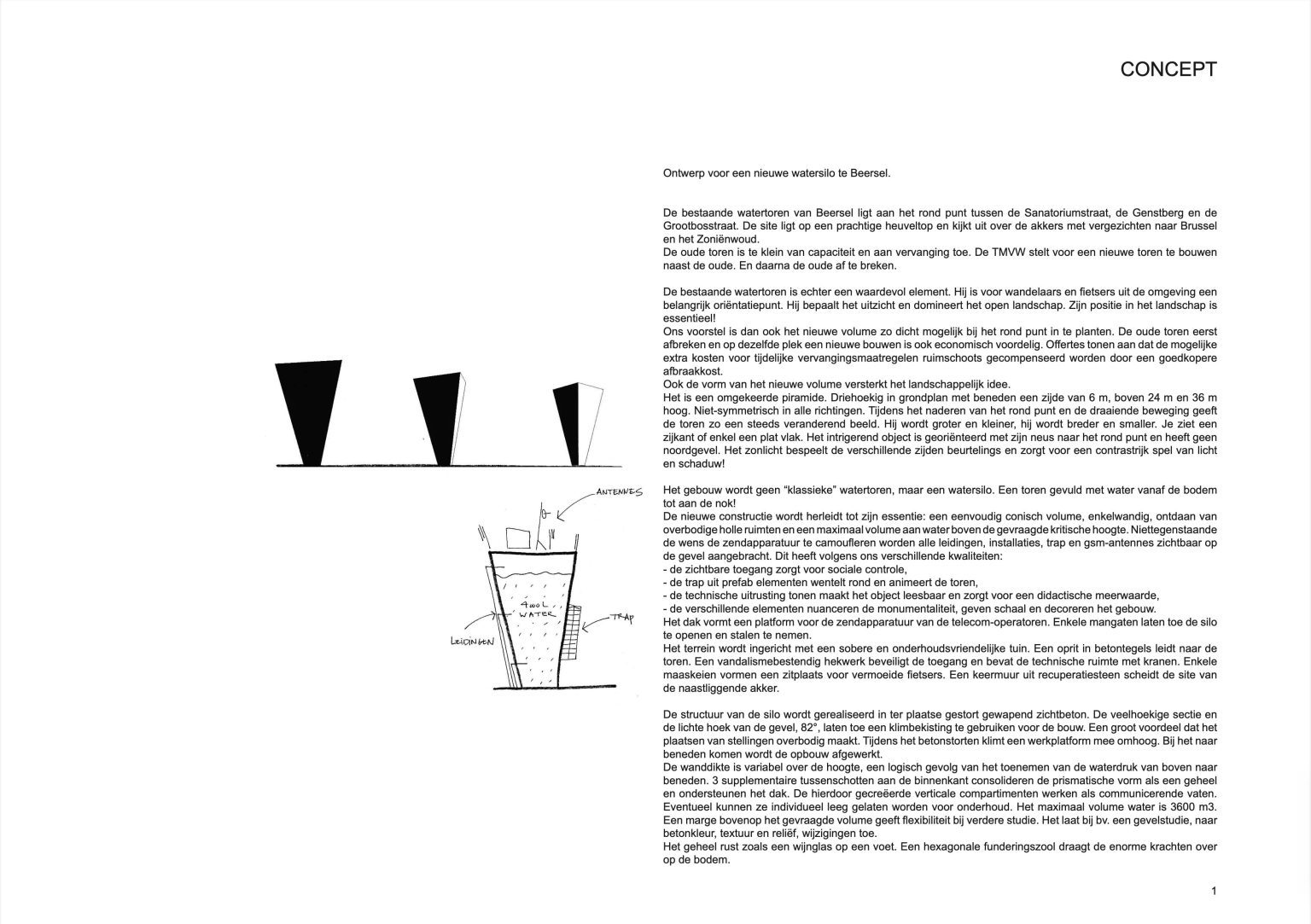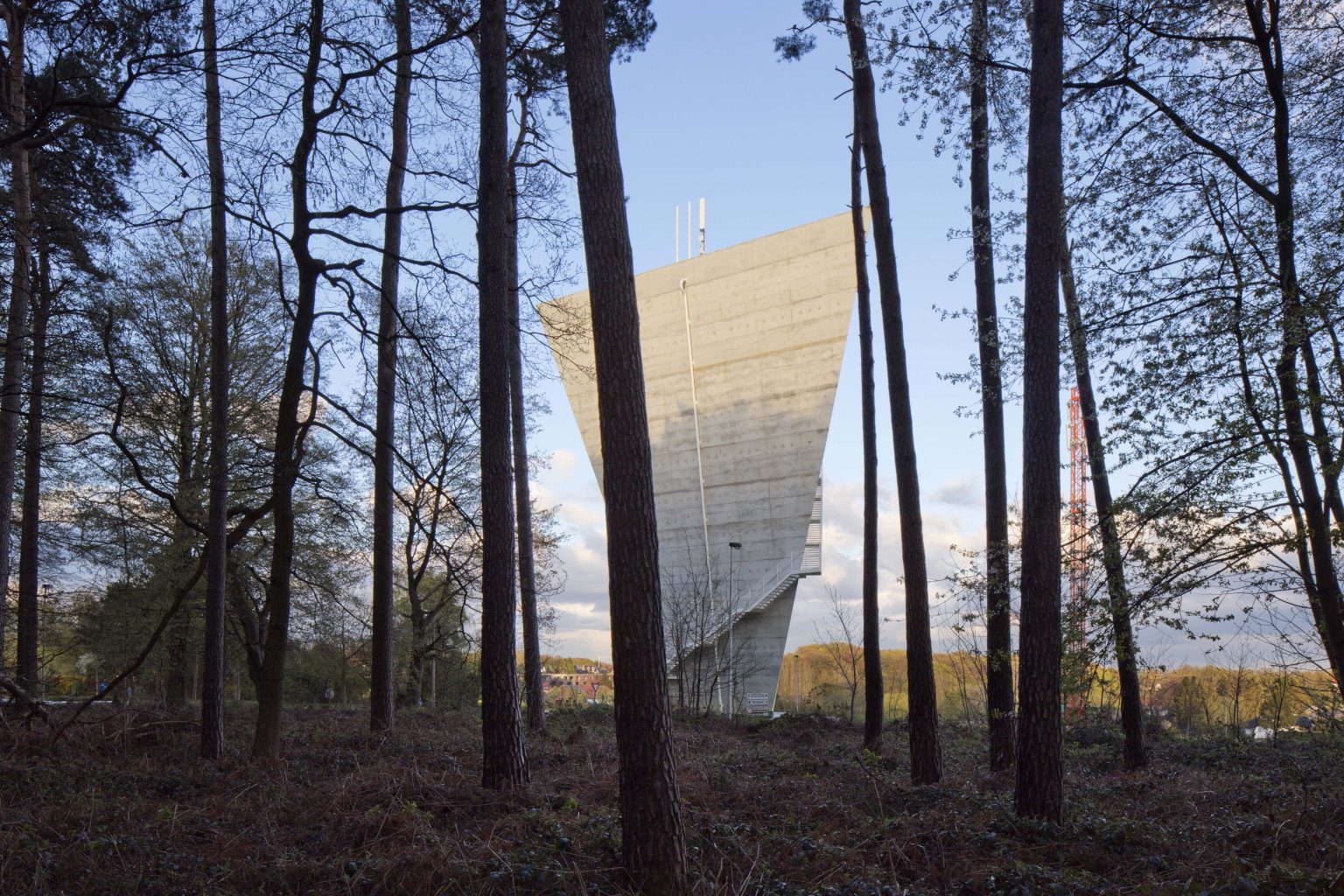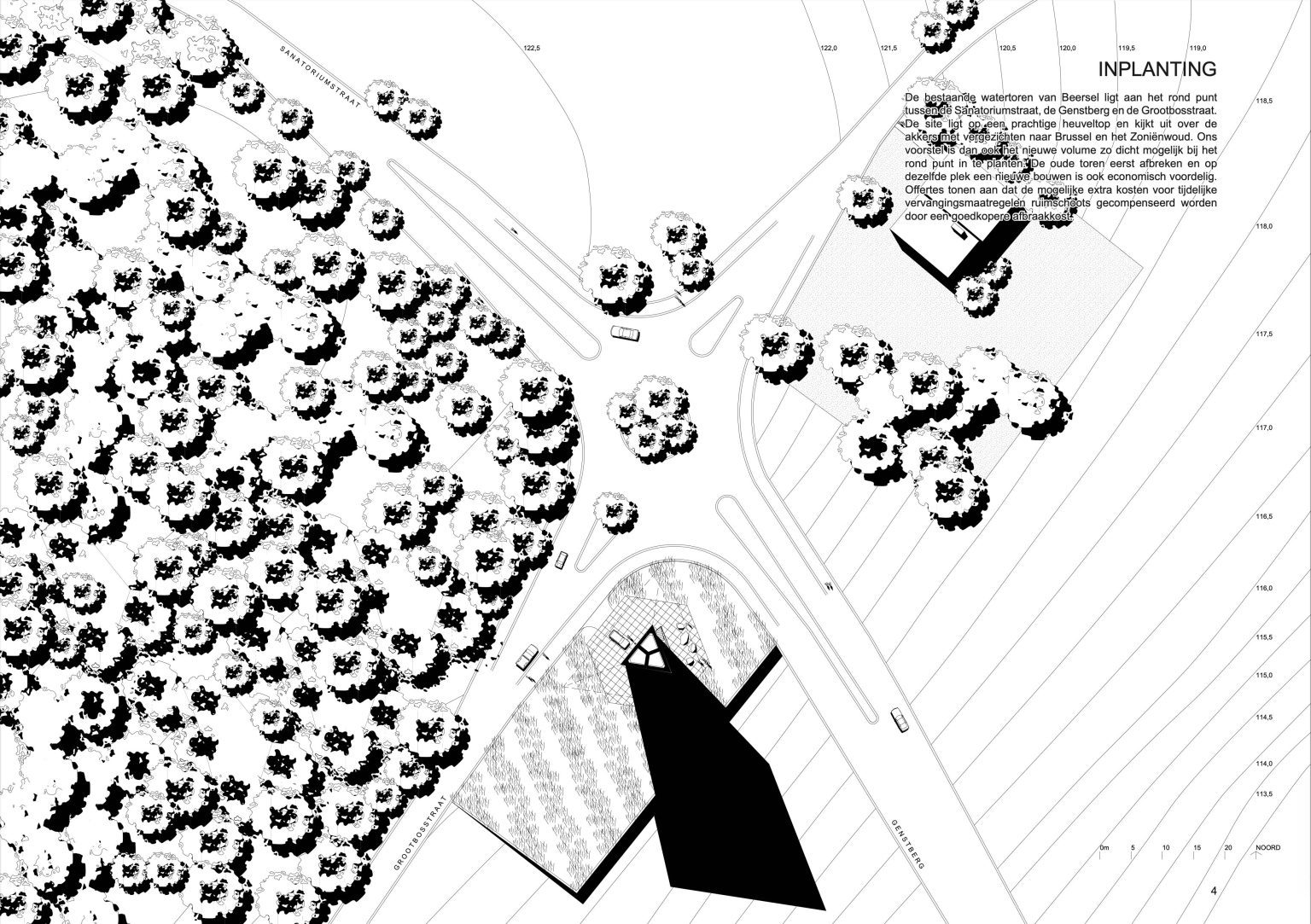 The existing water tower of Beersel is located at the roundabout between Sanatoriumstraat, Genstberg and Grootbosstraat. The site is a beautiful hilltop overlooking the fields with views of Brussels and the Sonian Forest. The old tower is too limited in capacity and needs to be replaced. A new tower is proposed. It would be built next to the old one. Then the old one would be torn down.