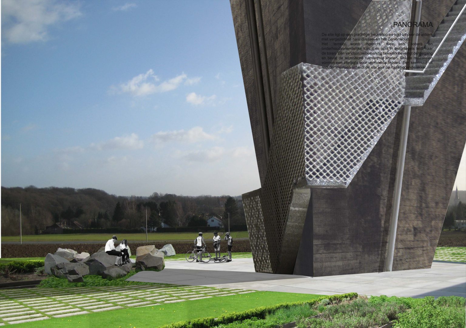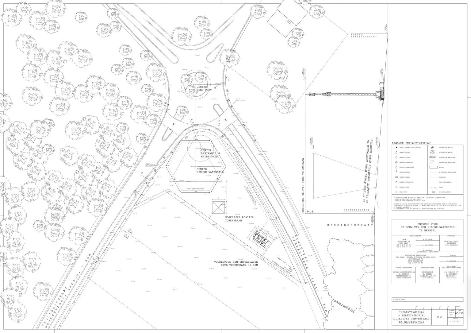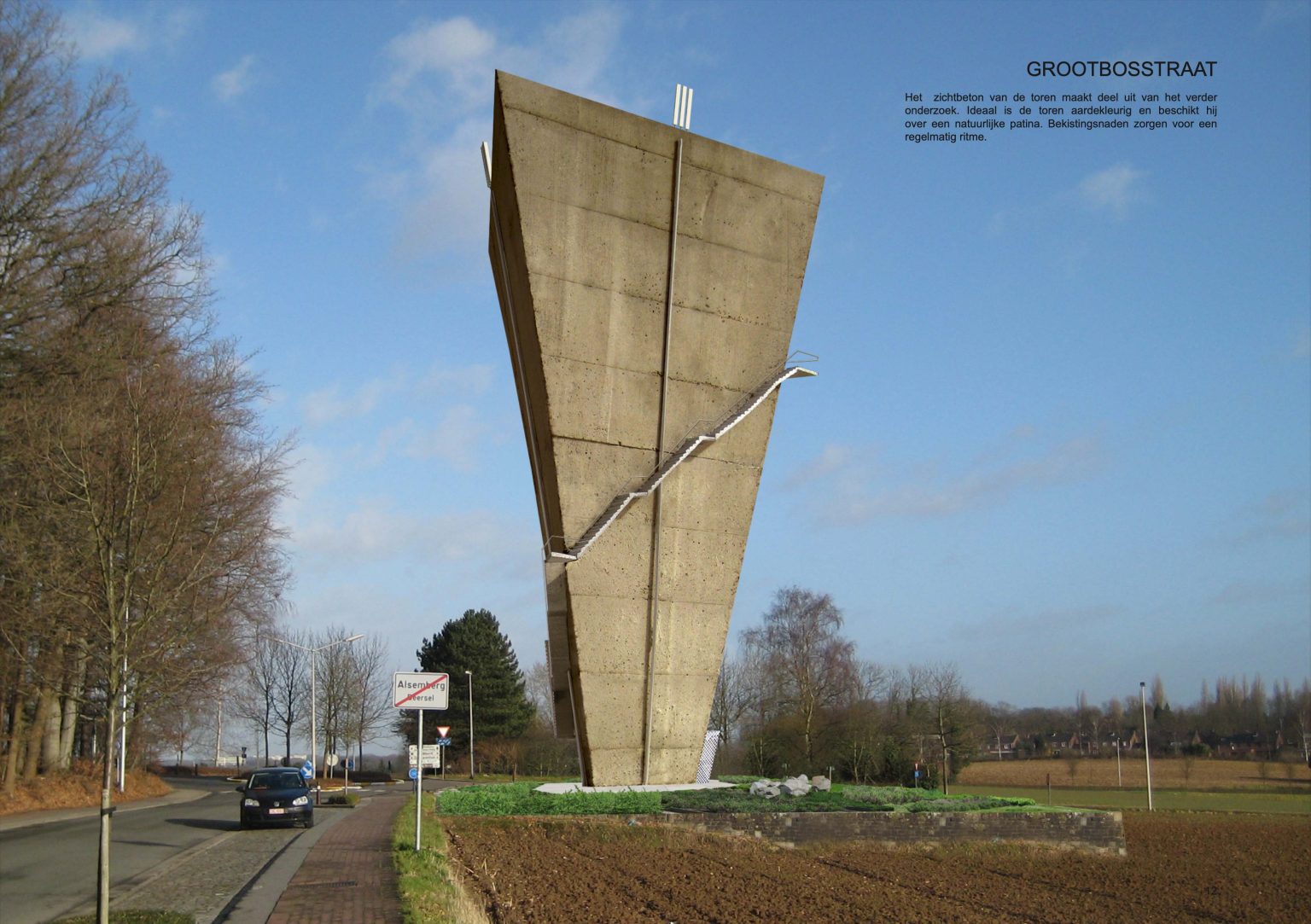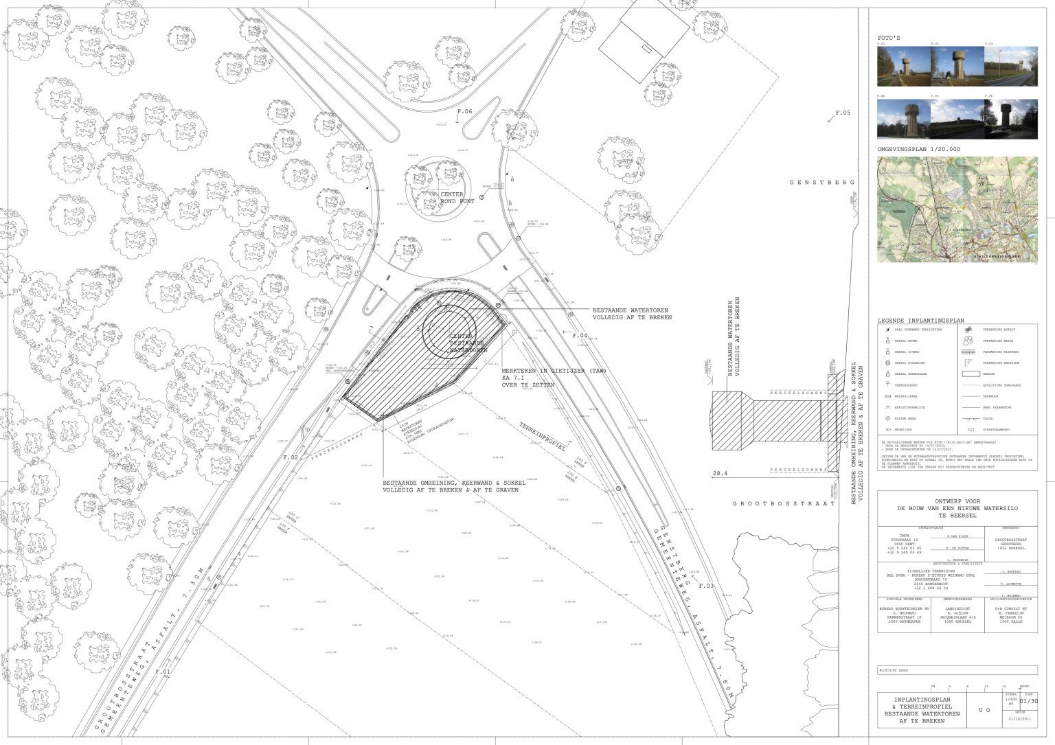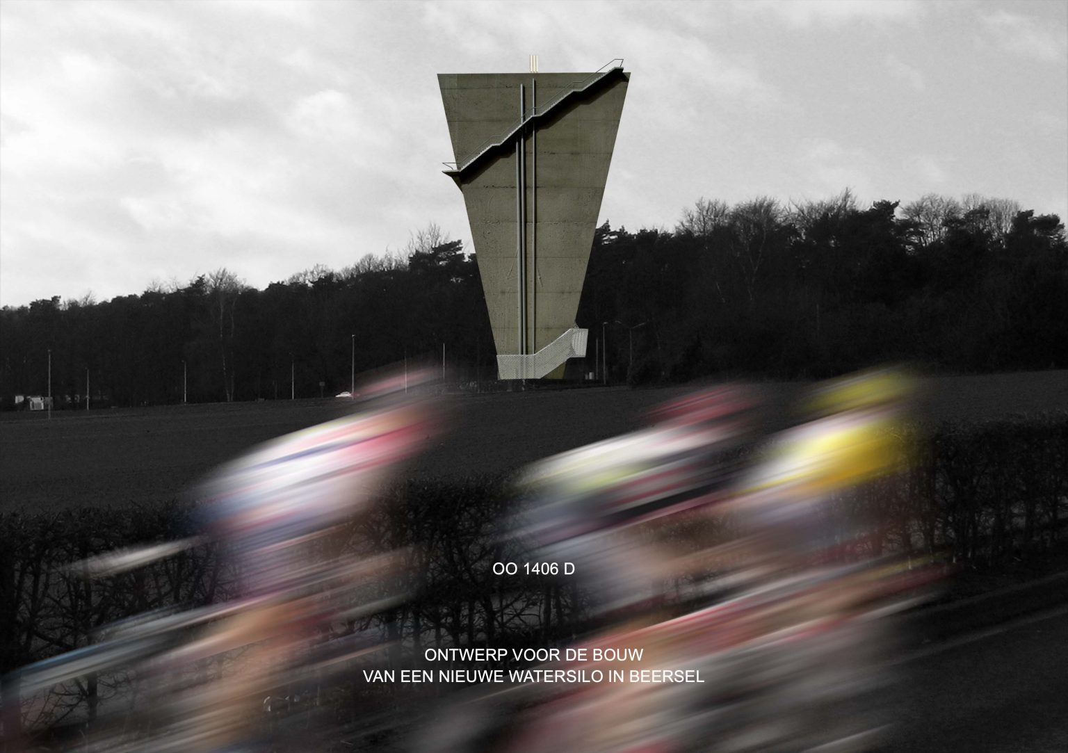 The existing water tower of Beersel is located at the roundabout between Sanatoriumstraat, Genstberg and Grootbosstraat. The site is a beautiful hilltop overlooking the fields with views of Brussels and the Sonian Forest. The old tower is too limited in capacity and needs to be replaced. A new tower is proposed. It would be built next to the old one. Then the old one would be torn down.
