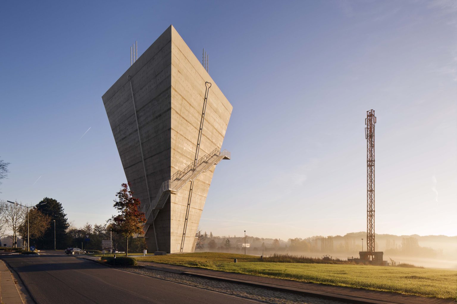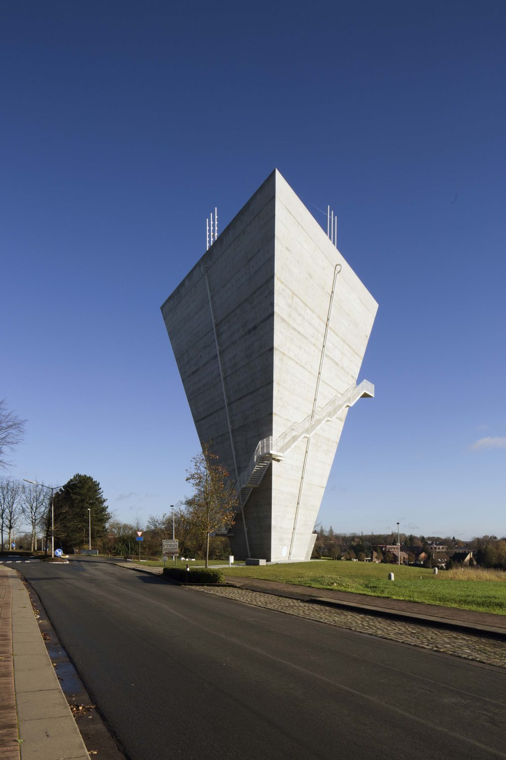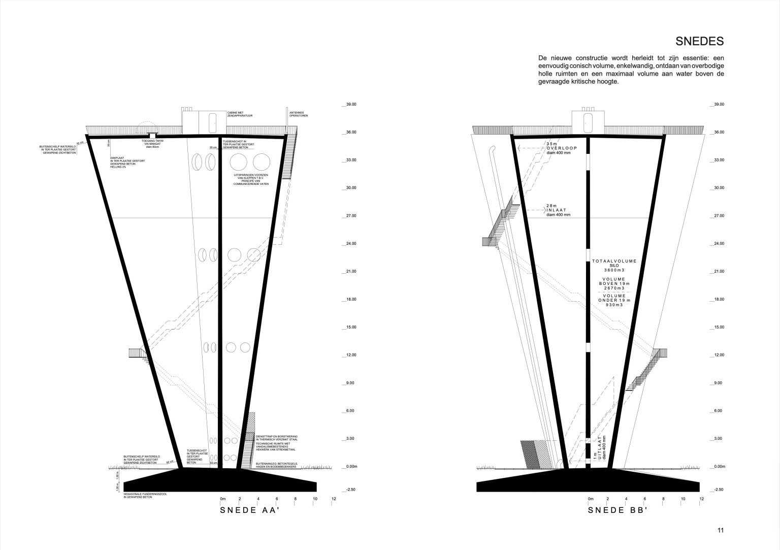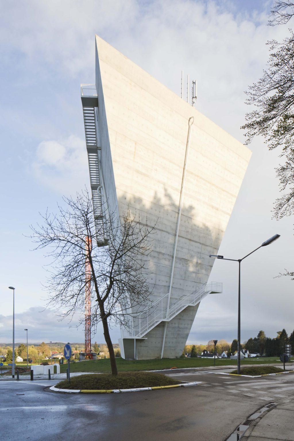 The new construction is reduced to its essence: a simple conical volume, single-walled, stripped of superfluous hollow spaces and a maximum volume of water above the required critical height. Notwithstanding the desire to camouflage the transmitting equipment, all pipes, installations, stairs and GSM antennas are visibly placed on the facade. We believe this has several qualities:
