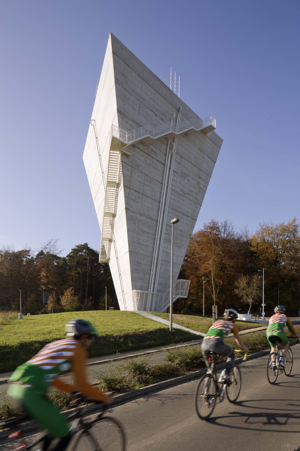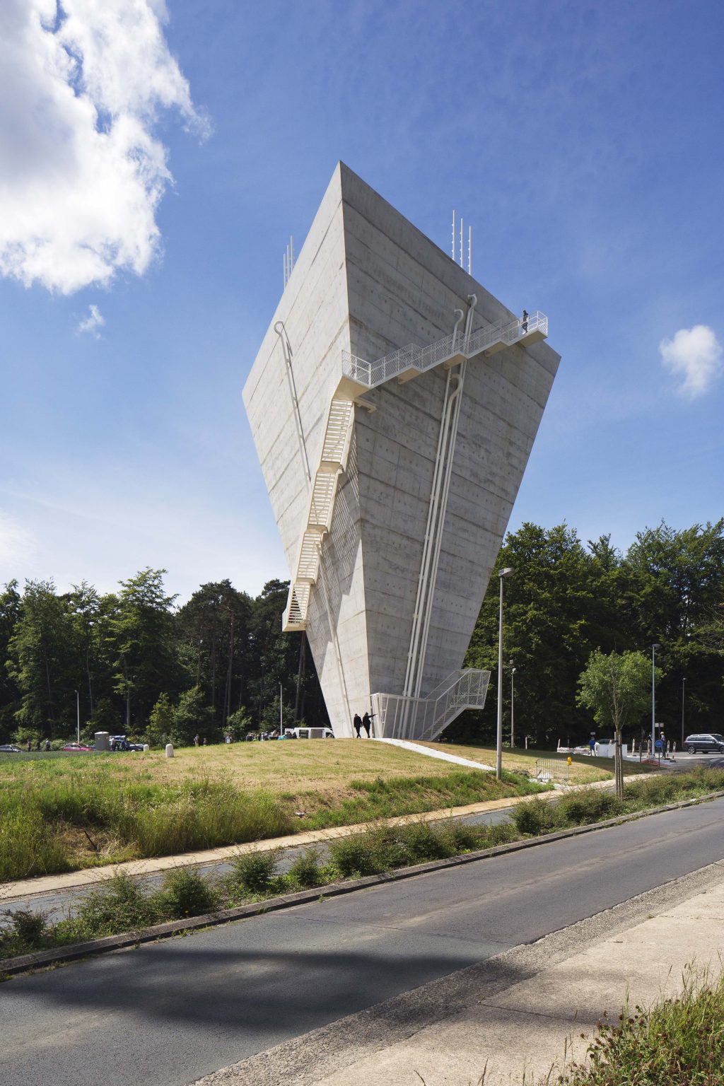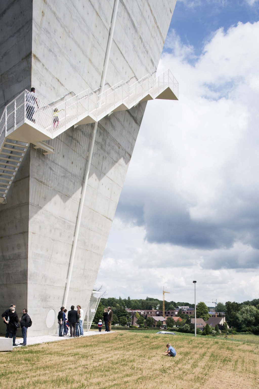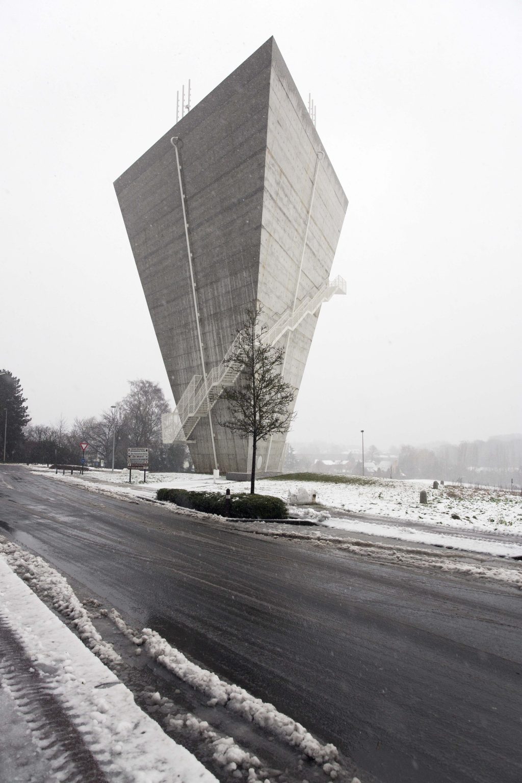 The new construction is reduced to its essence: a simple conical volume, single-walled, stripped of superfluous hollow spaces and a maximum volume of water above the required critical height. Notwithstanding the desire to camouflage the transmitting equipment, all pipes, installations, stairs and GSM antennas are visibly placed on the facade. We believe this has several qualities: