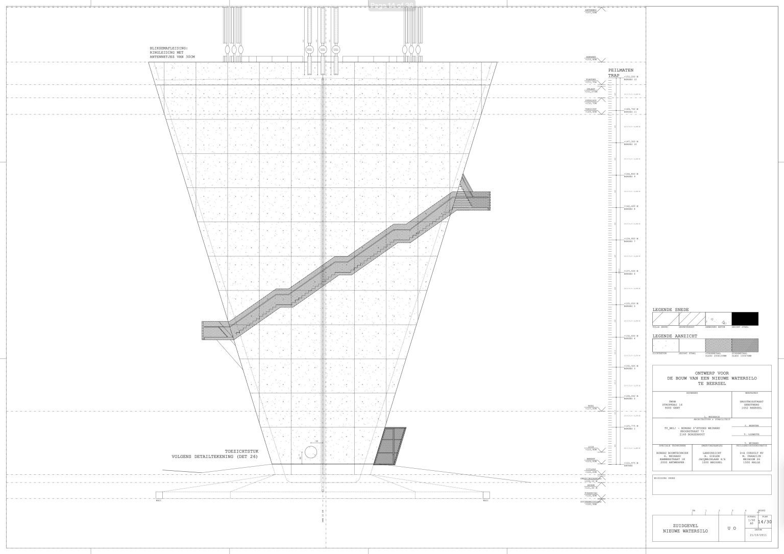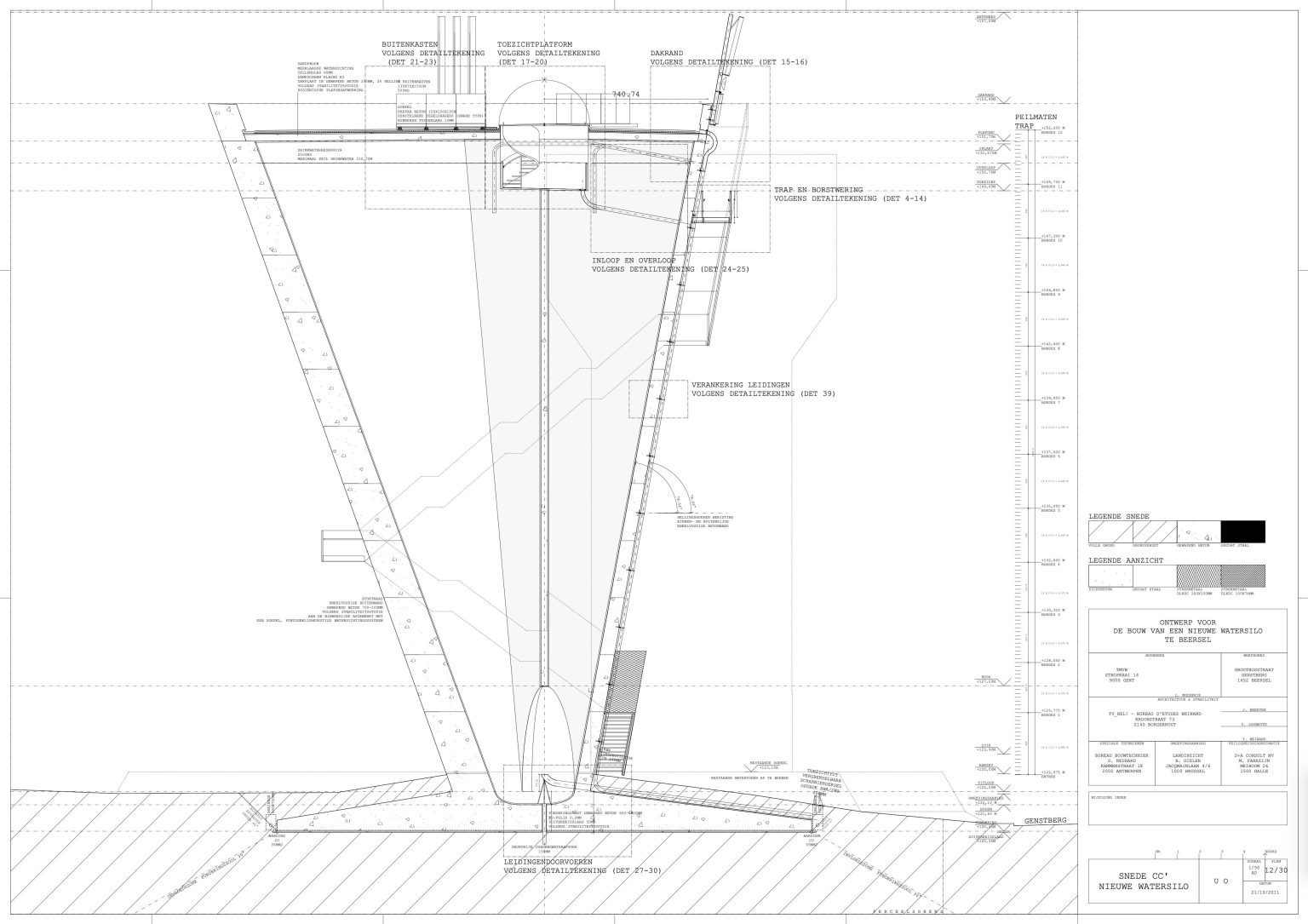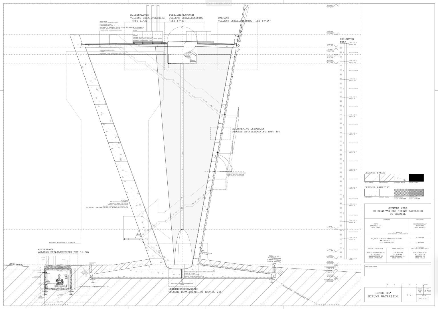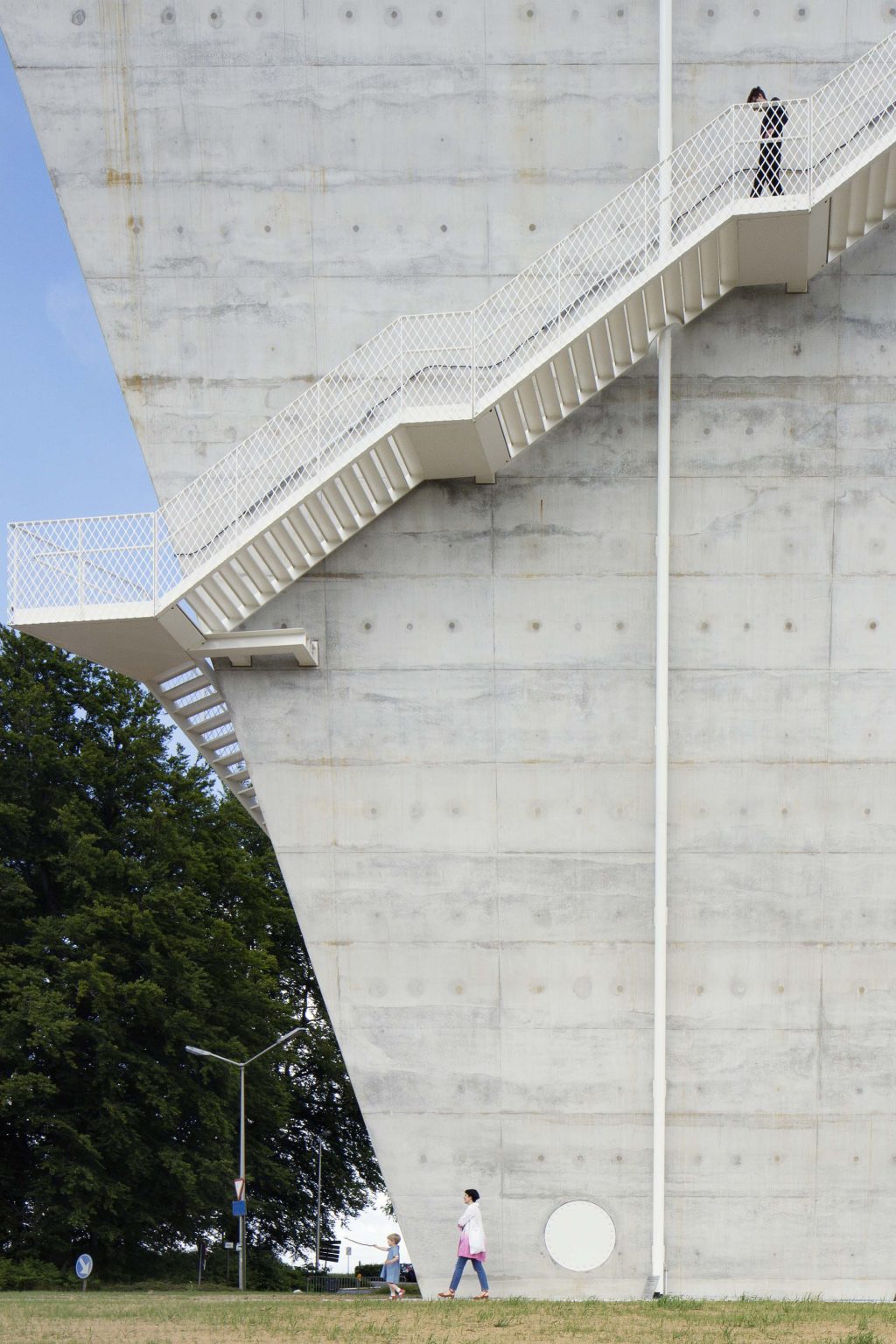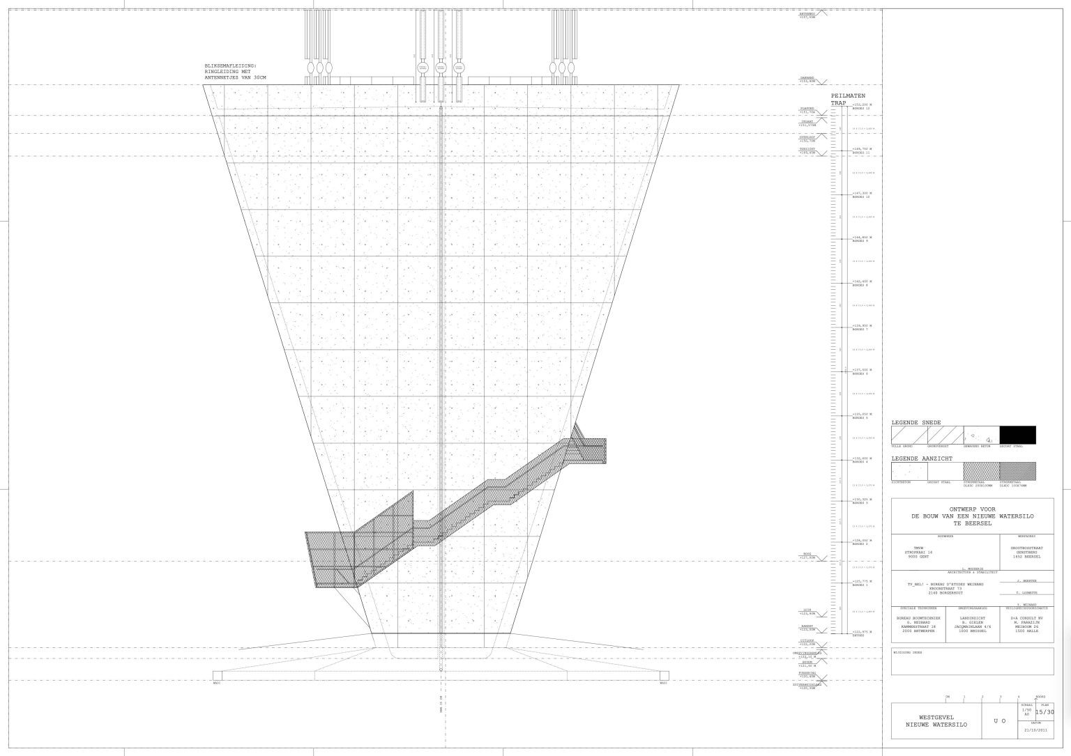 The new construction is reduced to its essence: a simple conical volume, single-walled, stripped of superfluous hollow spaces and a maximum volume of water above the required critical height. Notwithstanding the desire to camouflage the transmitting equipment, all pipes, installations, stairs and GSM antennas are visibly placed on the facade. We believe this has several qualities: