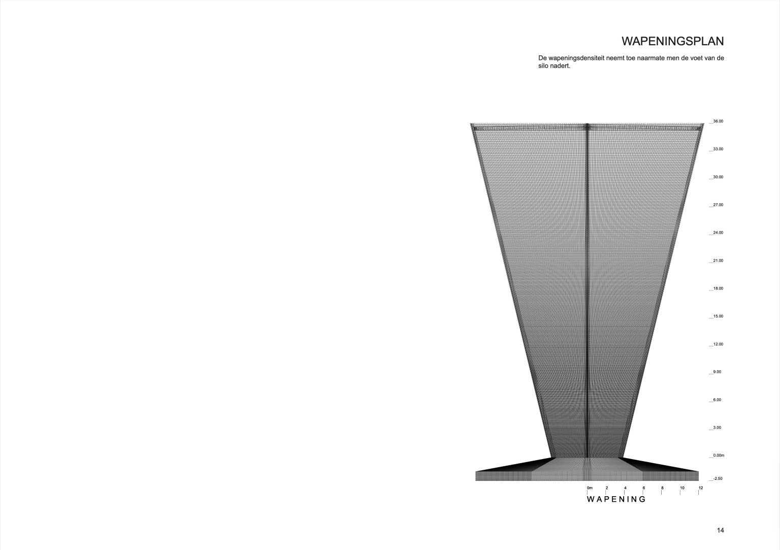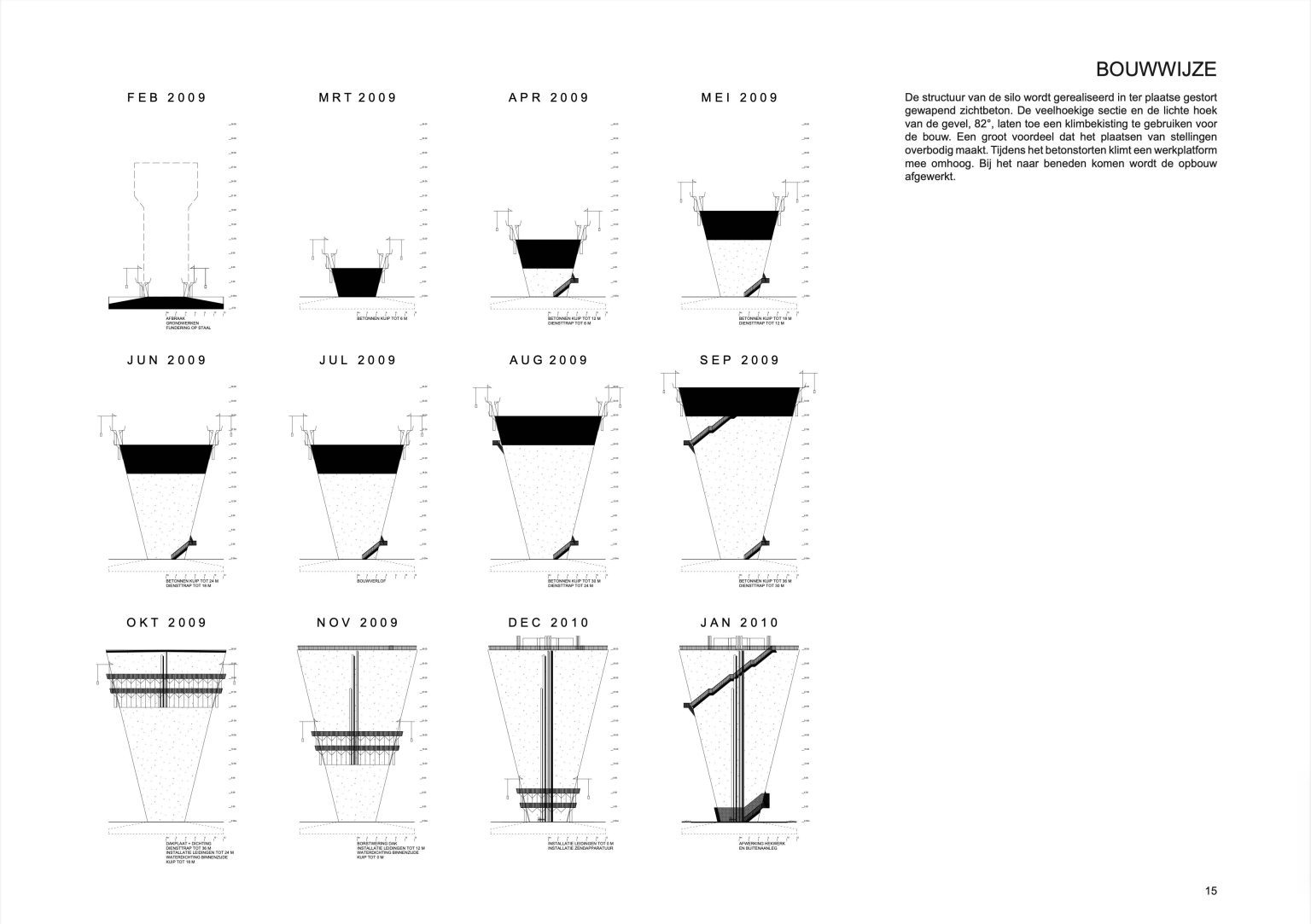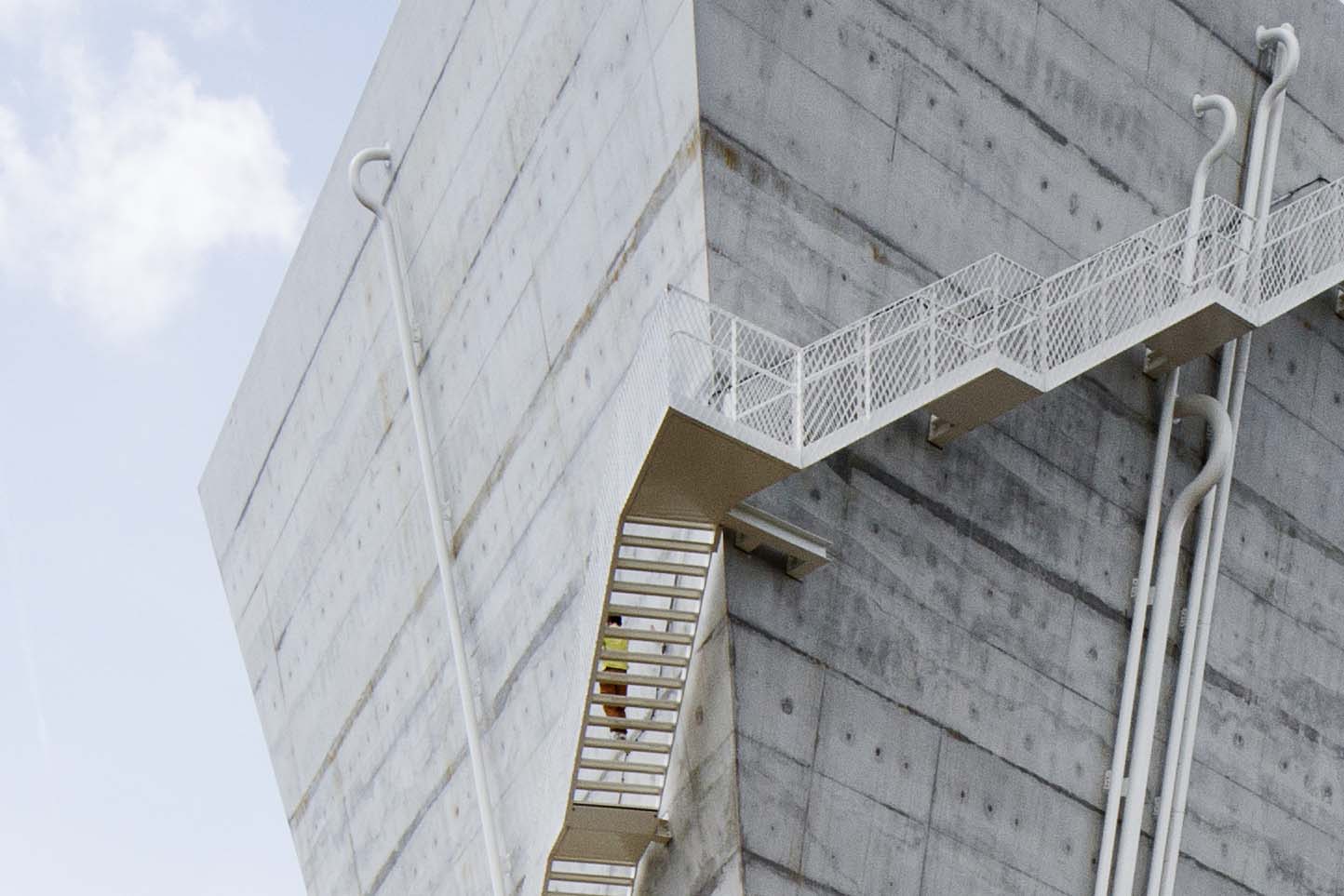 The structure of the silo is realized in reinforced exposed concrete poured on site. The polygonal section and the slight angle of the facade, 82°, allow the use of climbing formwork for construction. Its great advantage is making racks unnecessary. During concrete pouring, a work platform climbs up with it. The construction gets its finish while descending.