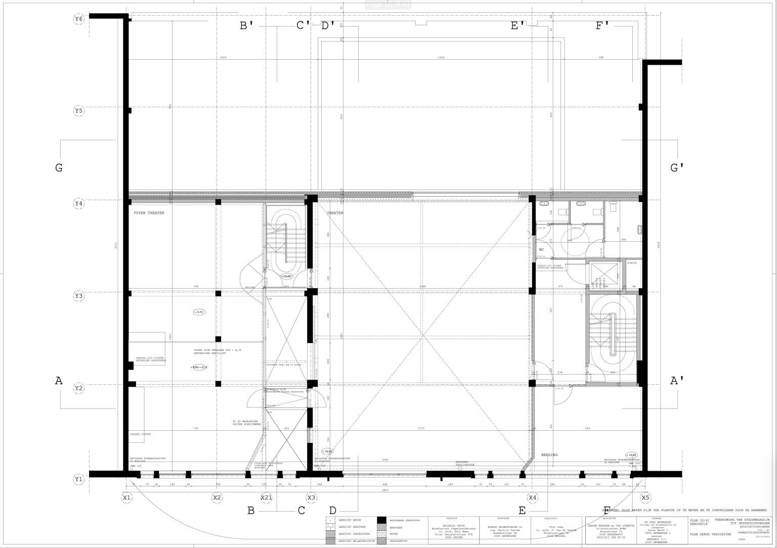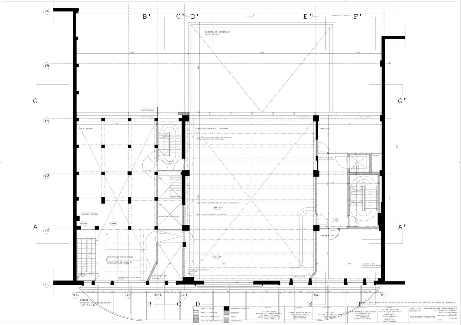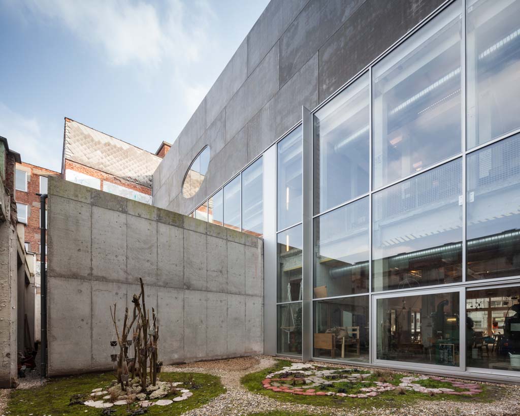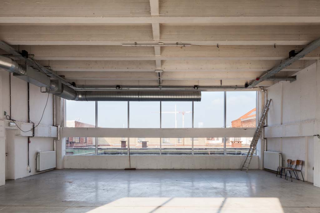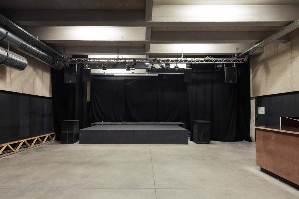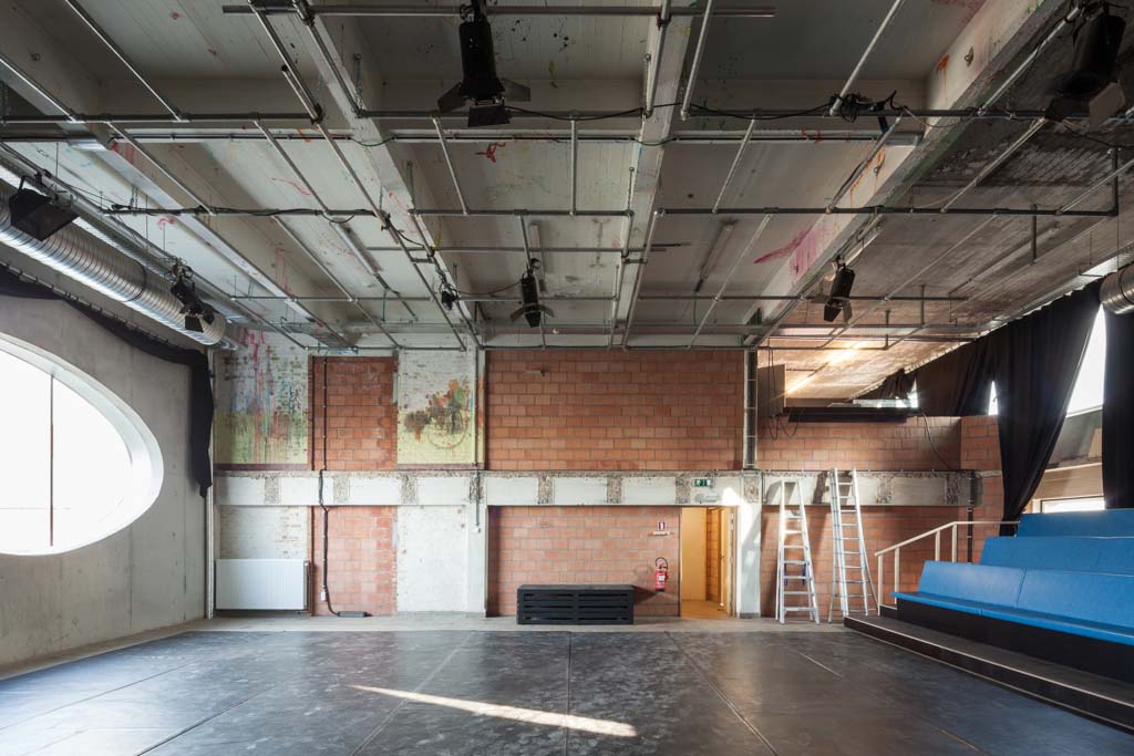 The new programme consists of three major parts: music, theater and visual arts. Each part requires a specific space with its own character: a concert hall (200p), a theatre (80p) and a multipurpose room. The youth culture centre will have a new central entrance with a canopy. A gap, a “canyon” cuts through the building from the street to the garden. At its end an open staircase, footbridges, technical stuff and a hoist animate this vertical public space. All audience levels, including the new café, the “popular kitchen”, a duplex exhibition space and the three large halls are directly and visually interconnected through this main staircase. Because of the high acoustics norms, the concert hall is built according to the box-in-box principle. The theatre is located on the third floor and has a potato-shaped window overlooking the Willem Dock. The multipurpose room is situated in between: a bright space with large glass surfaces. Because of the low budget, the structural work will remain visible. No additional finishing touch!
