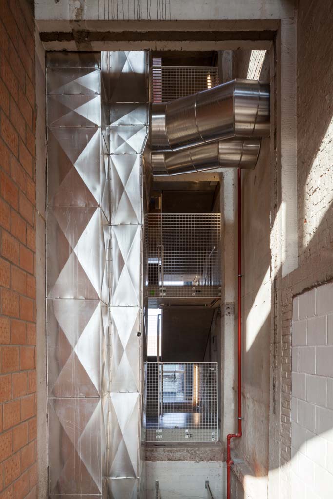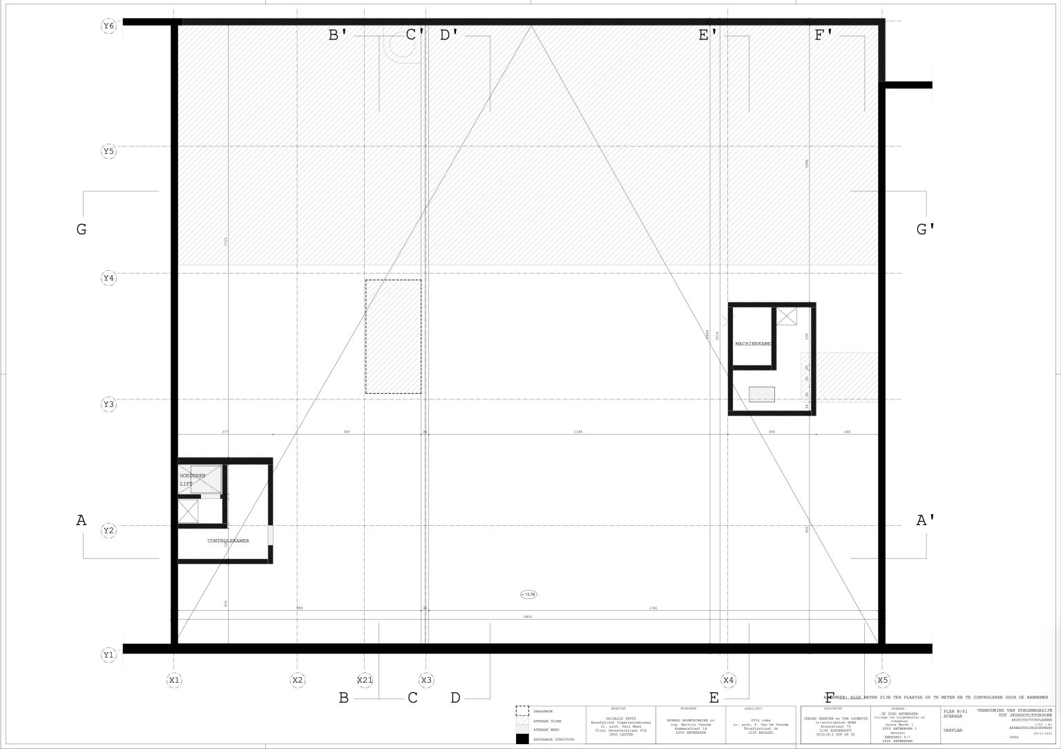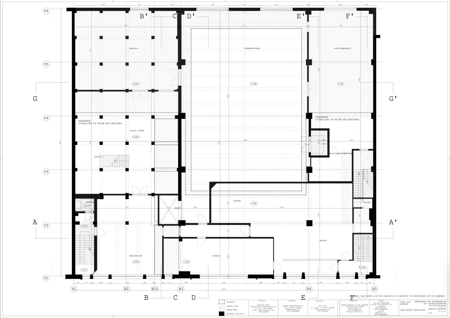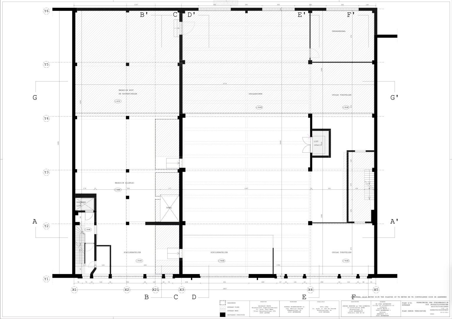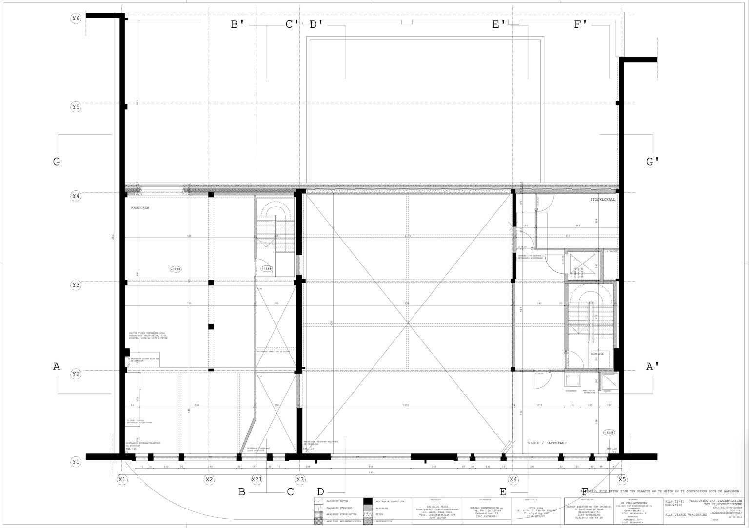 The new programme consists of three major parts: music, theater and visual arts. Each part requires a specific space with its own character: a concert hall (200p), a theatre (80p) and a multipurpose room. The youth culture centre will have a new central entrance with a canopy. A gap, a “canyon” cuts through the building from the street to the garden. At its end an open staircase, footbridges, technical stuff and a hoist animate this vertical public space. All audience levels, including the new café, the “popular kitchen”, a duplex exhibition space and the three large halls are directly and visually interconnected through this main staircase. Because of the high acoustics norms, the concert hall is built according to the box-in-box principle. The theatre is located on the third floor and has a potato-shaped window overlooking the Willem Dock. The multipurpose room is situated in between: a bright space with large glass surfaces. Because of the low budget, the structural work will remain visible. No additional finishing touch!