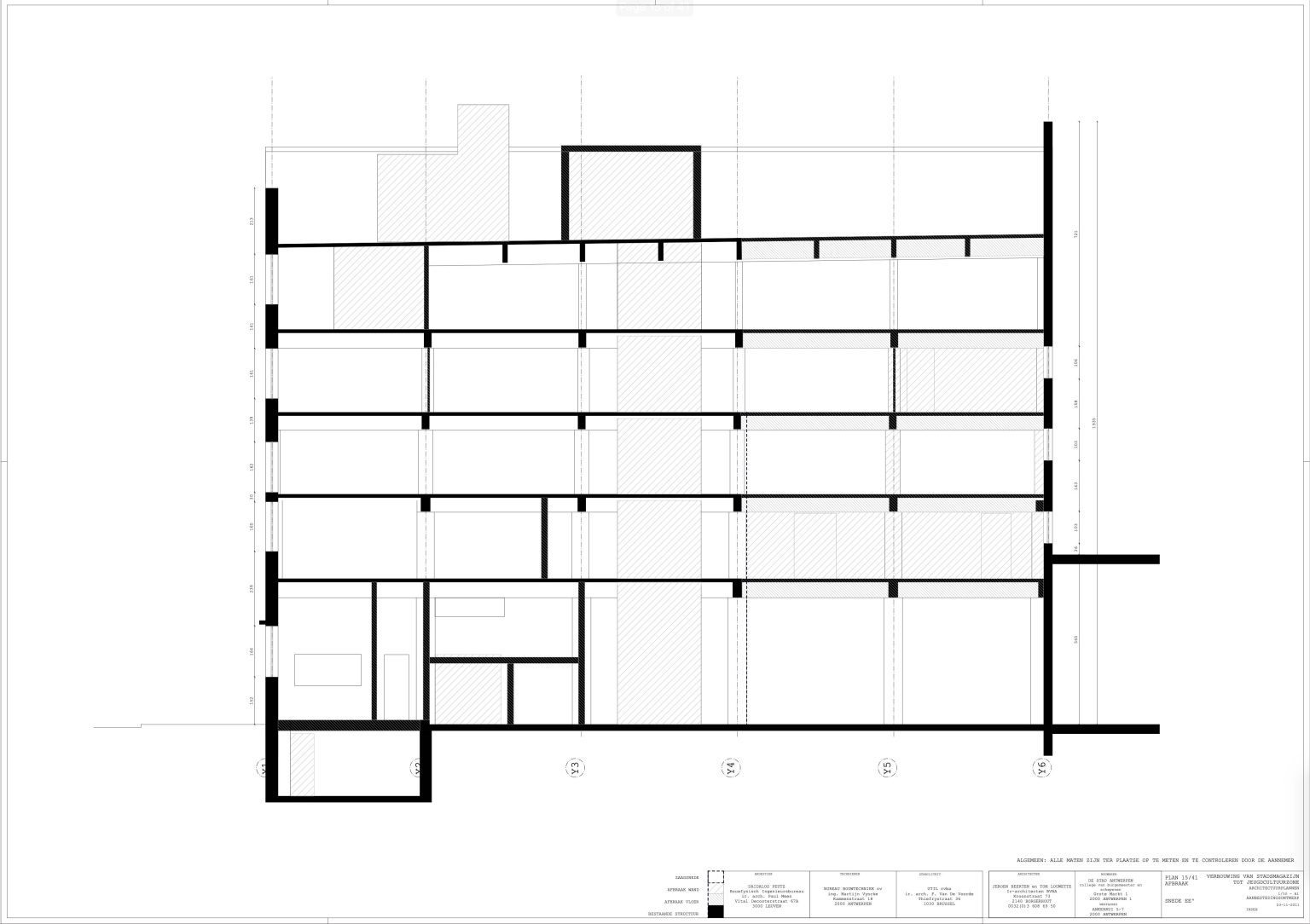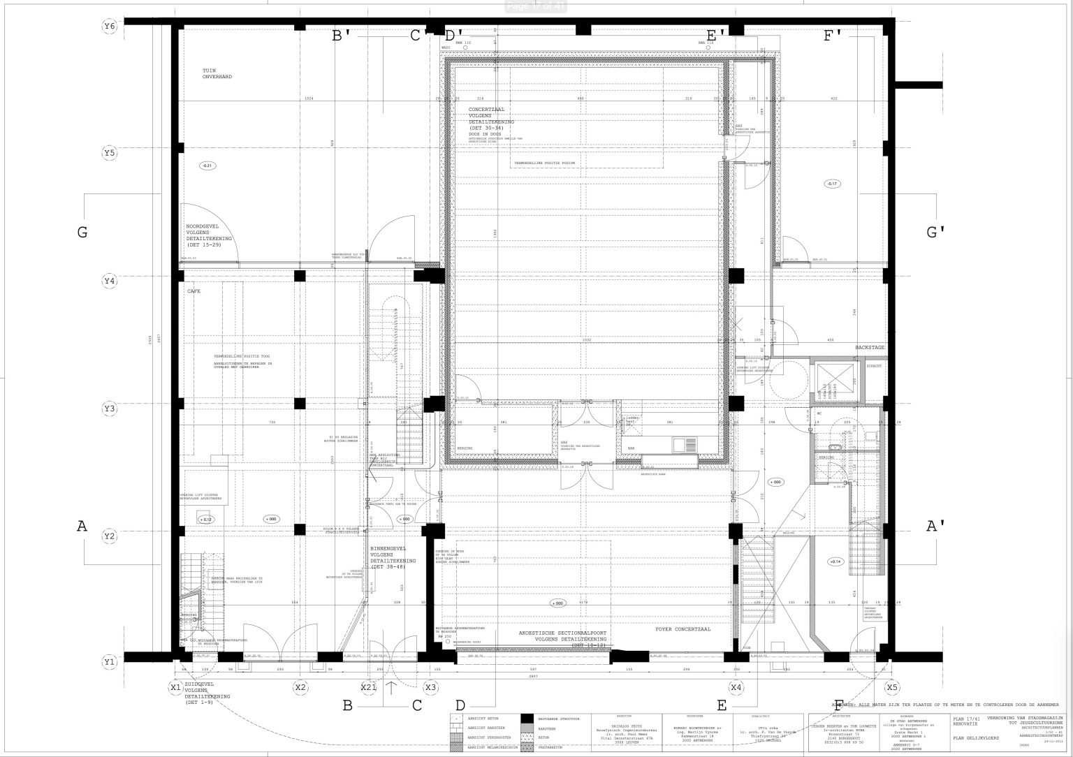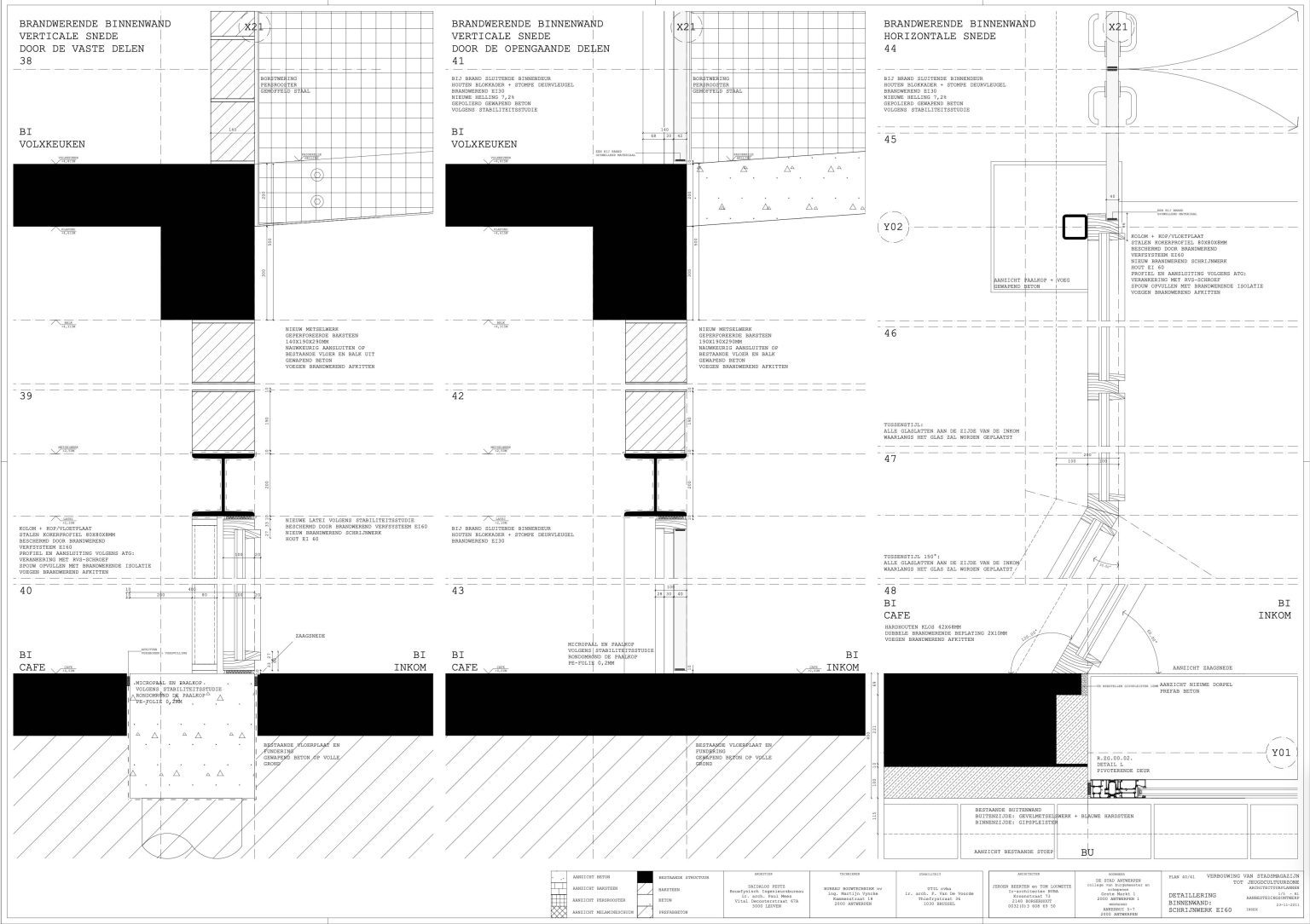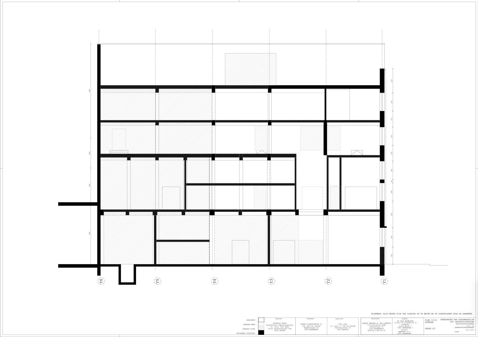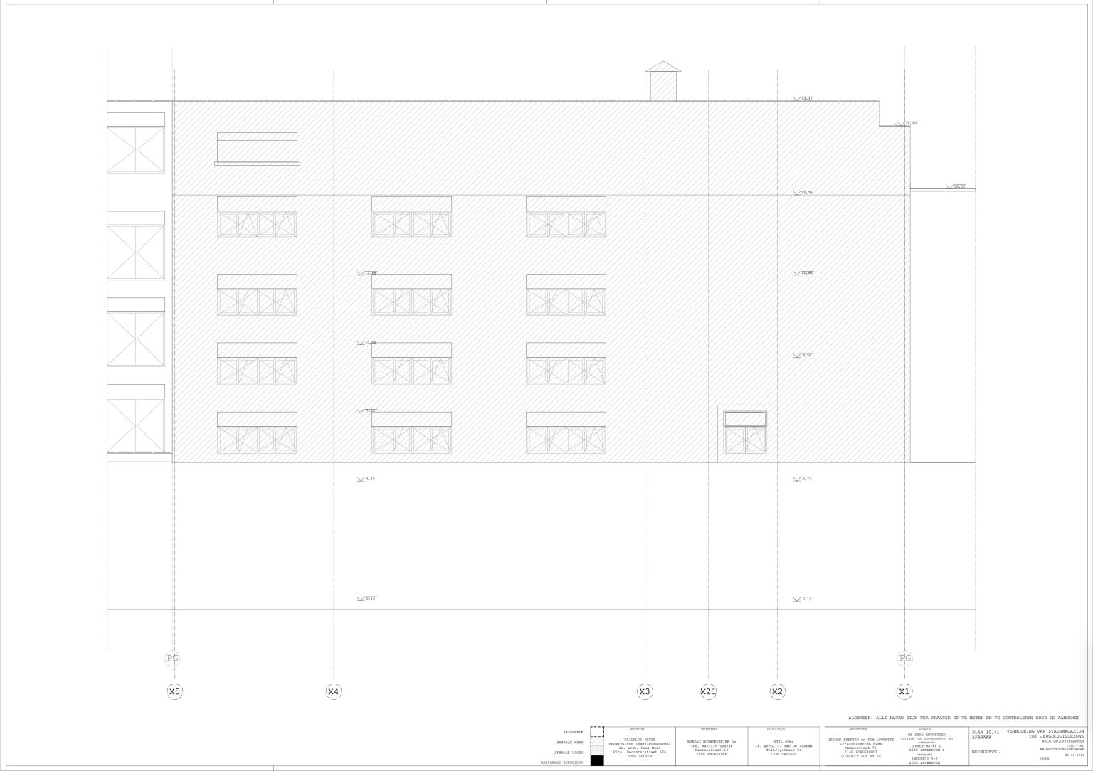 The new programme consists of three major parts: music, theater and visual arts. Each part requires a specific space with its own character: a concert hall (200p), a theatre (80p) and a multipurpose room. The youth culture centre will have a new central entrance with a canopy. A gap, a “canyon” cuts through the building from the street to the garden. At its end an open staircase, footbridges, technical stuff and a hoist animate this vertical public space. All audience levels, including the new café, the “popular kitchen”, a duplex exhibition space and the three large halls are directly and visually interconnected through this main staircase. Because of the high acoustics norms, the concert hall is built according to the box-in-box principle. The theatre is located on the third floor and has a potato-shaped window overlooking the Willem Dock. The multipurpose room is situated in between: a bright space with large glass surfaces. Because of the low budget, the structural work will remain visible. No additional finishing touch!