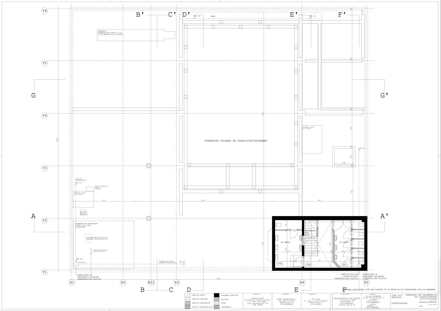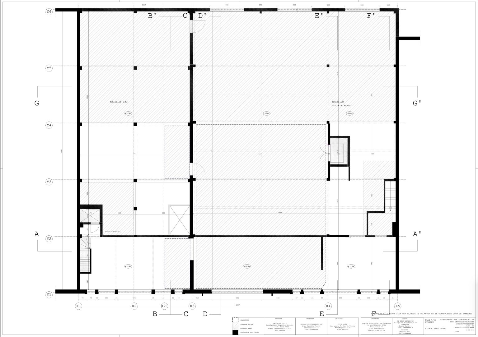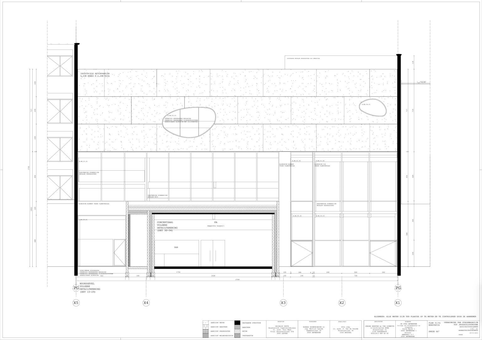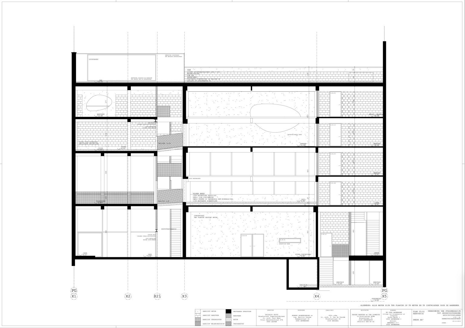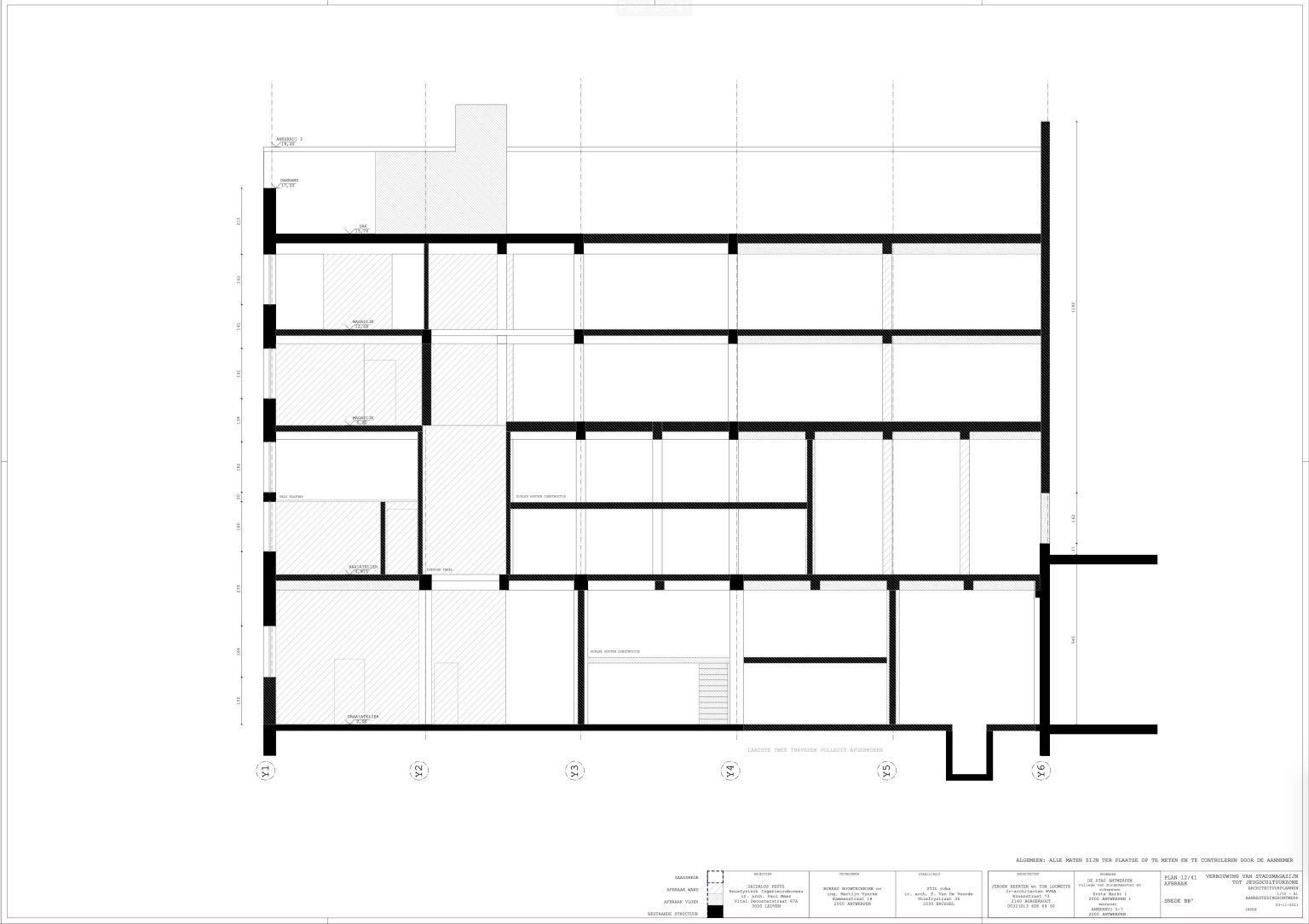 The new programme consists of three major parts: music, theater and visual arts. Each part requires a specific space with its own character: a concert hall (200p), a theatre (80p) and a multipurpose room. The youth culture centre will have a new central entrance with a canopy. A gap, a “canyon” cuts through the building from the street to the garden. At its end an open staircase, footbridges, technical stuff and a hoist animate this vertical public space. All audience levels, including the new café, the “popular kitchen”, a duplex exhibition space and the three large halls are directly and visually interconnected through this main staircase. Because of the high acoustics norms, the concert hall is built according to the box-in-box principle. The theatre is located on the third floor and has a potato-shaped window overlooking the Willem Dock. The multipurpose room is situated in between: a bright space with large glass surfaces. Because of the low budget, the structural work will remain visible. No additional finishing touch!