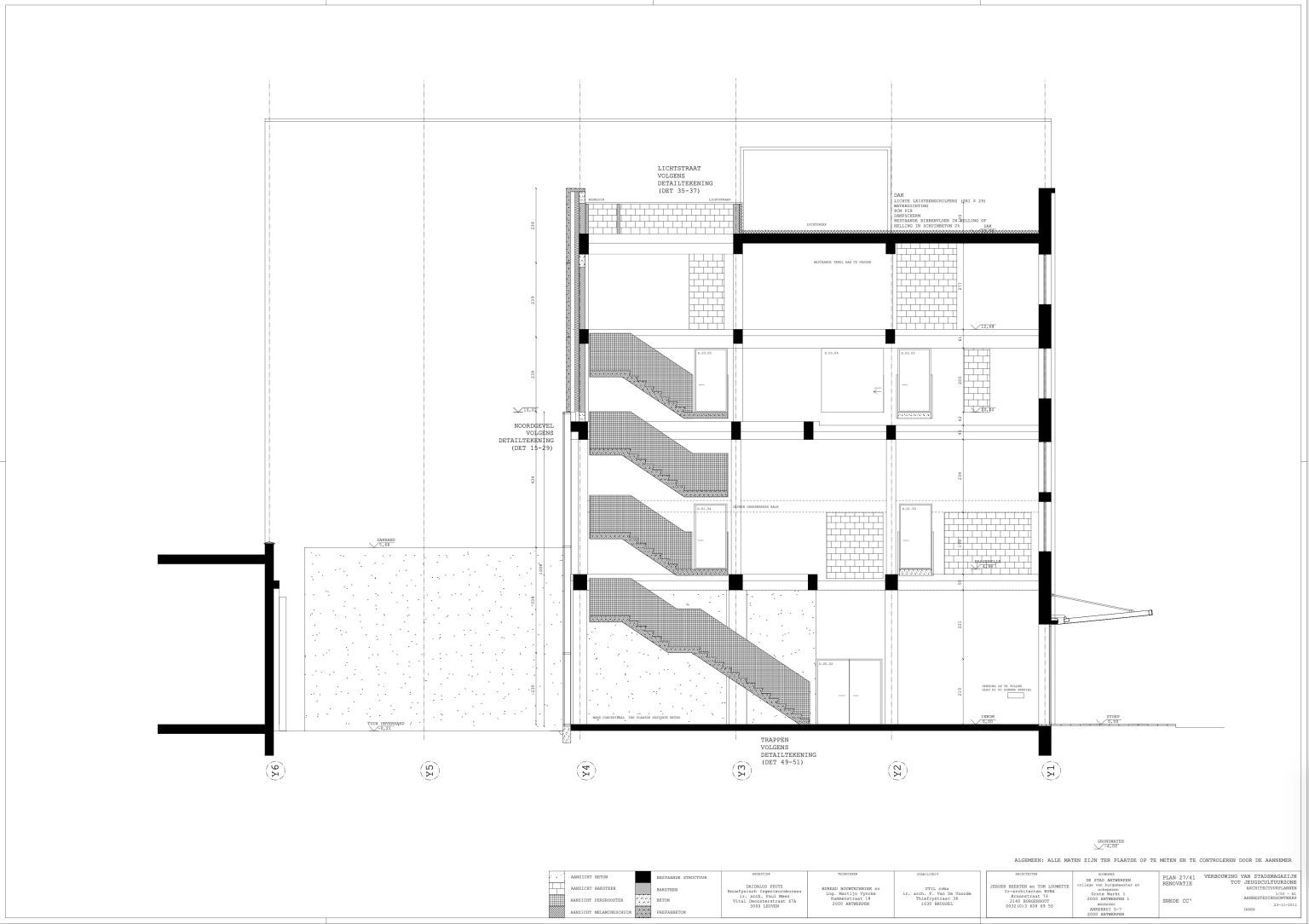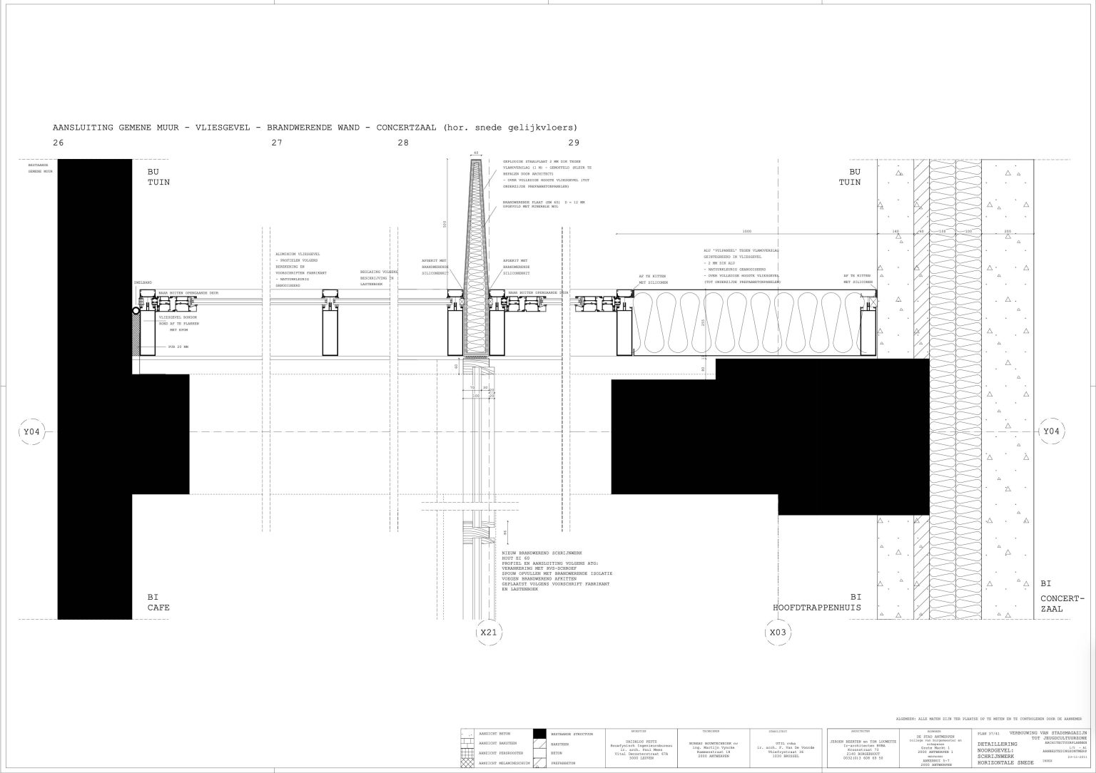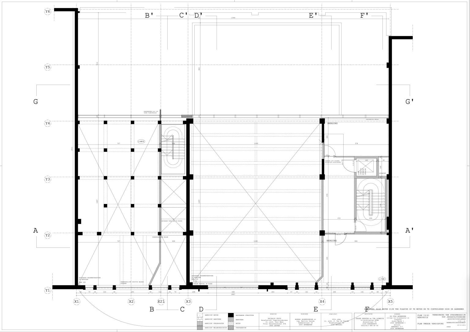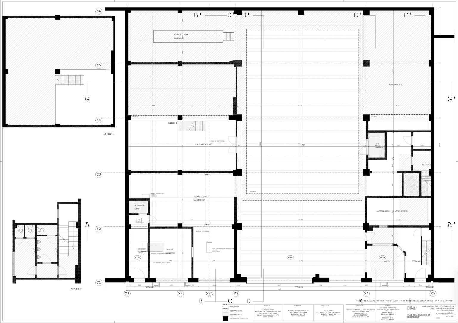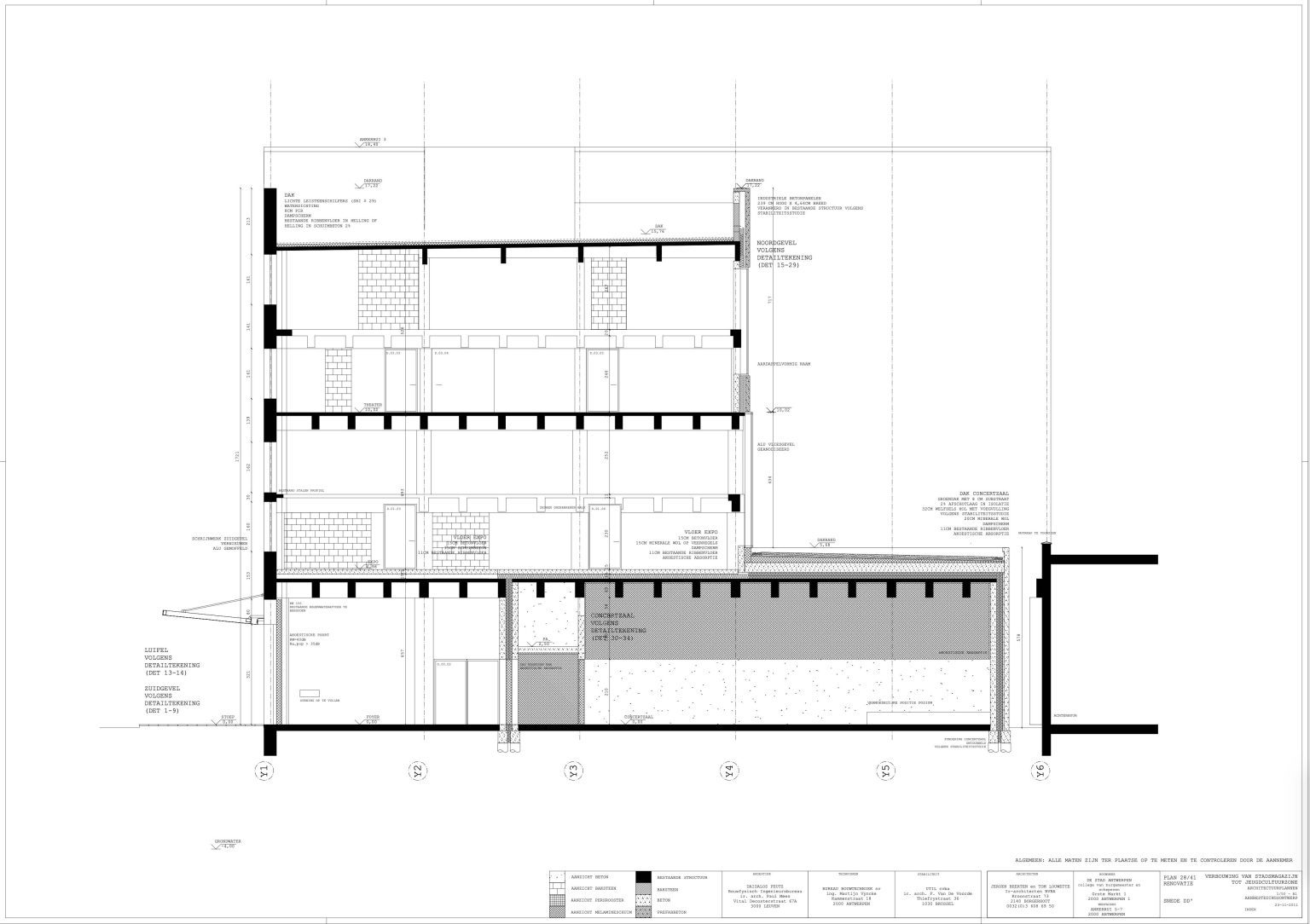 The new programme consists of three major parts: music, theater and visual arts. Each part requires a specific space with its own character: a concert hall (200p), a theatre (80p) and a multipurpose room. The youth culture centre will have a new central entrance with a canopy. A gap, a “canyon” cuts through the building from the street to the garden. At its end an open staircase, footbridges, technical stuff and a hoist animate this vertical public space. All audience levels, including the new café, the “popular kitchen”, a duplex exhibition space and the three large halls are directly and visually interconnected through this main staircase. Because of the high acoustics norms, the concert hall is built according to the box-in-box principle. The theatre is located on the third floor and has a potato-shaped window overlooking the Willem Dock. The multipurpose room is situated in between: a bright space with large glass surfaces. Because of the low budget, the structural work will remain visible. No additional finishing touch!