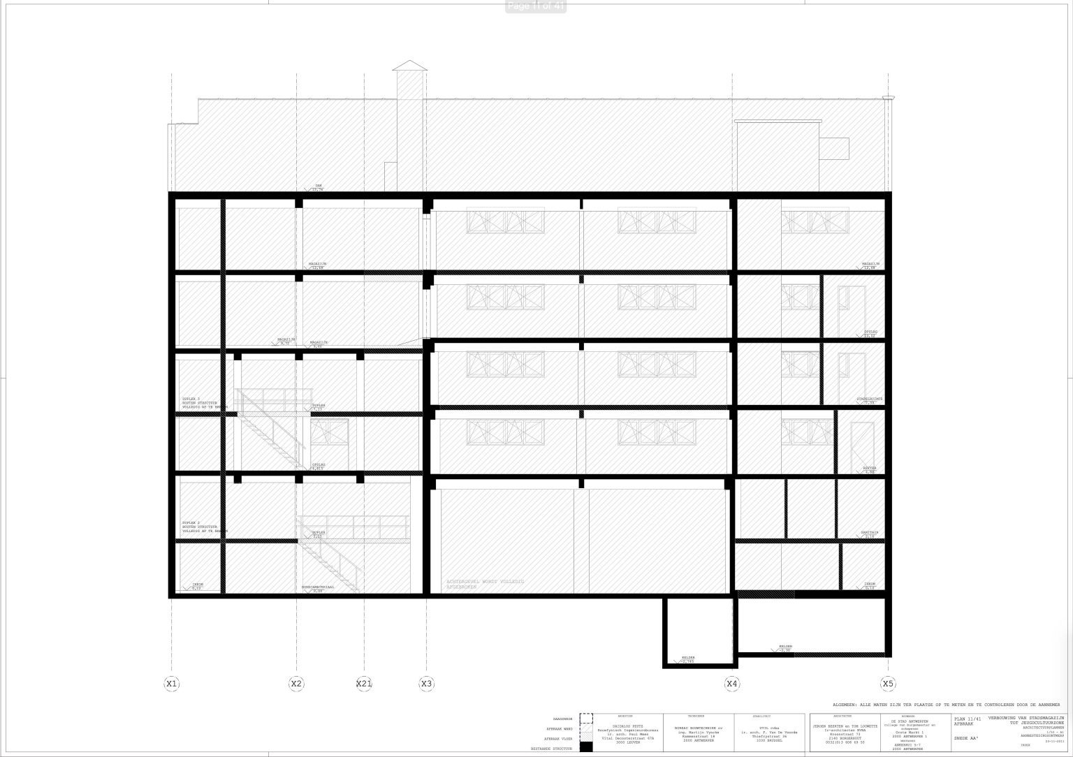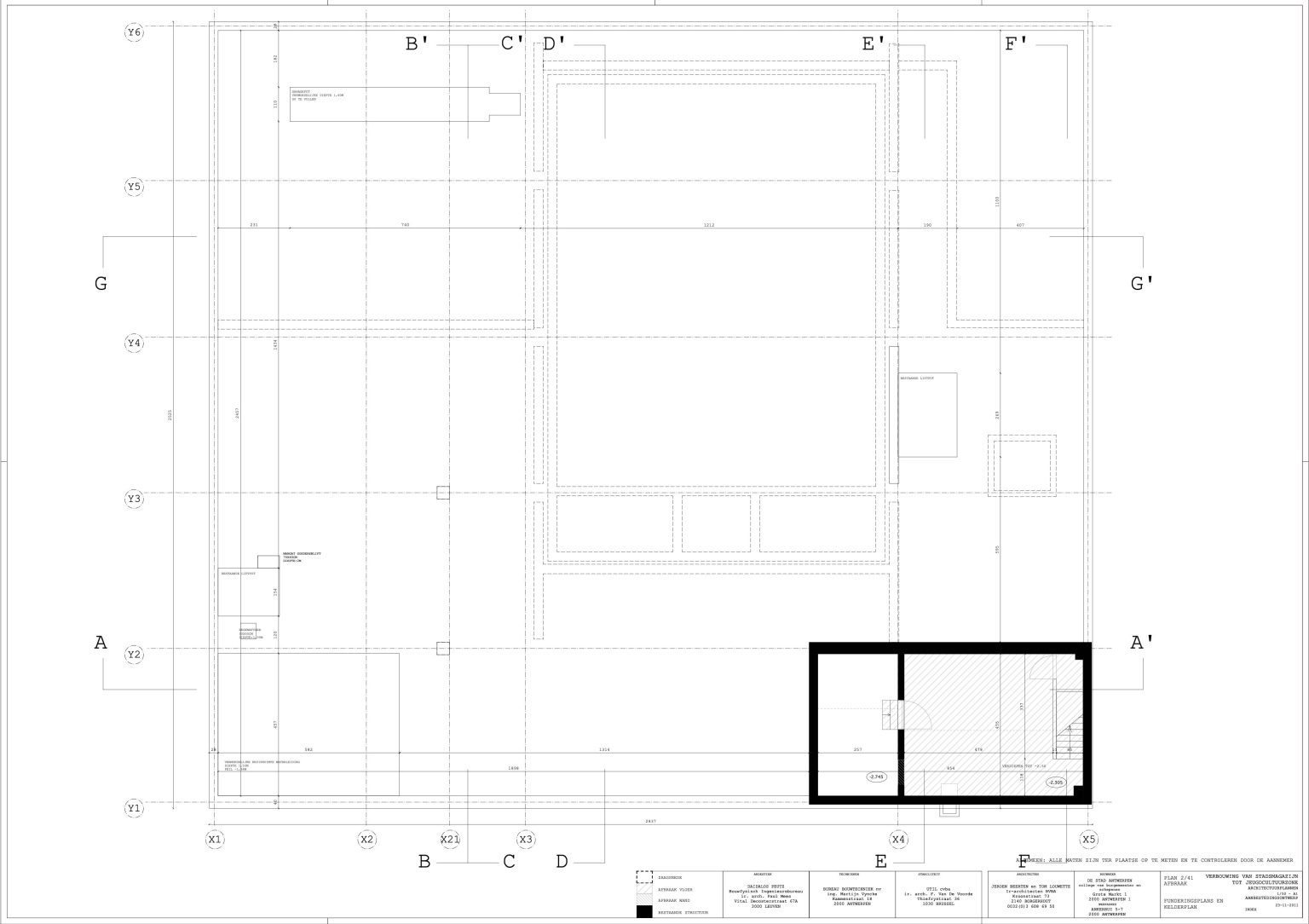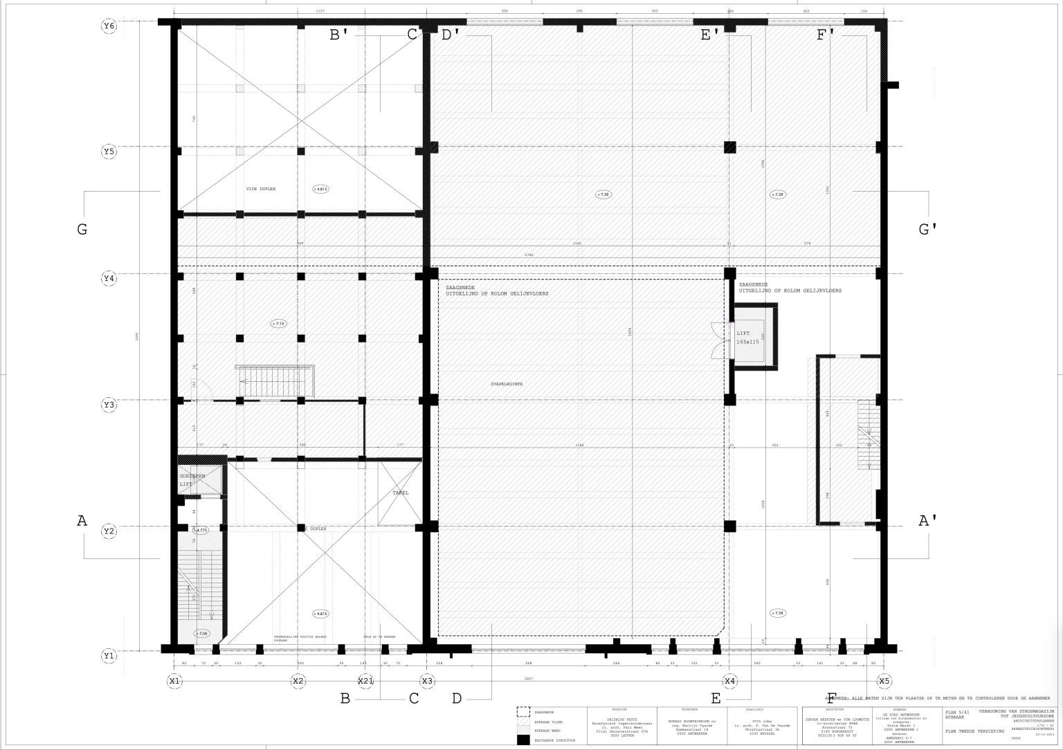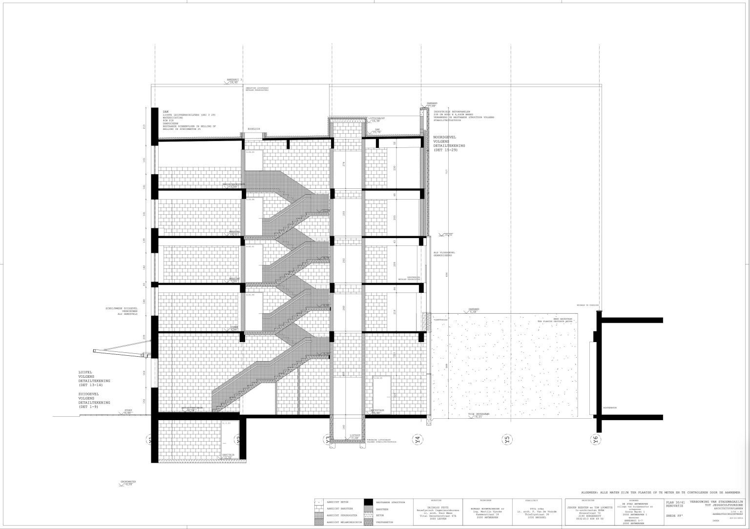 The new programme consists of three major parts: music, theater and visual arts. Each part requires a specific space with its own character: a concert hall (200p), a theatre (80p) and a multipurpose room. The youth culture centre will have a new central entrance with a canopy. A gap, a “canyon” cuts through the building from the street to the garden. At its end an open staircase, footbridges, technical stuff and a hoist animate this vertical public space. All audience levels, including the new café, the “popular kitchen”, a duplex exhibition space and the three large halls are directly and visually interconnected through this main staircase. Because of the high acoustics norms, the concert hall is built according to the box-in-box principle. The theatre is located on the third floor and has a potato-shaped window overlooking the Willem Dock. The multipurpose room is situated in between: a bright space with large glass surfaces. Because of the low budget, the structural work will remain visible. No additional finishing touch!