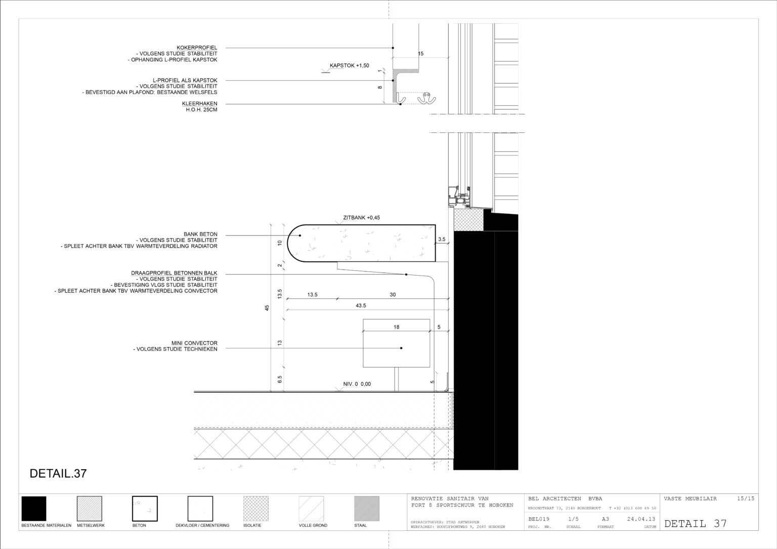 The Sports Barn in Hoboken is housed in a former army hangar at Fort VIII — a striking 100-meter-long hall with magnificent wooden roof trusses. Inside, six basketball courts are lined up in sequence, while the front three bays accommodate the entrance hall, sanitary facilities, changing rooms, and storage spaces on the ground floor, with a lively cafeteria overlooking the courts from above. A compact stand completes the setup, making the venue suitable for competitions.