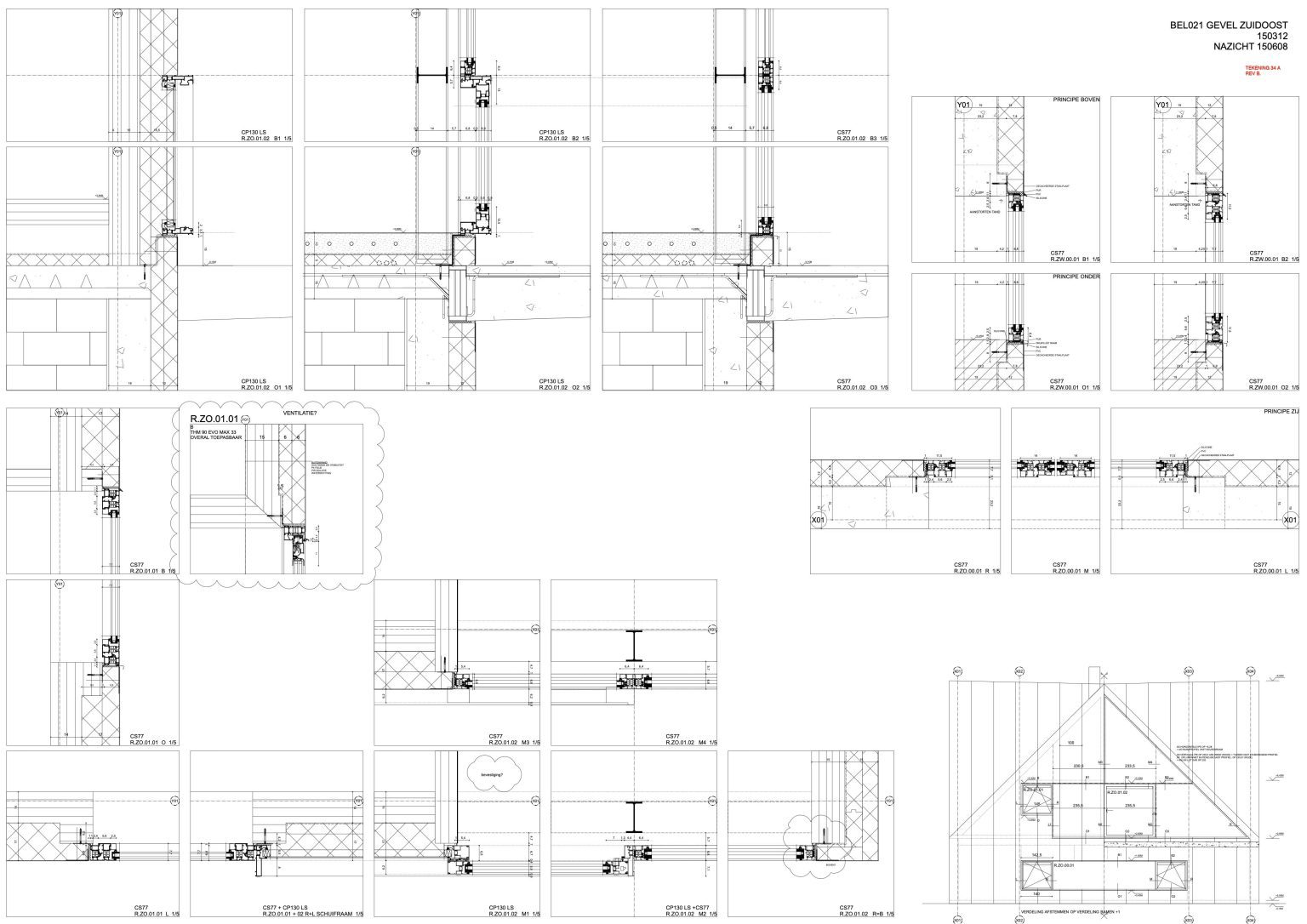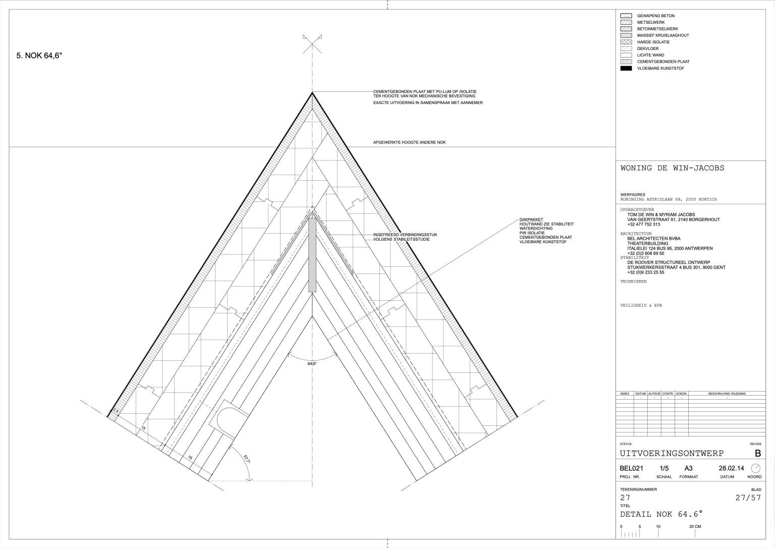 The unconventional layout is immediately clear. The ground floor – effectively a plinth – houses the bedrooms, bathroom, and toilet. The main living spaces are located on the upper level. This arrangement is also reflected in the building’s two-part structure, partially concealed by a uniform blue PVC cladding that wraps both walls and roof. The base is made of brickwork; the roof structure consists of solid laminated timber panels: an enormous, cross-shaped wigwam.