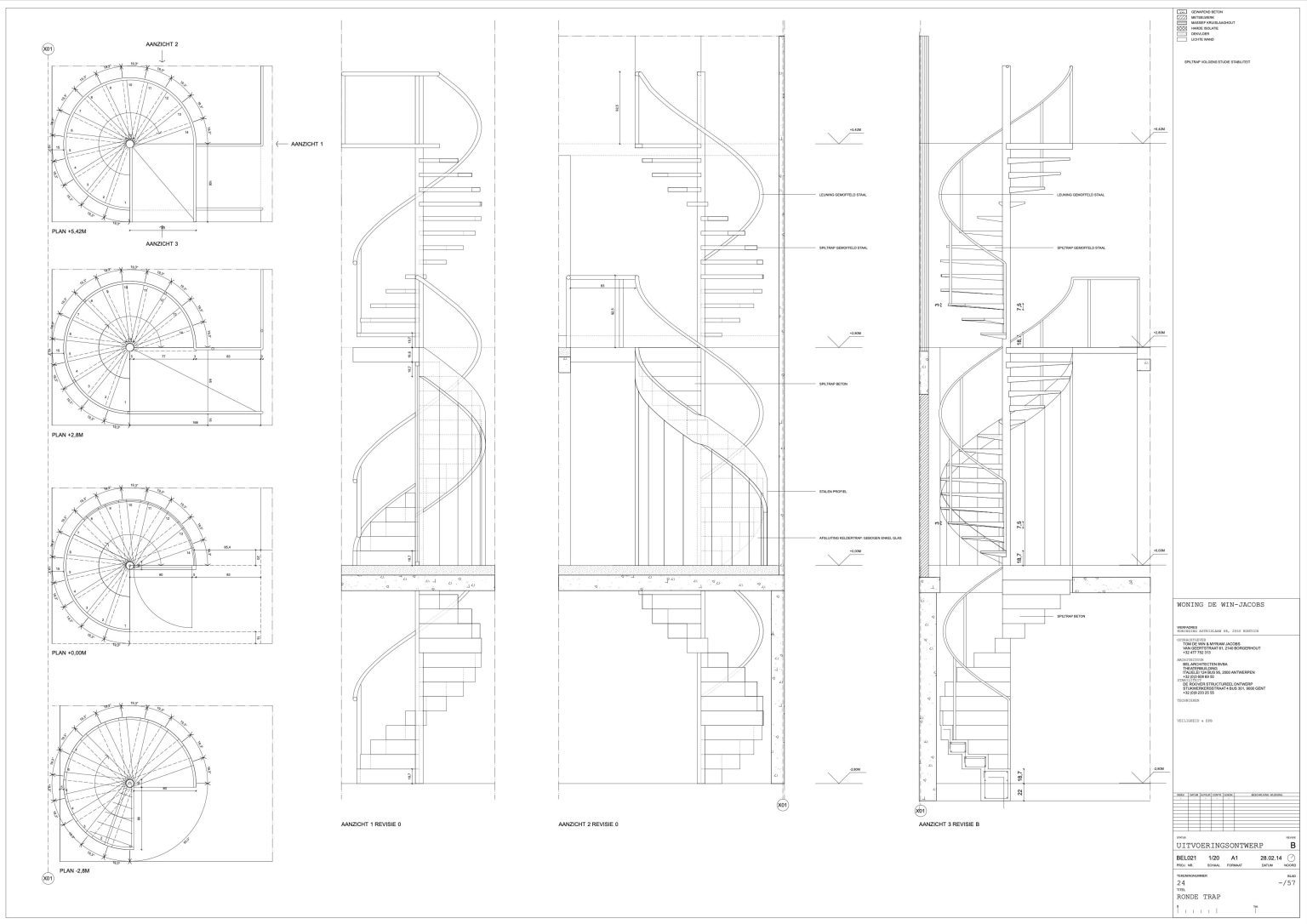 Entering the house delivers a second jolt. The architects waste no time on subtle transitions: the eye is immediately drawn upward, all the way to the roof ridge. Light filters in from unexpected angles. The dynamic in the narrow entrance zone is heightened by an elegant steel spiral staircase, shooting upward like a whirlwind. A second, invitingly shallow but narrow staircase follows a mirrored cabinet wall up to the central living space. Just one meter beyond the front door, this house is already intriguingly rich.