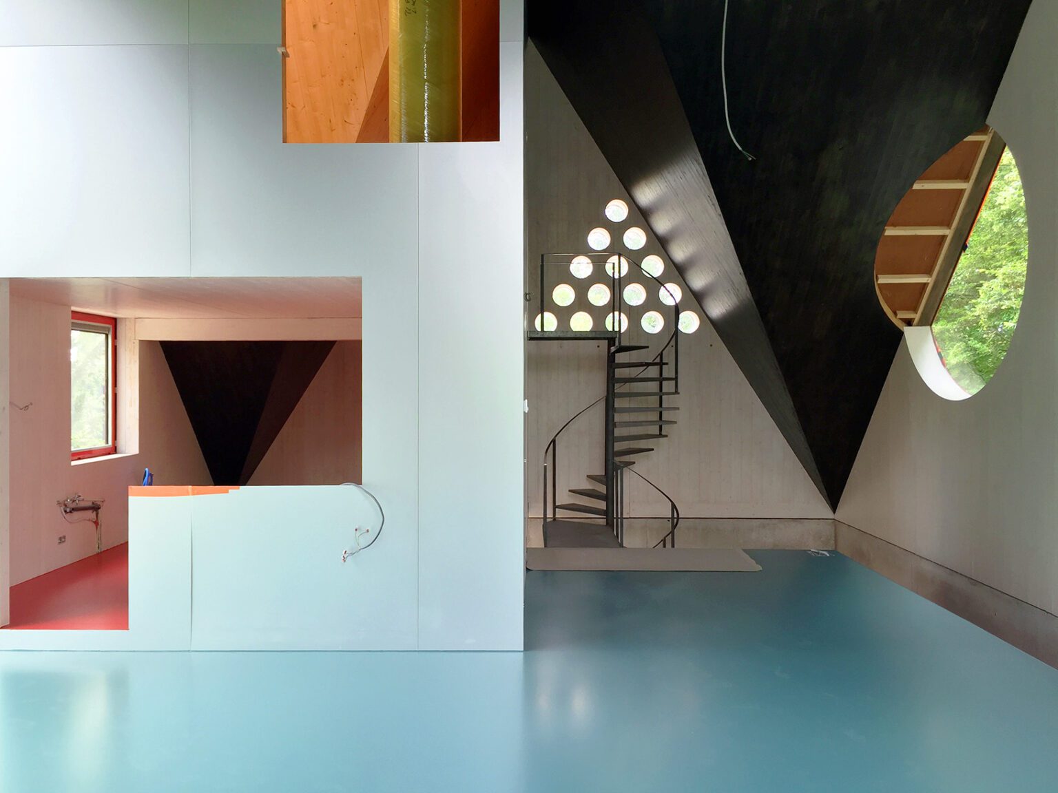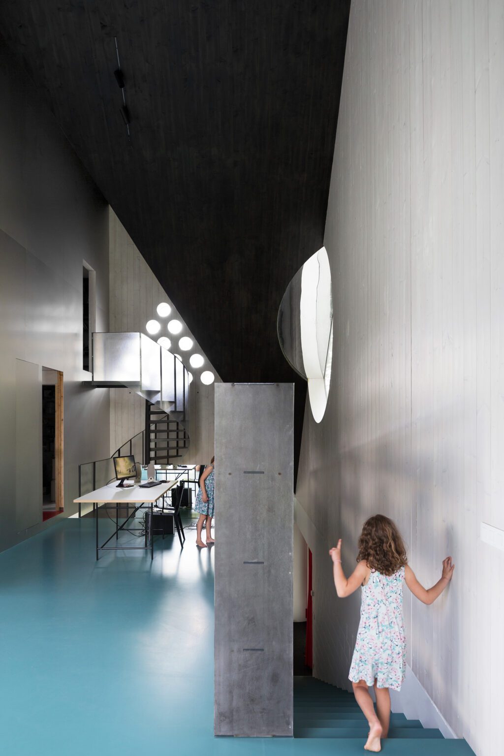 The wealth of spatial experiences this house offers is hard to capture in a few photos. The central living space is dominated by heavy, black-stained sloping roof planes that rest on the corners of the base, interspersed with white-painted (occasionally perforated) walls or generous windows. The living area spans the entire first floor, a quarter of which is taken up by a tower-like volume clad in aluminium, housing the kitchen and a second toilet. Above the kitchen, accessible only via the dizzying spiral staircase, is a TV and lounge room that can also serve as a guest space. From this elevated perch, you overlook the living area and through the windows beyond to the outside world.