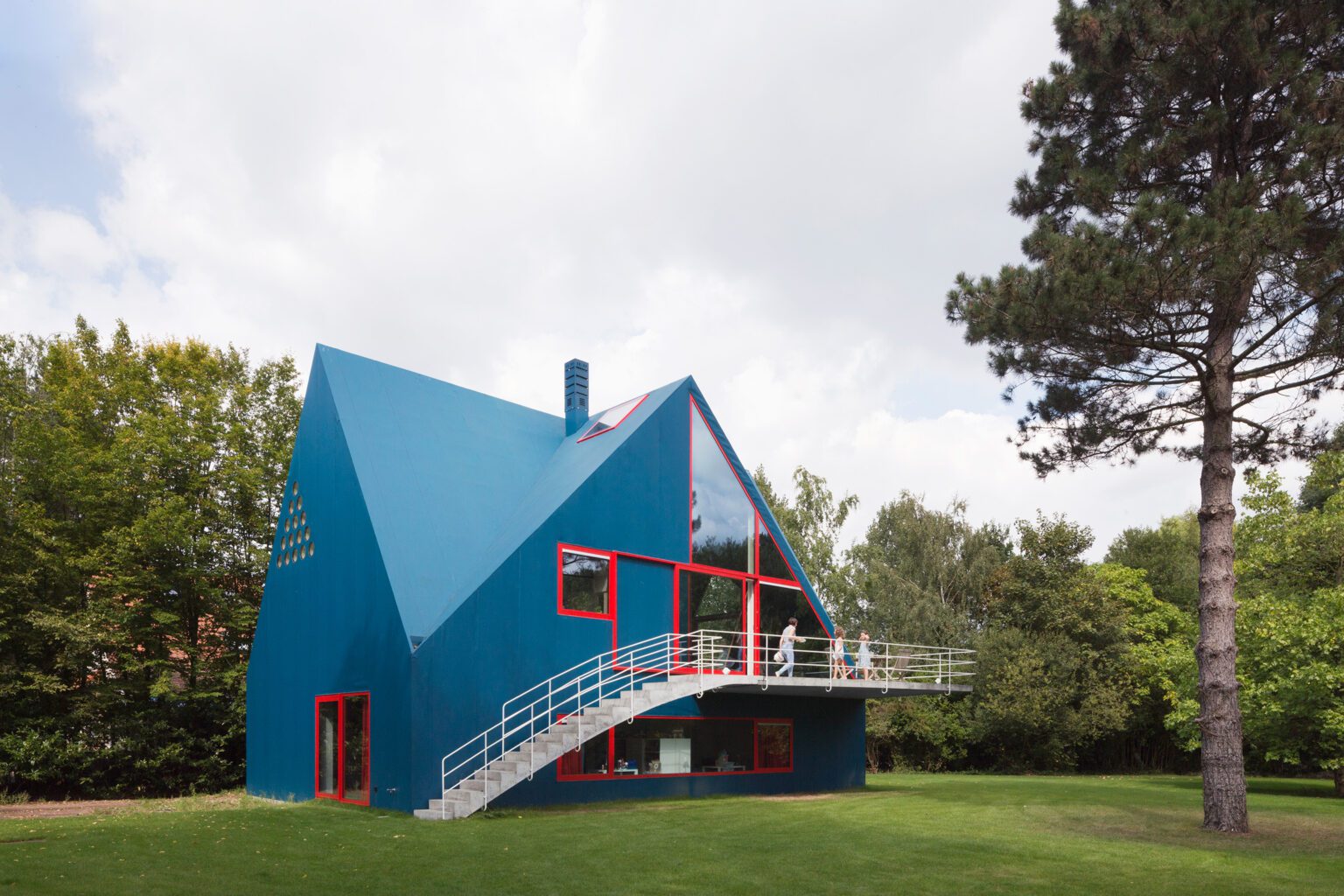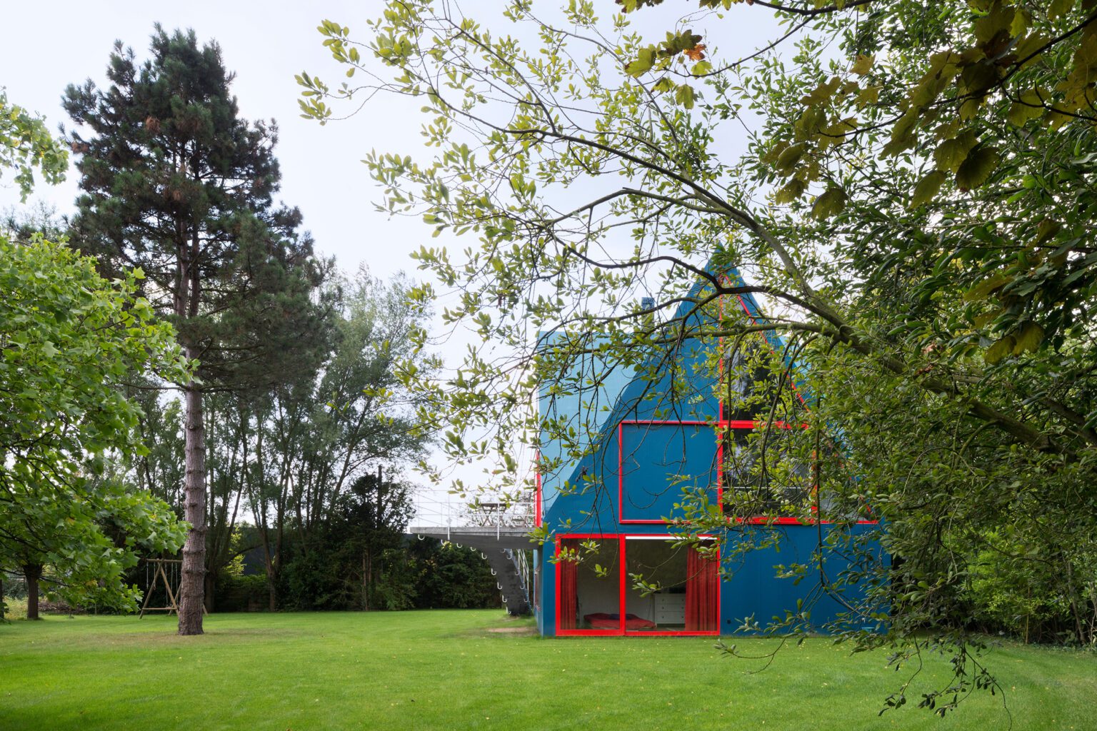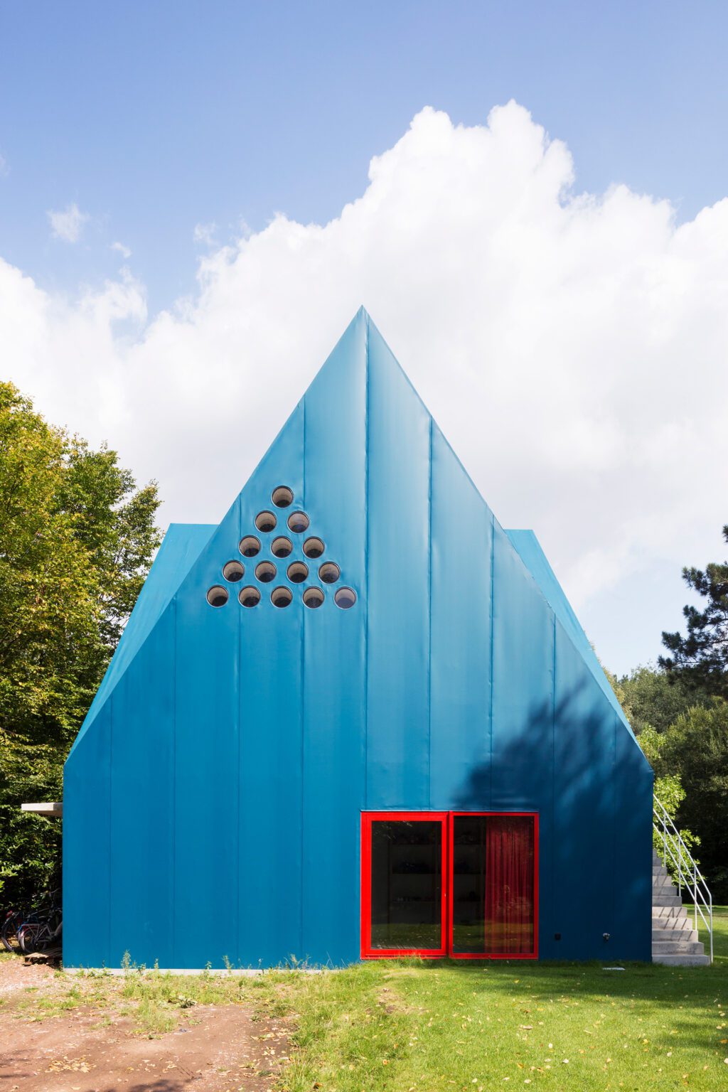 A short, paved road leads past two brick houses hidden behind thick hedges. At a wooden barrier, the last trace of inhabited world ends, and the former farm path winds deeper into the meadows. Suddenly, the eye catches something unusual: a sharp, bright-blue volume that appears to have landed smack in the middle of the pristine field. Like a frontal assault on the senses, the home of a young family stands here in cheerful multicolour.
