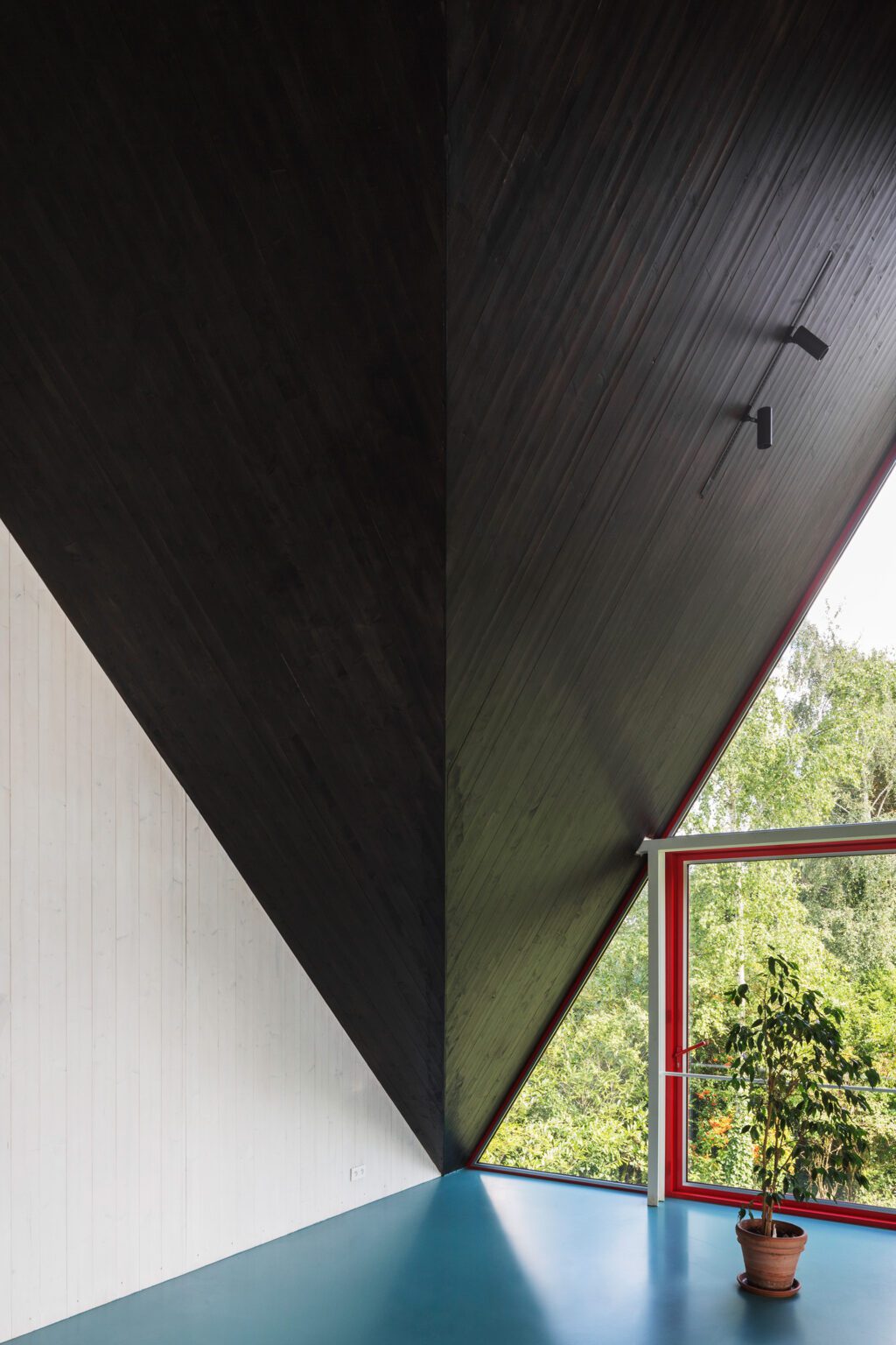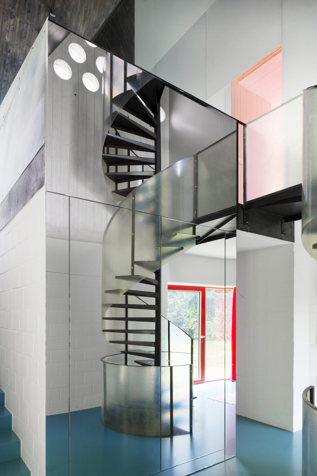 The colours of the exterior return inside: the red of the exterior frames reappears in the kitchen floors and countertops, the blue (in a softer shade) in the poured floors and bathroom tiles—a magical bath chapel tucked beneath the gentle stairway to the living room, catching sunlight from a tilted skylight that juts from the façade.