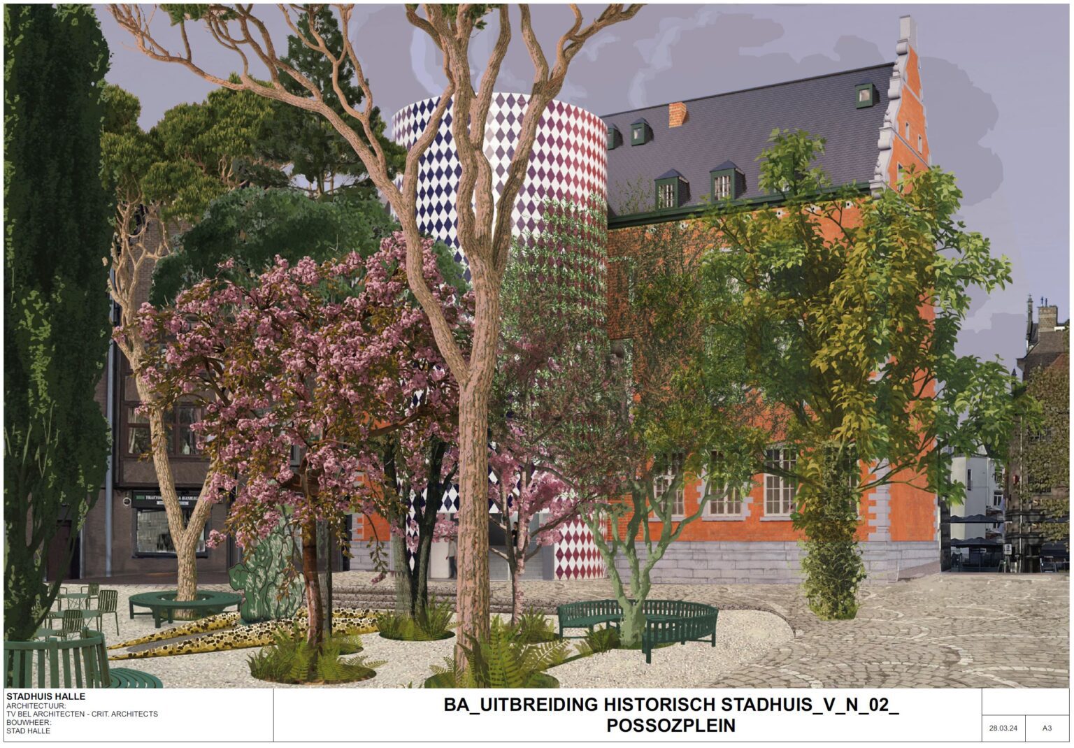 To improve accessibility while preserving the historic fabric, a compact cylindrical extension is proposed on the Possozplein side: