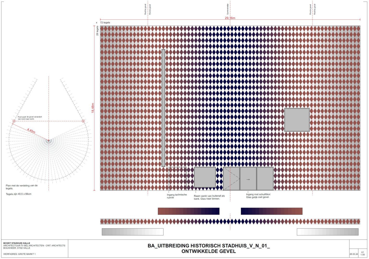 Abstract graphic pattern of blue-and-white enamel tiles, referencing the Halle flag, gradually transitioning to orange-red to harmonize with the existing brickwork;