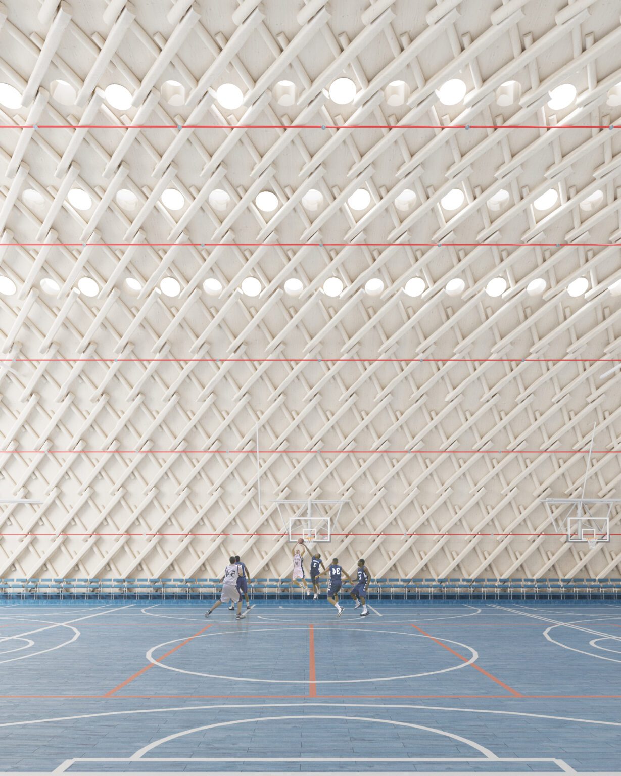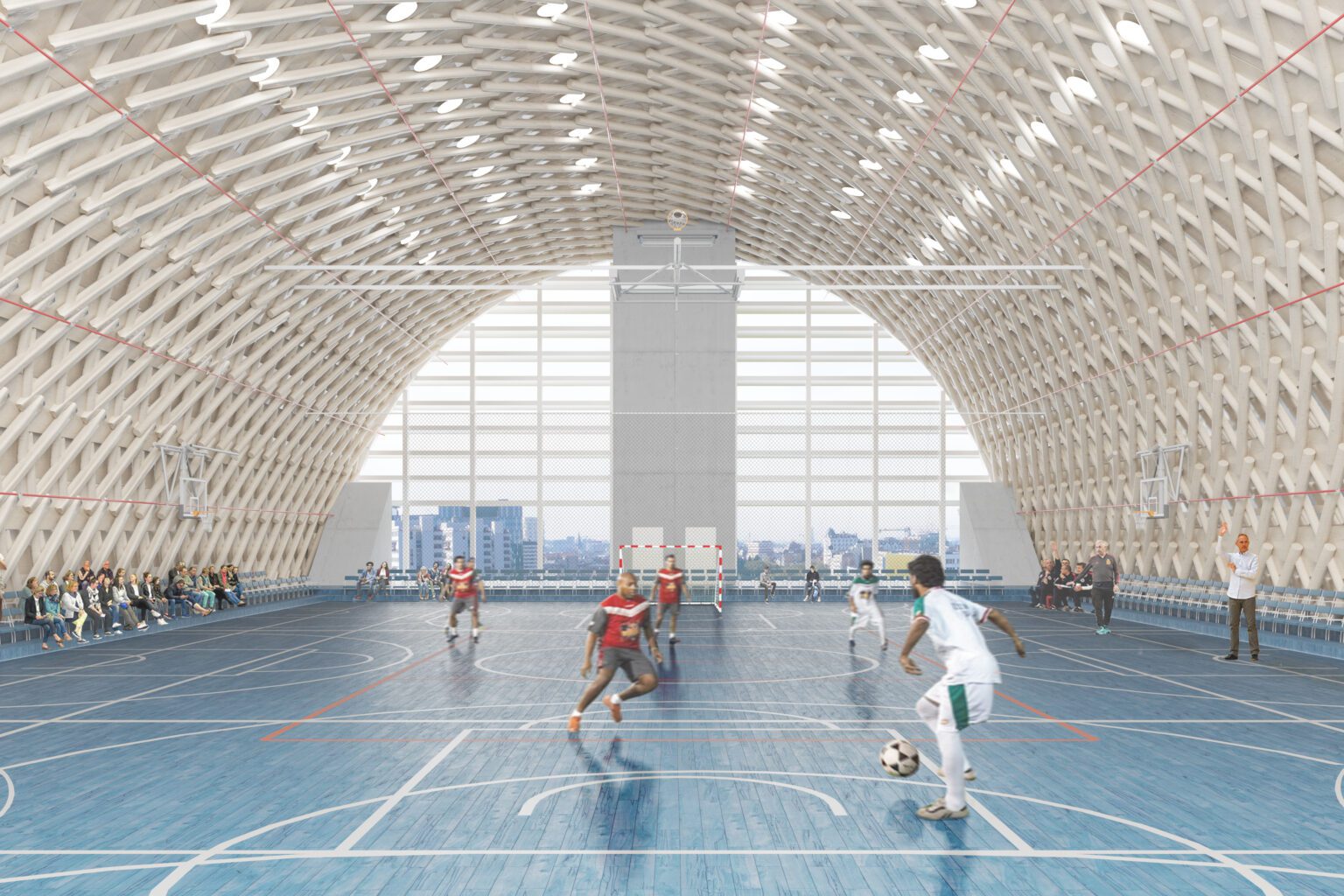 The sports hall crowns the building on the fifth floor, stretching almost 30 meters wide and rising to an impressive 21 meters high, offering sweeping views across the landscape.