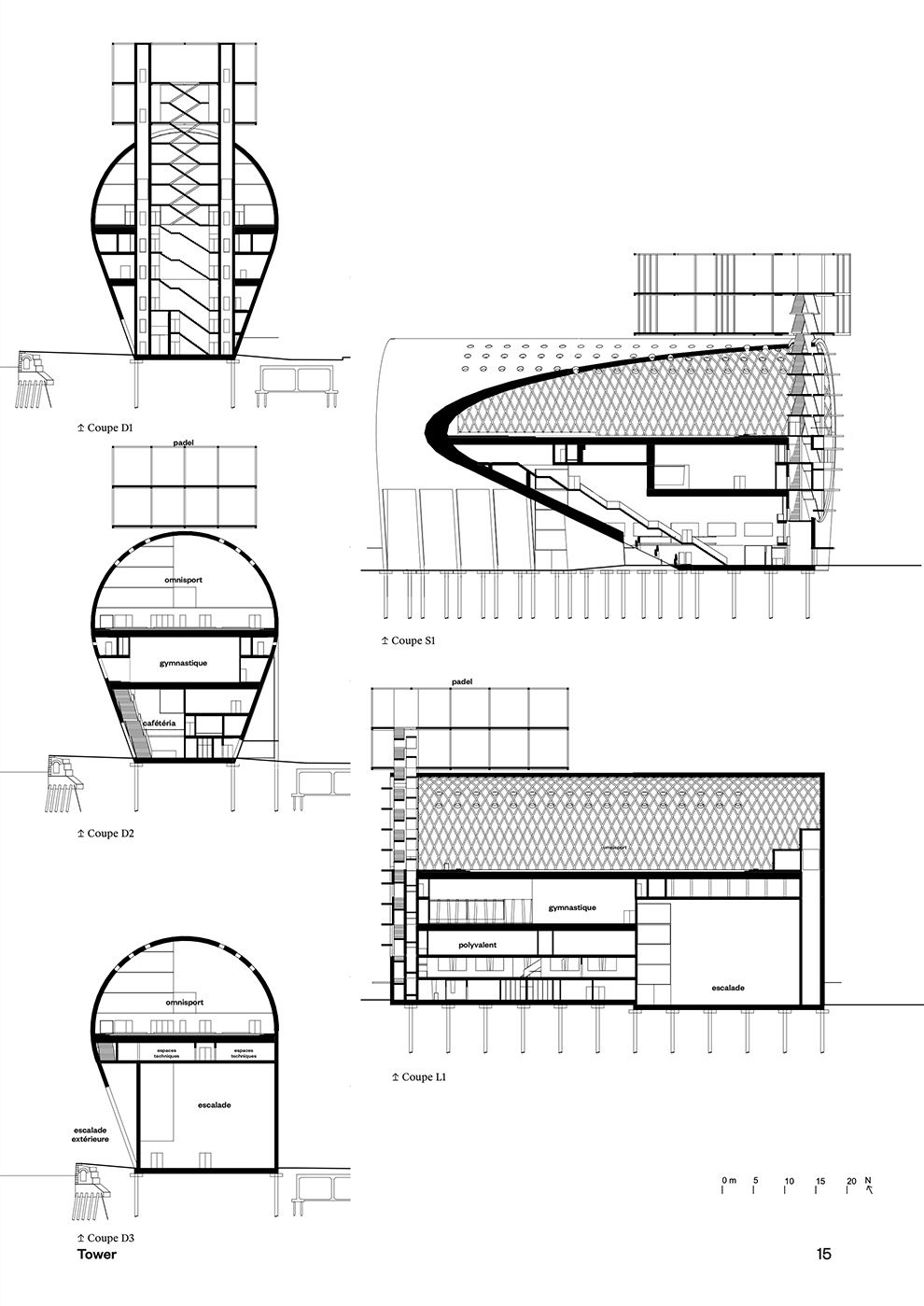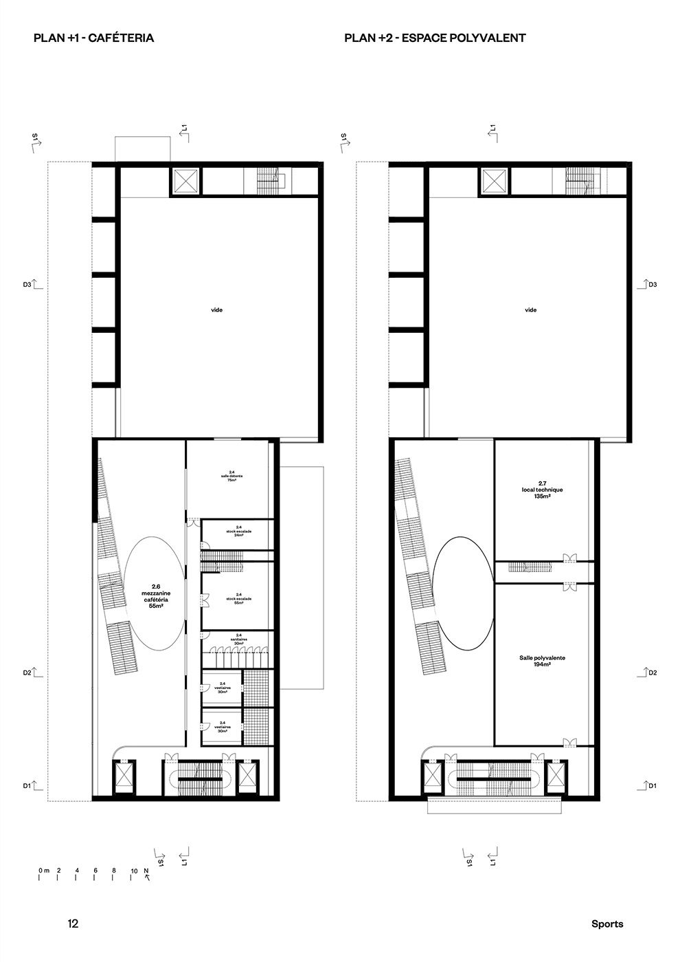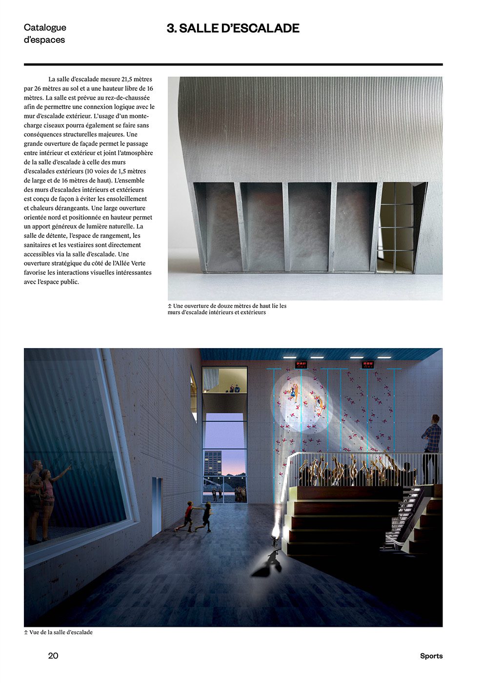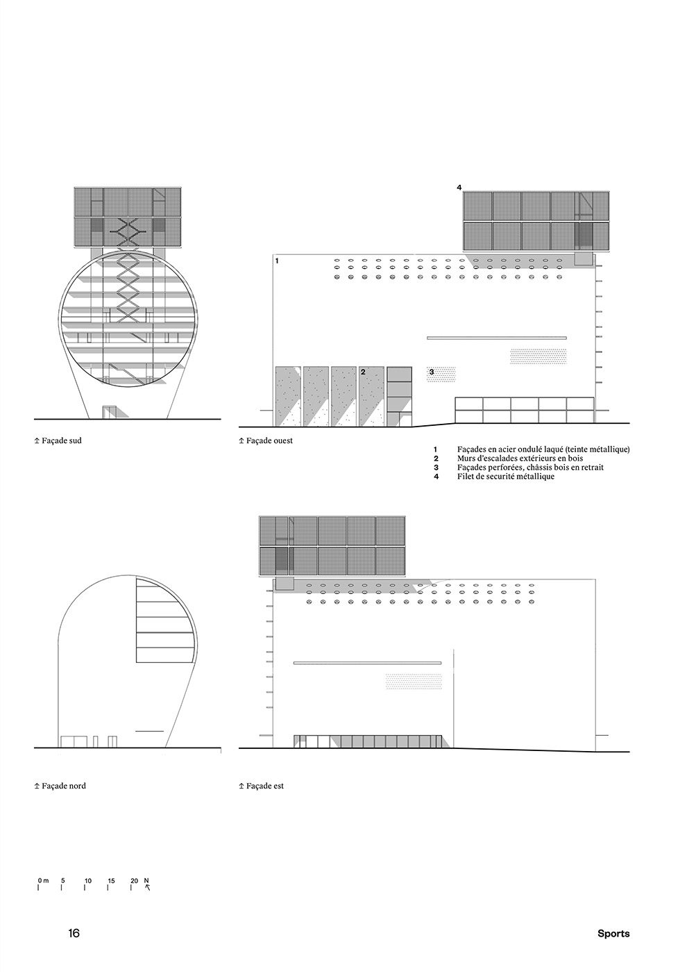 Below, the building is organized into two main zones. To the north, a dramatic climbing hall extends vertically through the lower levels, with technical and logistical facilities at the base. To the south, a more intricate layering of spaces accommodates changing rooms, storage, and other supporting functions. A duplex on the third and fourth floors houses the gym and changing rooms, conveniently positioned between the gym and the main sports hall for smooth and efficient circulation.