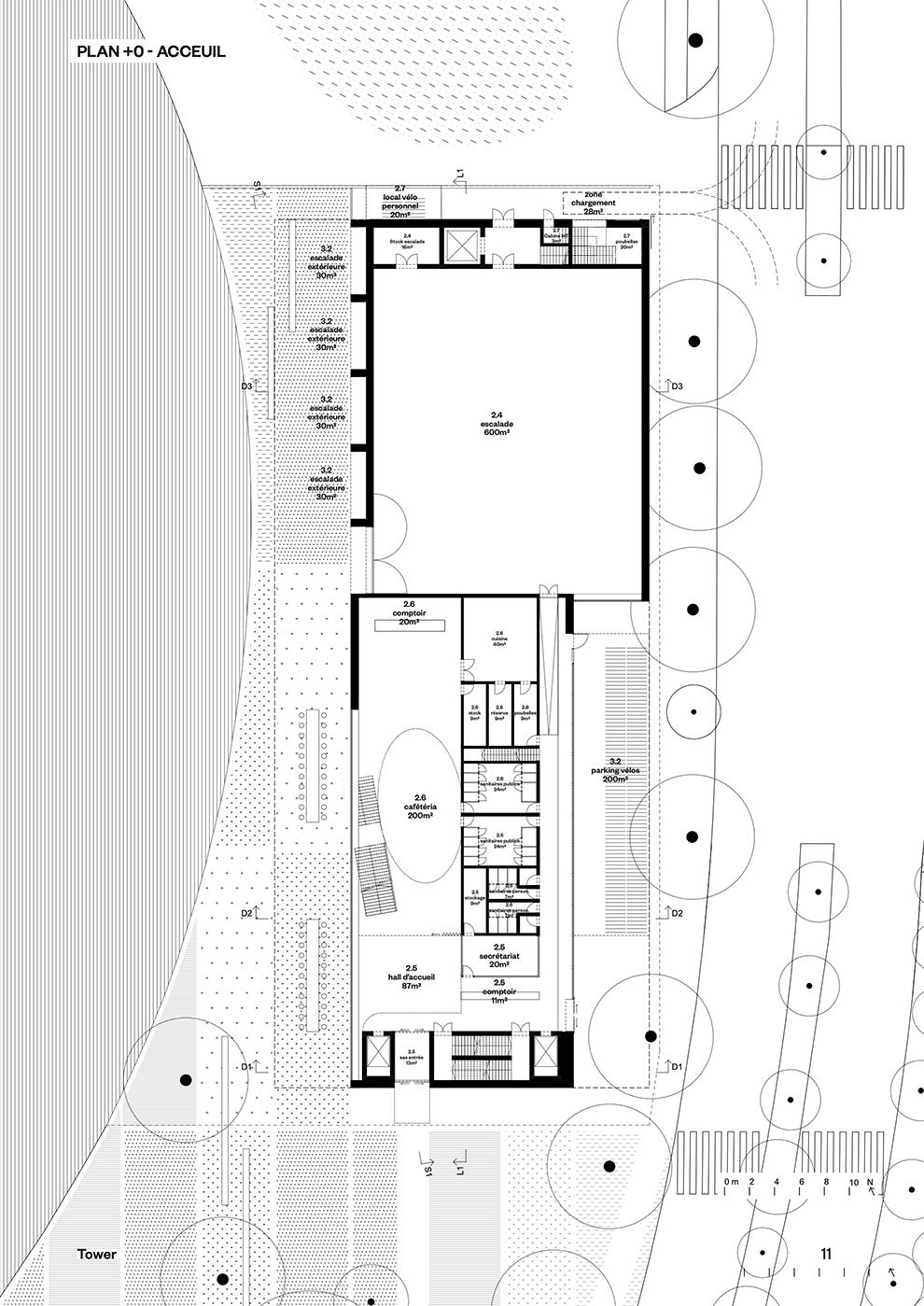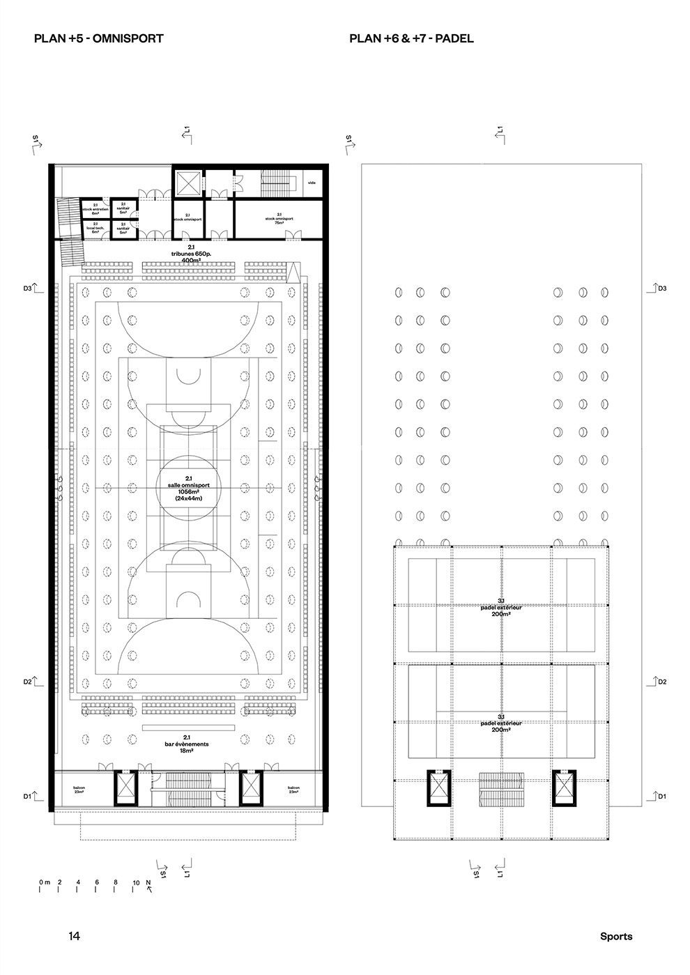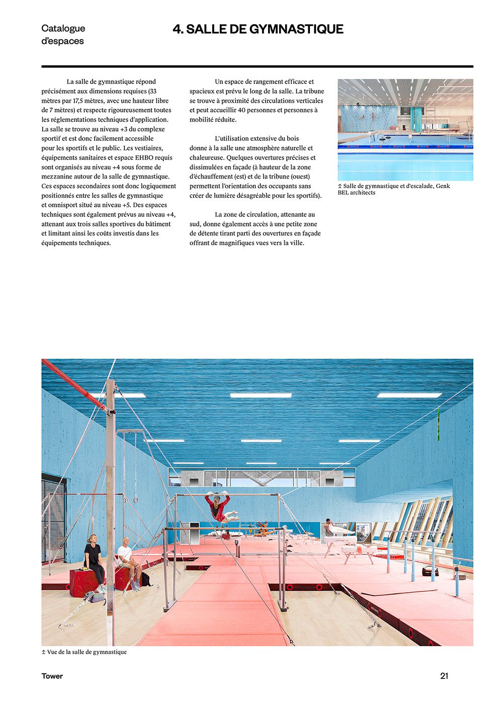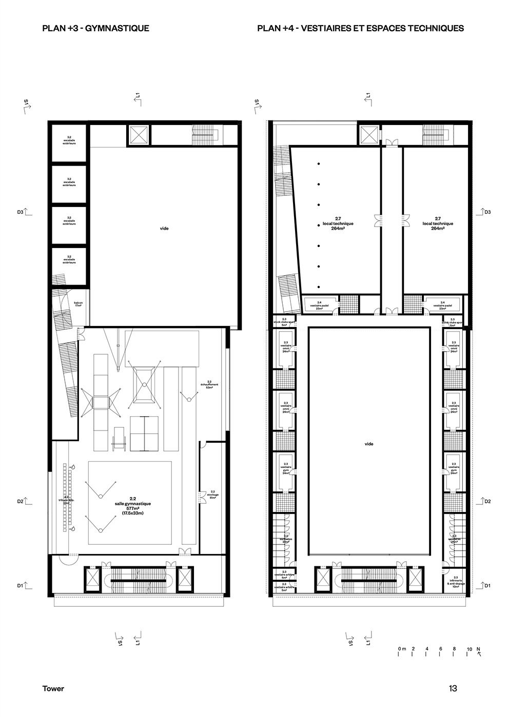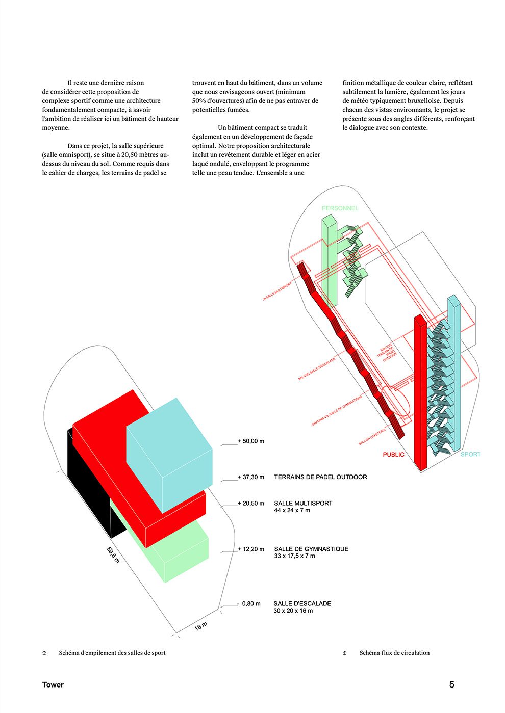Below, the building is organized into two main zones. To the north, a dramatic climbing hall extends vertically through the lower levels, with technical and logistical facilities at the base. To the south, a more intricate layering of spaces accommodates changing rooms, storage, and other supporting functions. A duplex on the third and fourth floors houses the gym and changing rooms, conveniently positioned between the gym and the main sports hall for smooth and efficient circulation.