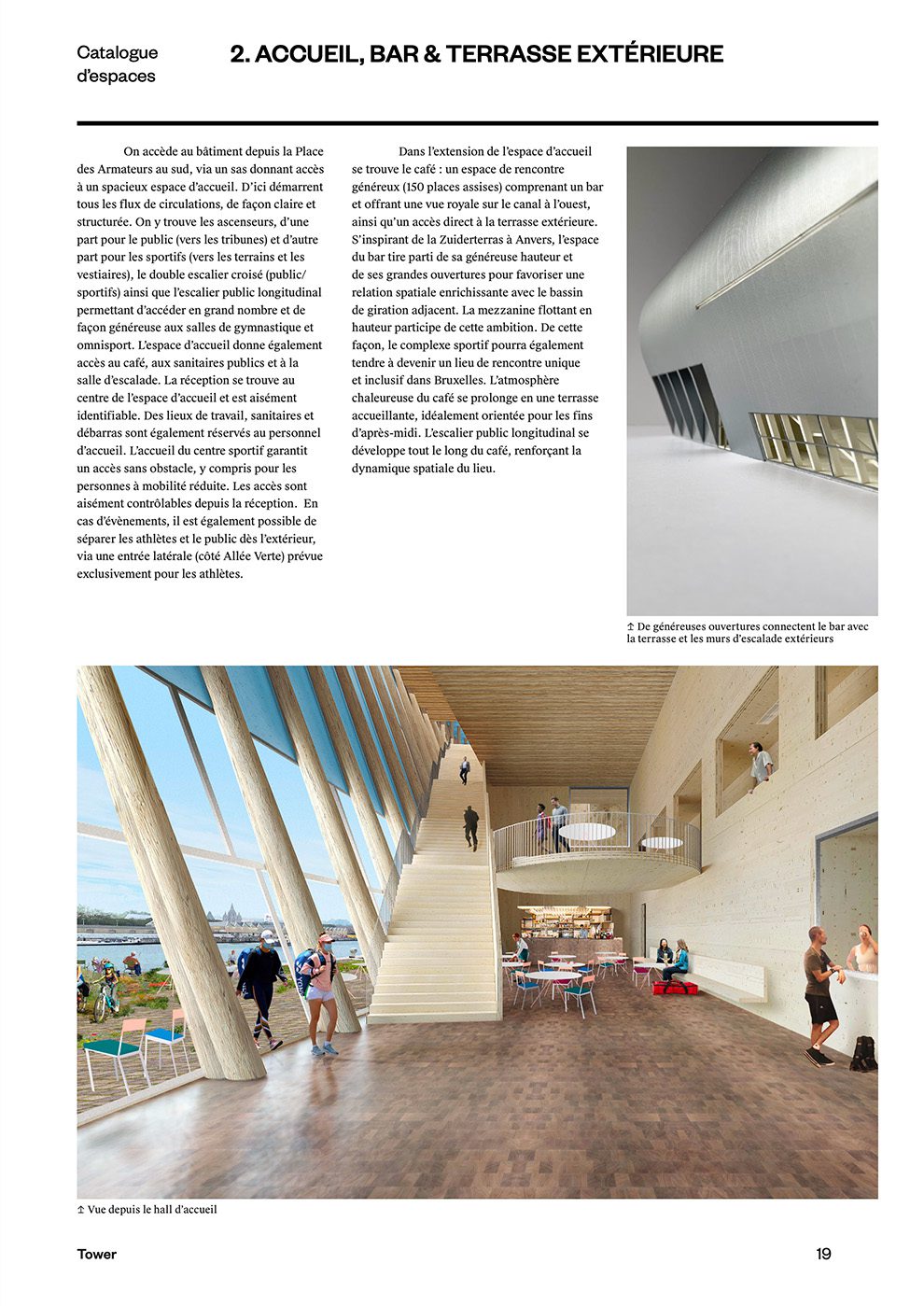Sustainability and circularity are at the heart of the design. From the outset, the load-bearing structure was conceived in timber sourced from the Sonian Forest. As the project evolved, concrete elements were introduced to balance cost and durability. On the fifth floor, however, the roof of the sports hall remains a striking timber vault built using the traditional Zollinger technique: a diamond-shaped grid of wooden beams that saves material, enhances efficiency, and lends the space a warm, inviting character.