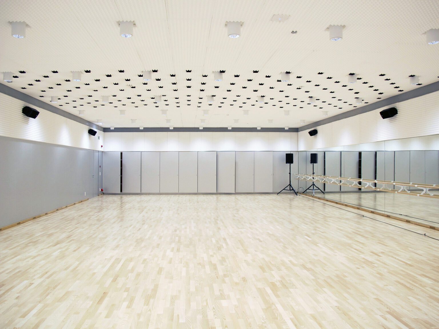 The existing fitness room was repurposed as a dance hall: an acoustically enclosed space where the decibels can freely flow through the speakers. As daylight was not feasible in this area, we opted for the lightest possible interior finish.
