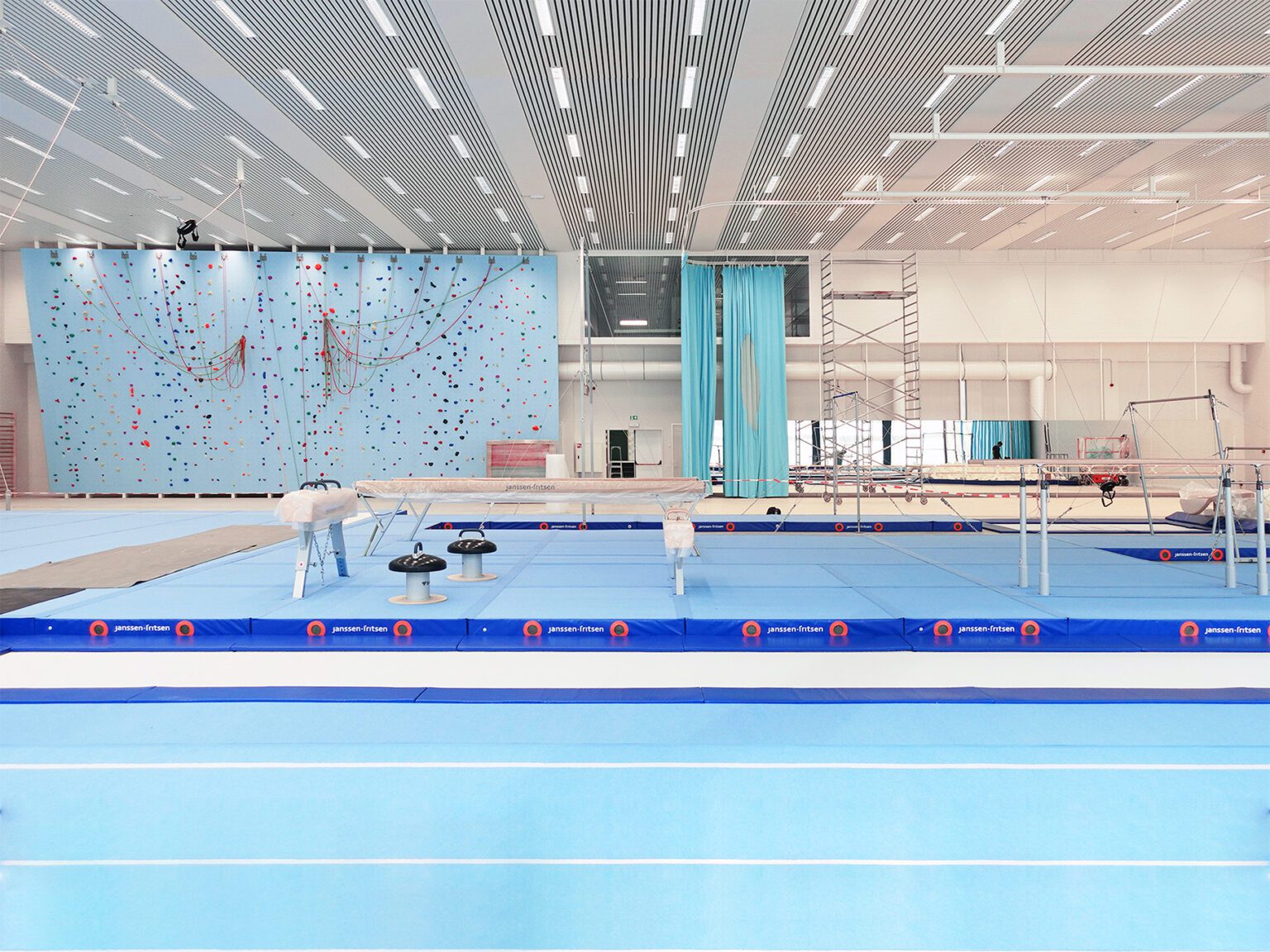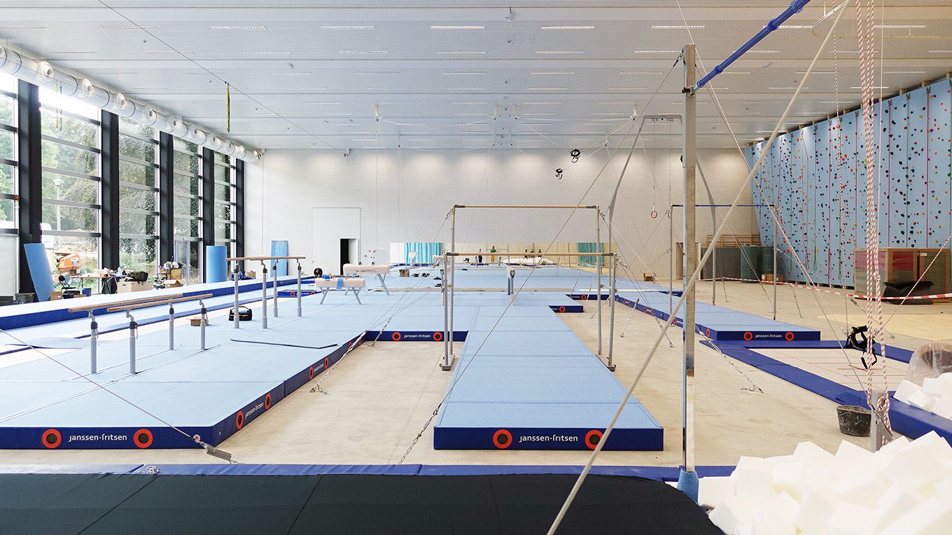 We transformed the sports hall into a gymnastics hall with fixed apparatus installations: 2-point, 4-point and cable lunges, men’s and women’s parallel bars, a rings setup, pommel horses, and corresponding run-up zones and built-in landing pits. For floor exercises, a competition floor with mirror wall and ballet barre was provided. Opposite the fully glazed eastern façade, we created a warm-up zone with parquet flooring and mirrored wall, which can be closed off by a ceiling-high light-blue curtain. Additionally, we installed a 7-metre-high climbing wall for further warm-up or play opportunities. All technical systems were renewed, the joinery replaced, and integrated sun shading was added.
