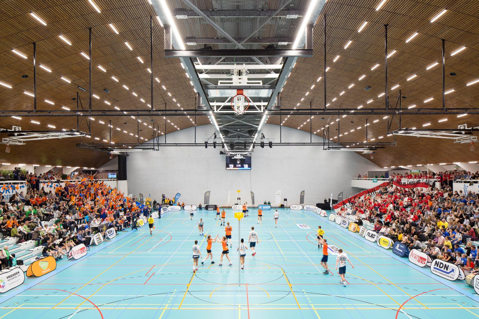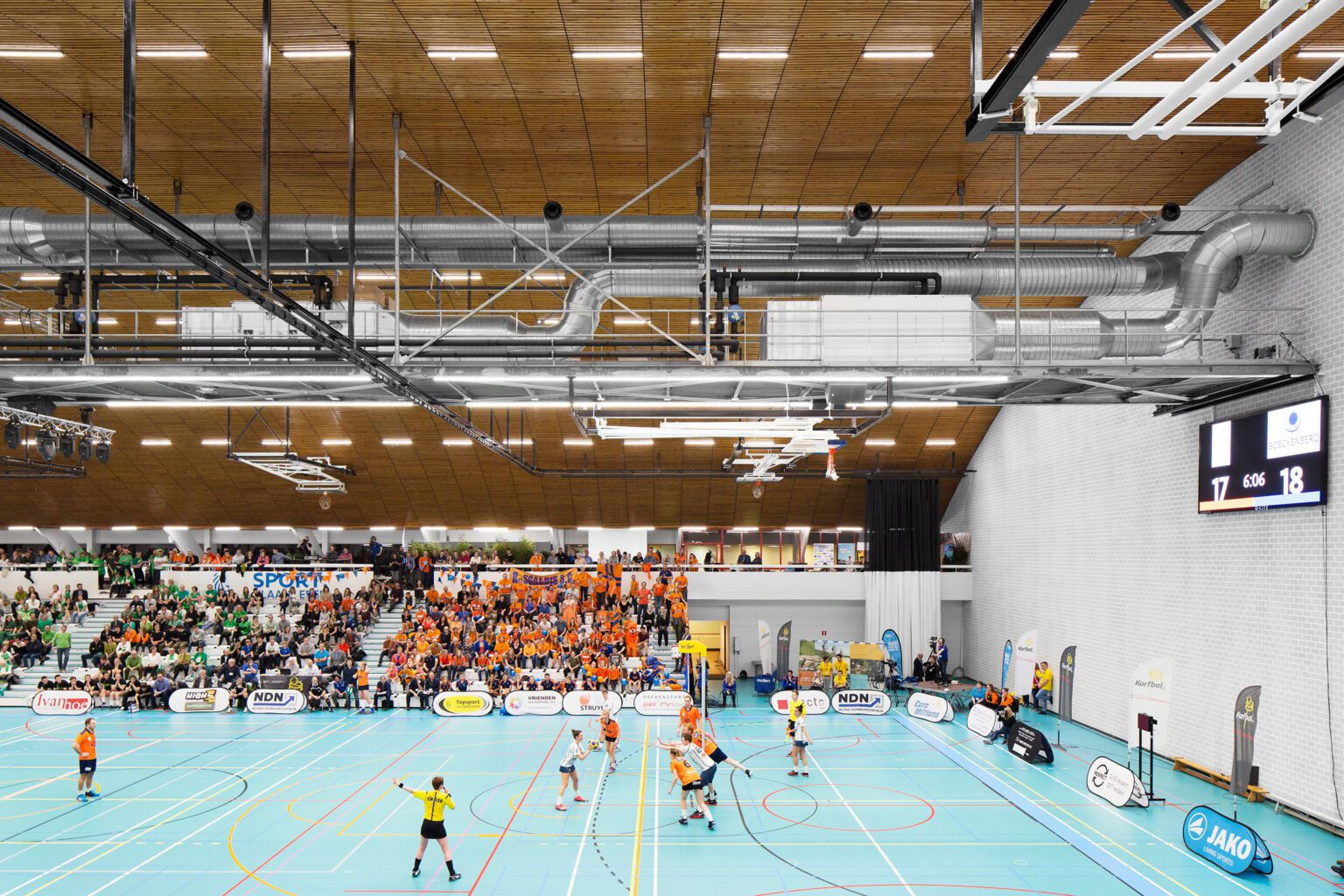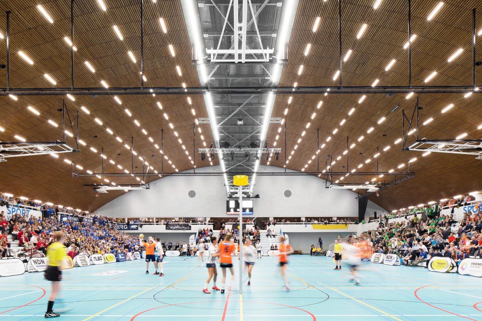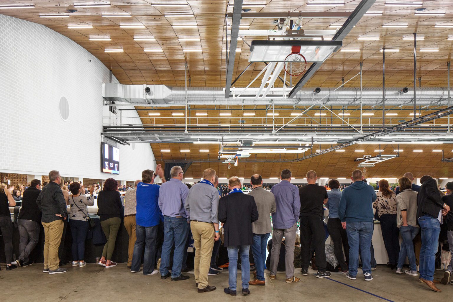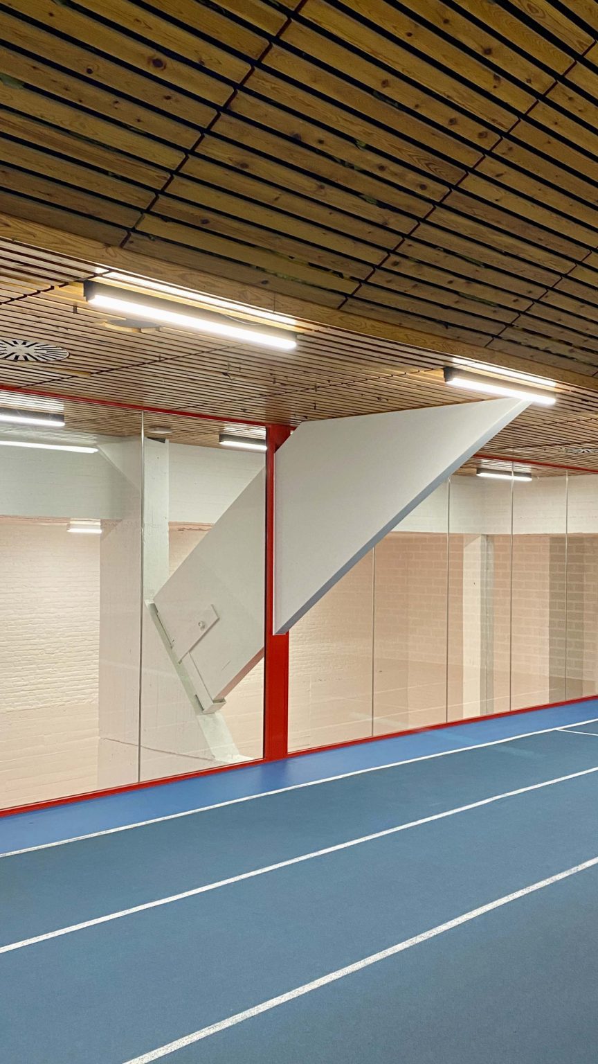 Our base proposal includes the required updates for the main sports hall: refurbishing the gallery, adding new emergency exits, and renewing the acoustic wall, sports flooring, and stands. Our aim is to restore the hall to its former glory by reviving the original spatial experience — a vast playing field spanned by a soaring parabolic roof. The later-added ceiling grid will be removed, and technical installations will be visibly suspended from the roof. The ceiling will be refreshed to enhance the hall’s grandeur and improve the distribution of light. The result: a sports arena with true presence, ready to host high-level events in style.