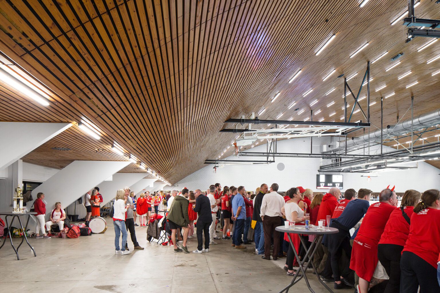 Set in the heart of the beautiful forested Nete Valley, the complex is home to a wide range of top-level sports facilities: the main sports hall, the national squash centre, an athletics track, multiple outdoor fields, and an ice hockey rink. The architectural strength of the complex lies in its clear organizational structure and in the impressive main hall, covered by a parabolic roof. On the exterior, the sports hall is clad with a white waterproofing layer, giving the building a light and distinctive appearance. Despite the patchwork of renovations, the building retains undeniable spatial qualities and a solid structural framework.