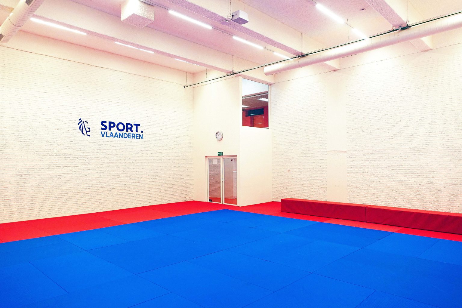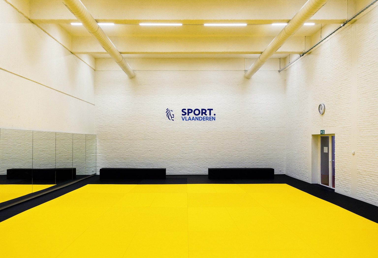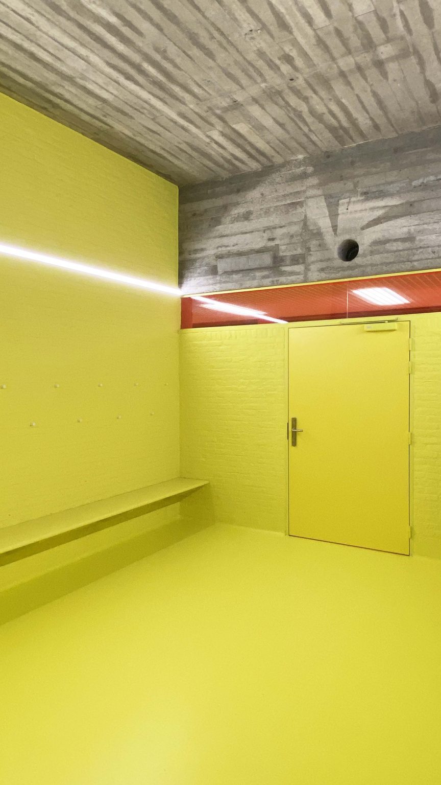 At the changing-room level, we propose a complete renovation of the locker rooms, player corridor, fitness area, and martial arts halls. All spaces will receive new flooring and ceilings, new sanitary facilities, and updated technical installations, with user comfort and low maintenance as guiding principles. The locker rooms will be finished with PU coatings, offering the advantages of seamlessness, water resistance, acoustic absorption, shock absorption, and extreme durability. Sanitary installations, including supply and drainage systems, will be replaced to meet current Vlarem II regulations. Built-in furniture will be impact-resistant and provide generous storage for clothing, footwear, and sports equipment. The martial arts halls will be repainted, while the fitness hall will be refreshed with new finishes and a suspended ceiling.
