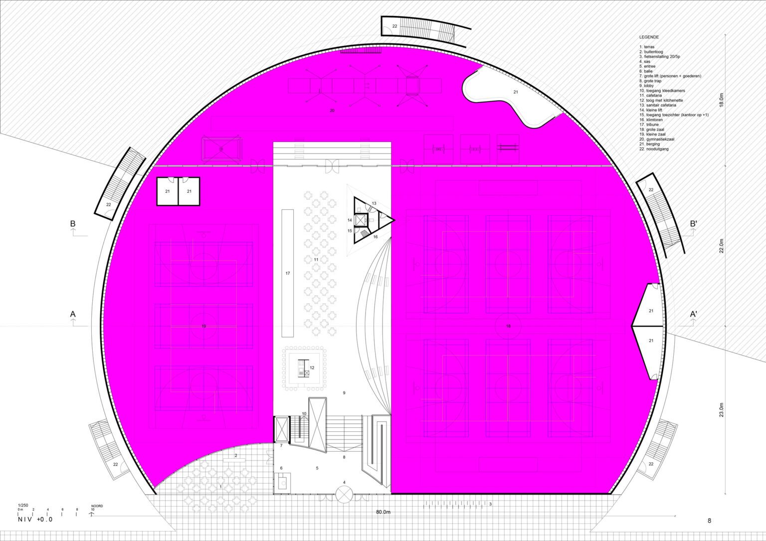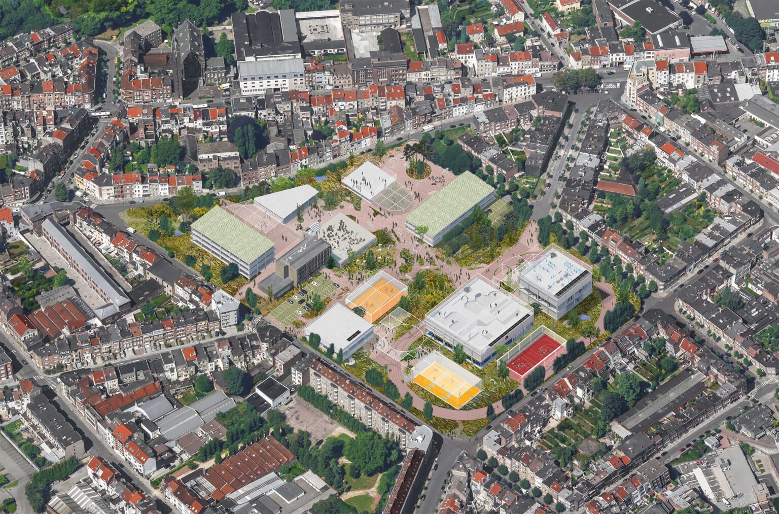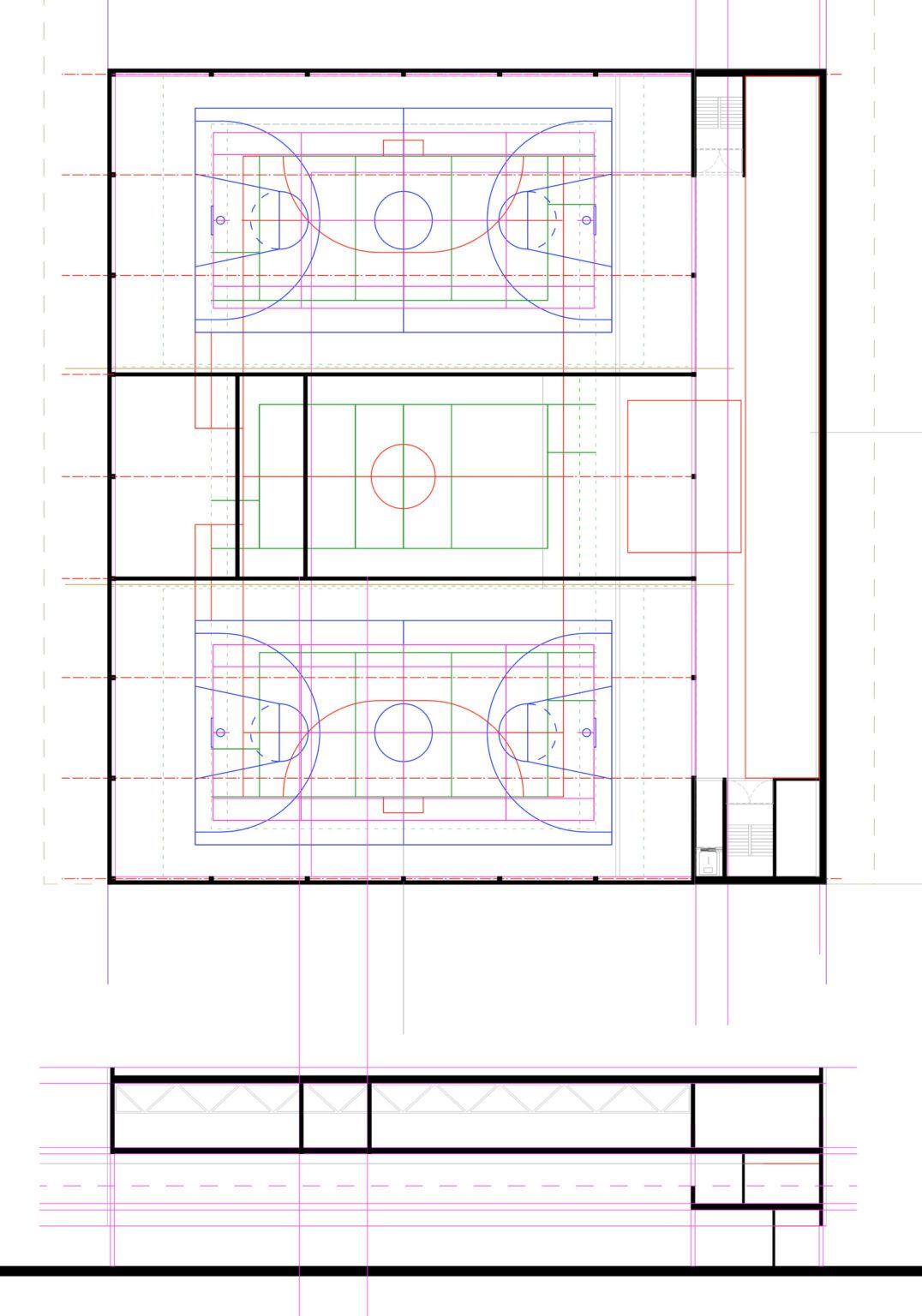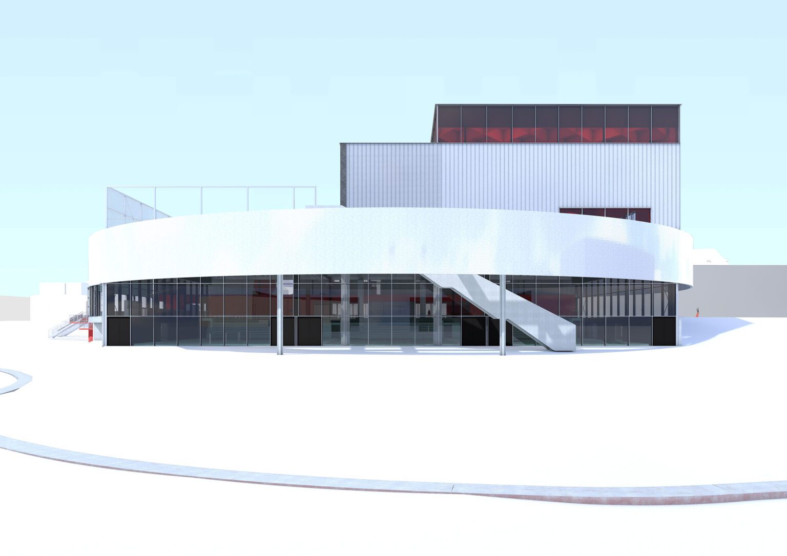 In 2010, BEL won the Open Call, organized by the Flemish Government Architect, for the extension and renovation of the listed modernist sports complex in Genk, designed by Belarusian architect Isia Isgour and engineer André Paduart. The new double sports hall with its iconic vaulted roof and the renovation of the gymnastics hall were completed in 2019. According to Knack Weekend, it is one of the most beautiful sports halls in Belgium. In 2023, the complex was nominated for the Brussels Architecture Prize. Since then, BEL has worked on around thirty sports infrastructure projects of widely varying scale: from simple sports halls to large complexes with multiple arenas and grandstands for a broad public. This also includes special facilities such as dance studios, gymnastics halls, swimming pools, and even an underground ice rink and a velodrome with seating for 2,750 spectators. To date, five sports halls have been built: the double sports hall and the renovated gymnastics hall in Genk, the renovation of the Sport Vlaanderen sports complex in Herentals, the sports and classroom facility on Henleykaai in Ghent, the sports hall with dance studio in Bertem. Today, several ambitious new sports projects are in development: the renovation of the sports complex in Hofstade, the new Zennepark with a stacked sports complex in Halle, the emblematic sports tower on Rederskaai in Brussels.